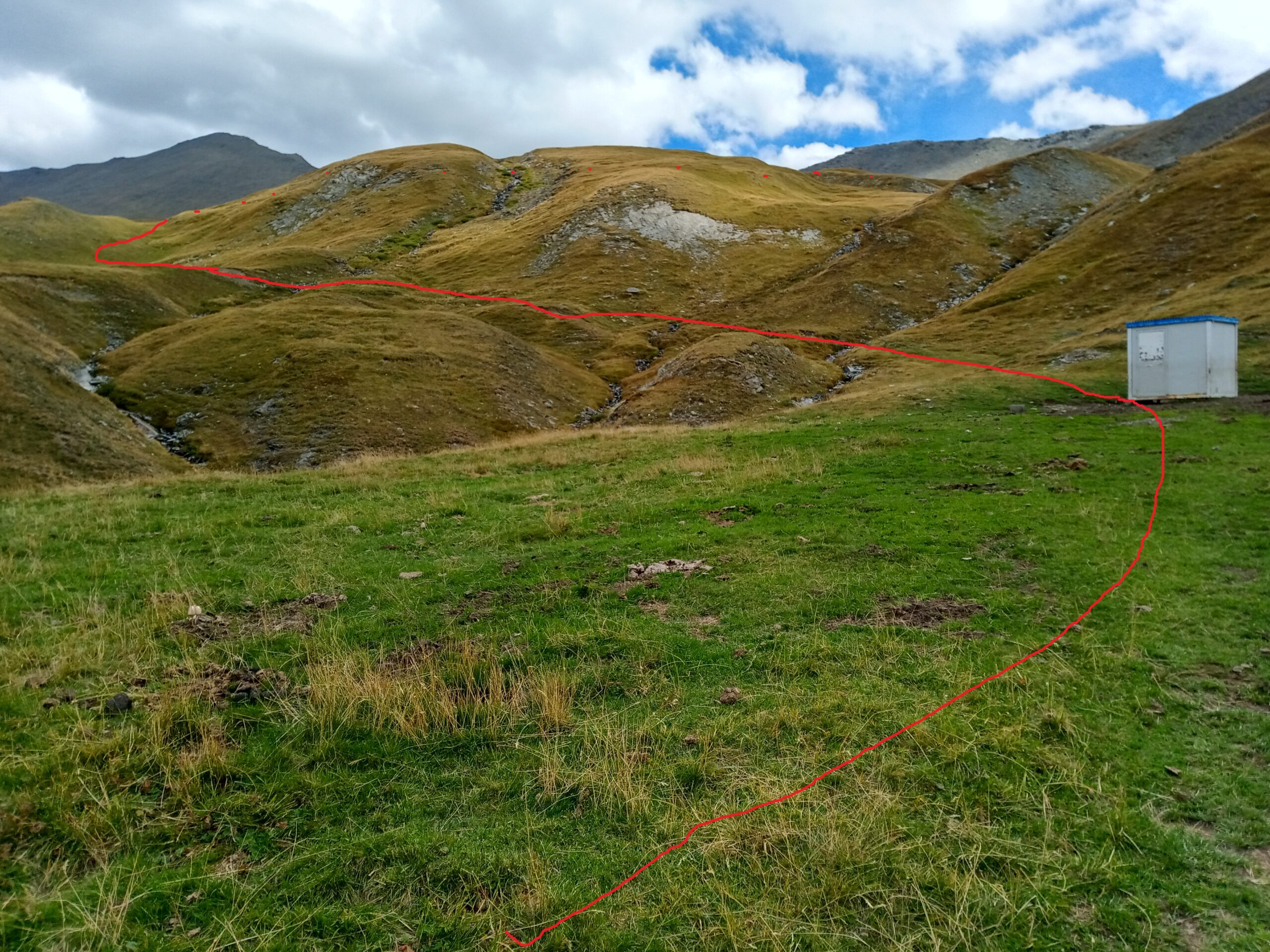 2- Evitare di salire subito prima del ponte, ma continuare a camminare sul sentiero 10 minuti per abbandonarlo quando inizia a salire (palina) e puntare a girare a sx (lasciando sempre il torrente sulla sx (salendo, vedo foto), si ridiscende e sul bel pianoro incredibilmente si trova un traccia che porta in fondo al vallone a un prefabbricato per la “pastorizia) qua dietro per traccia di bestiame evidente di ritorna indietro e si sale attraversando degli impluvi fino ad accedere al piano superiore raccordandosi alla traccia o per puntare al colle della Crousette.