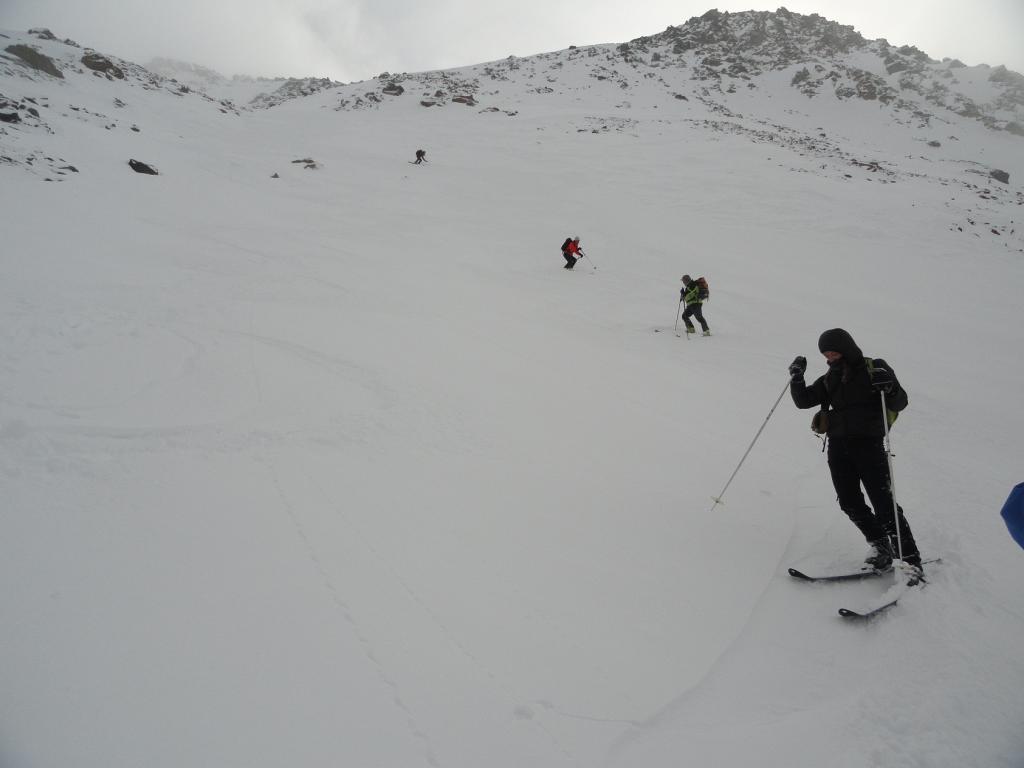 oggi non possiamo di certo dare più di 3 stelle..il vento ha lavorato molto anche qui e, nella parte, ci sono molti tratti di crosta non portante, alternati a tratti portanti ben sciabili. belle neve ancora polverosa solo dopo il lungo traverso.