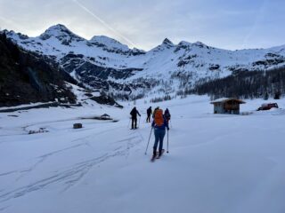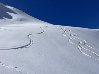 partiti presto (7:00) in compagnia di numerosi gruppi diretti verso le varie mete della zona. lungo traverso su neve dura da rigelo. sopra i 3000 (zero termico) neve farinosa che ha permesso delle belle curve. a metà discesa crosta/firn a seconda delle angolazioni . sotto i 2300 pappa.