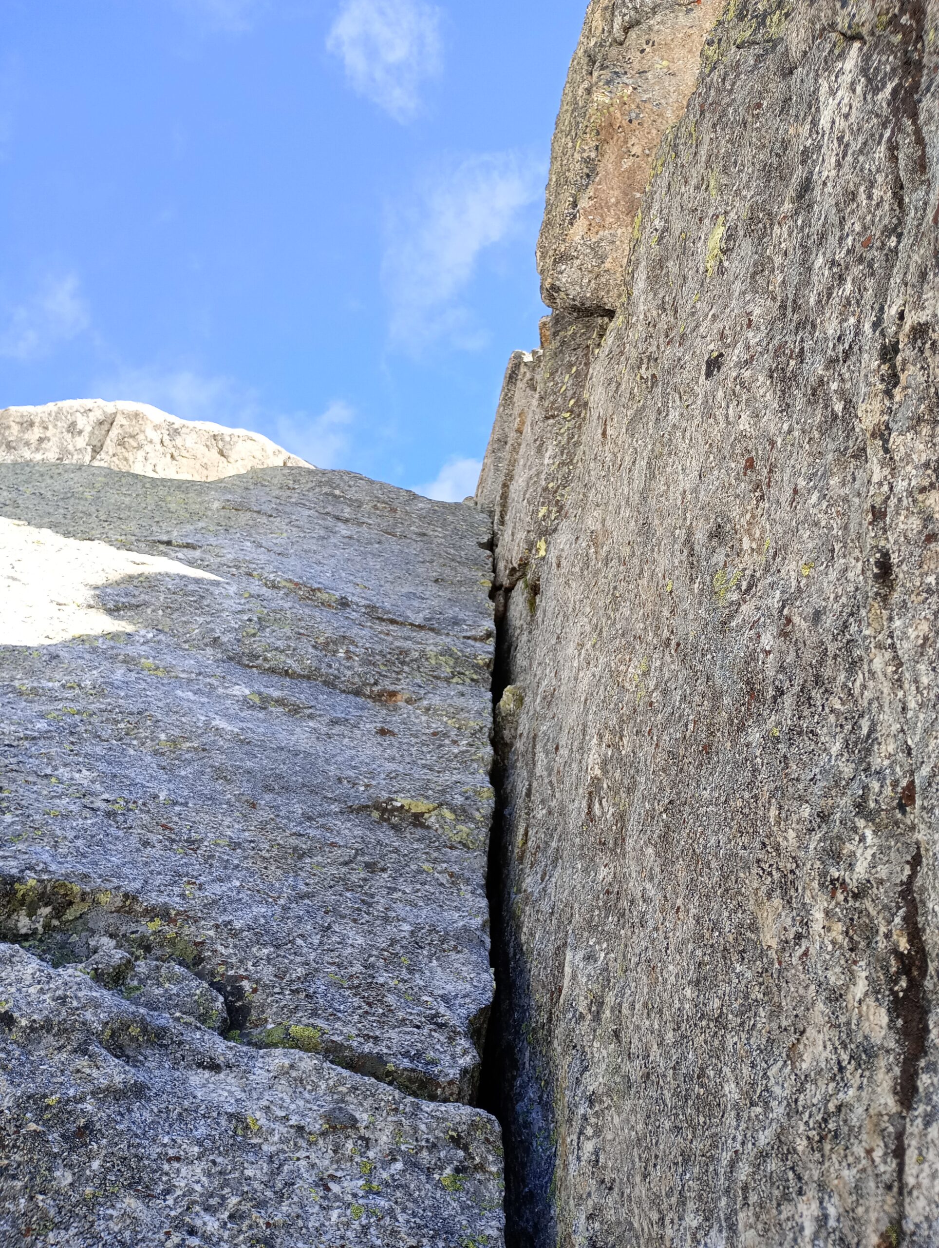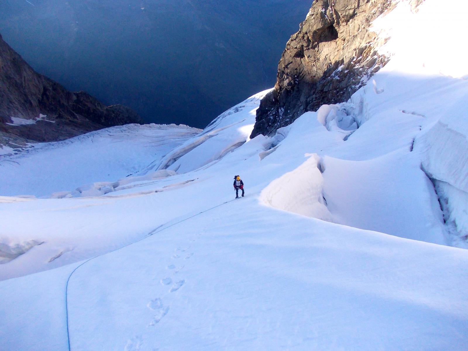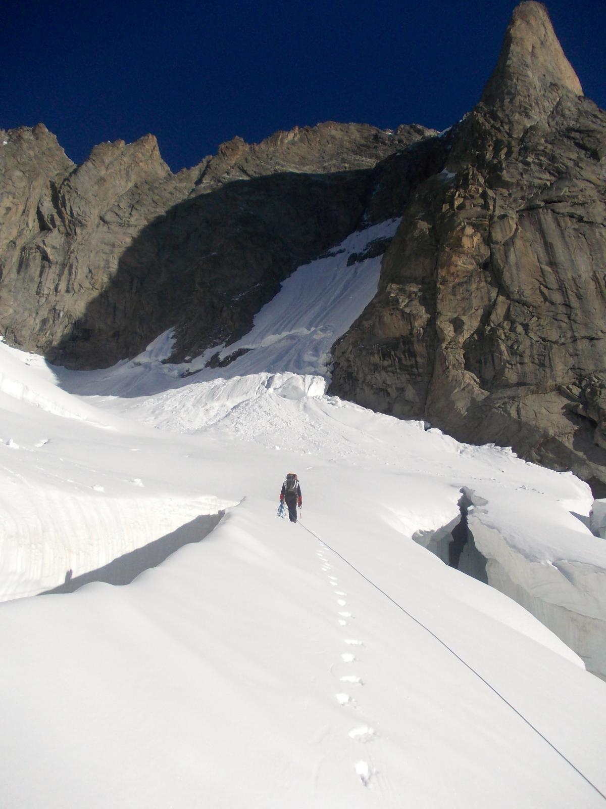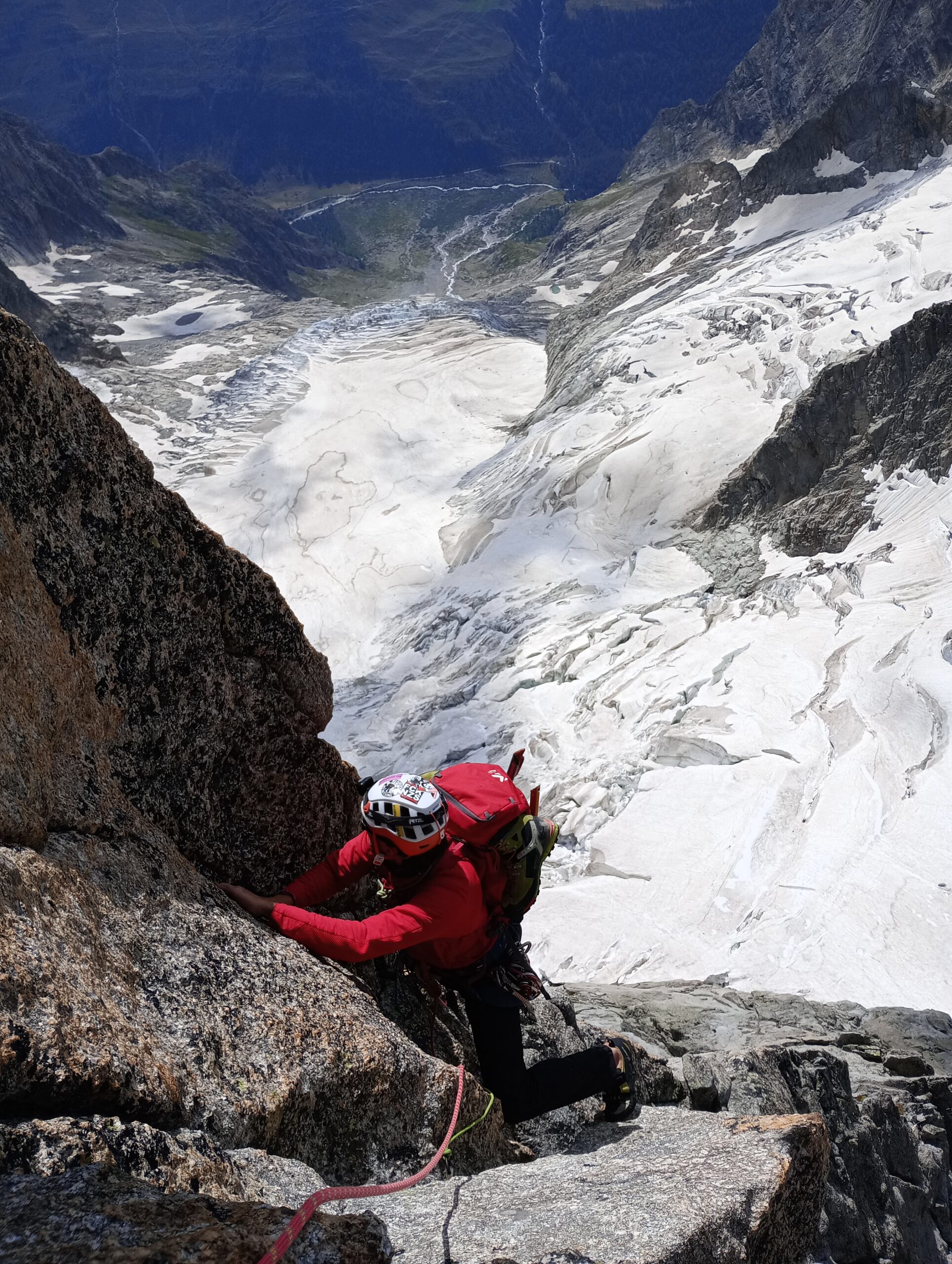 Questo perché la discesa classica dalle Petites Jorasses in questi anni caldi e secchi è diventata pericolosa e conduce su un ghiacciaio molto crepacciato e a volte insuperabile.