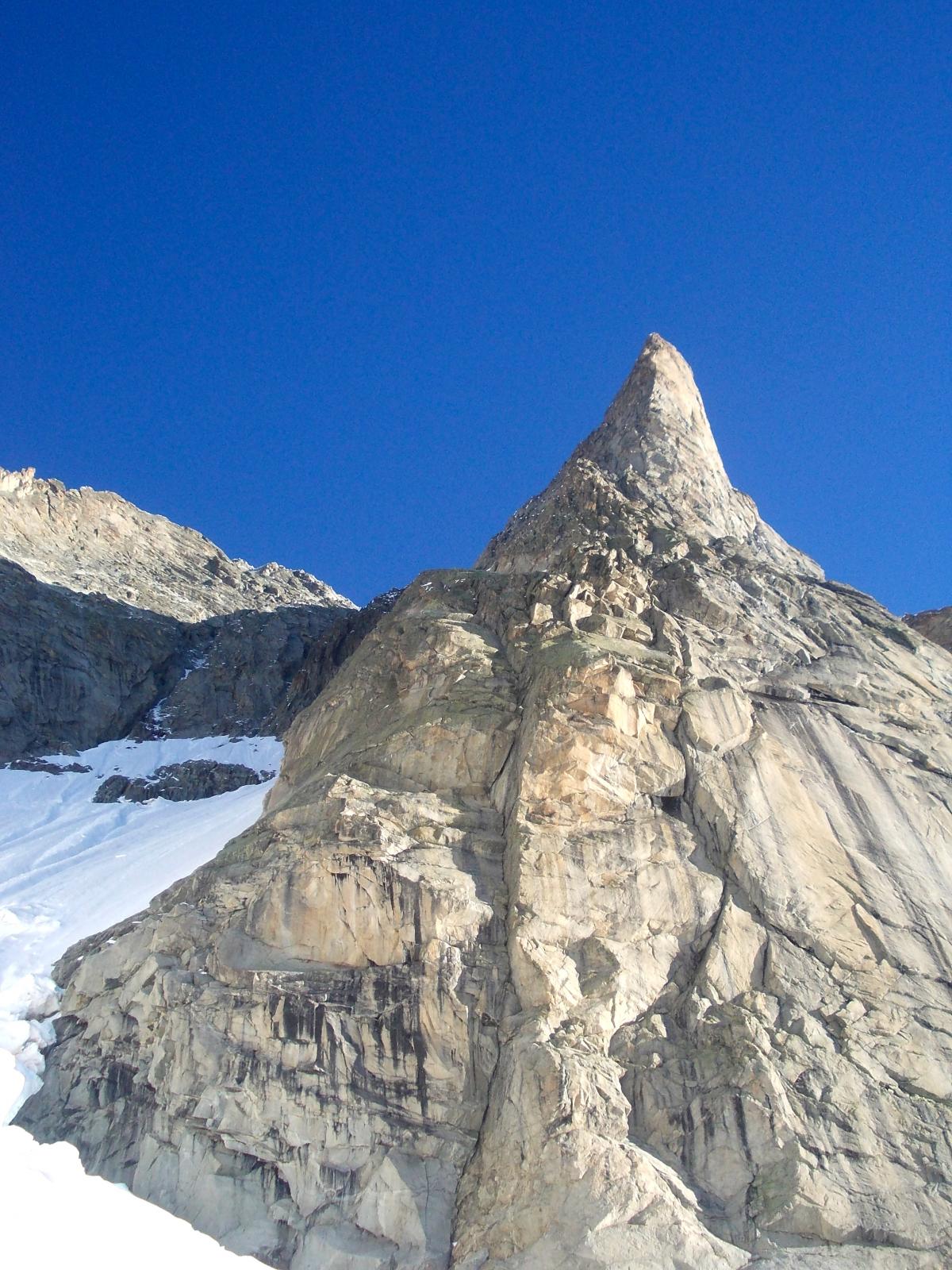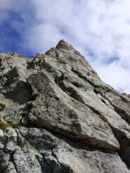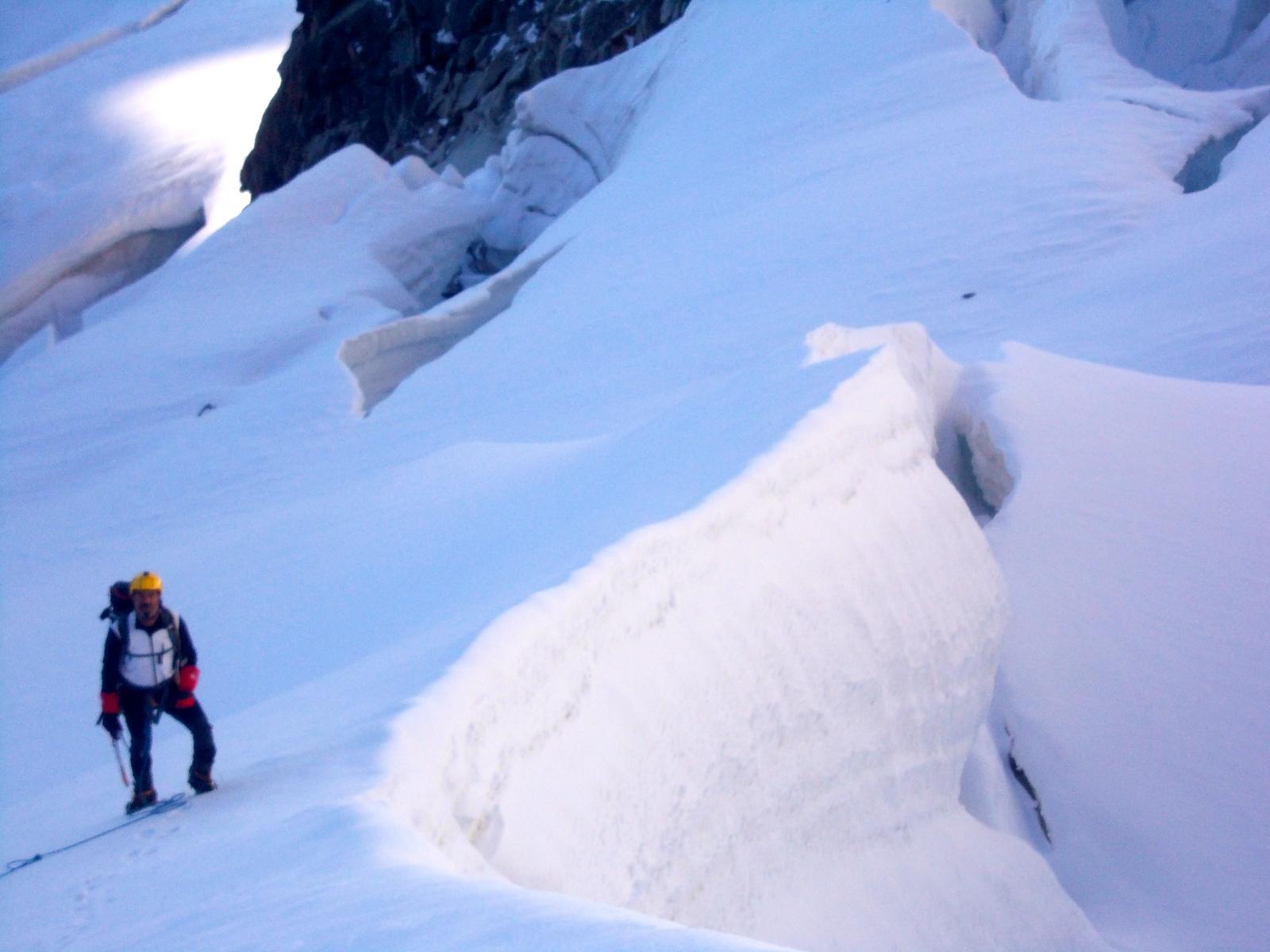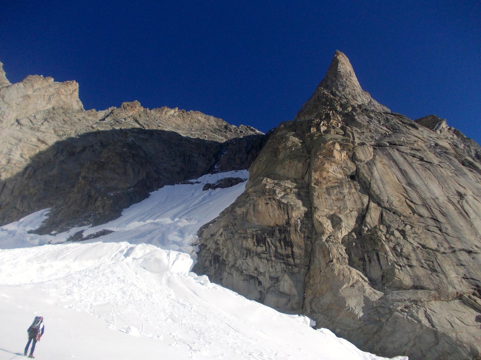 Dall’ estremità di questa lingua alzarsi sul fianco W (poco difficile), verso il punto in cui la cresta, da bombata, diventa affilata; si raggiunge uno stretto terrazzo del versante E (3430 m ca) (2h 30 / 3h).