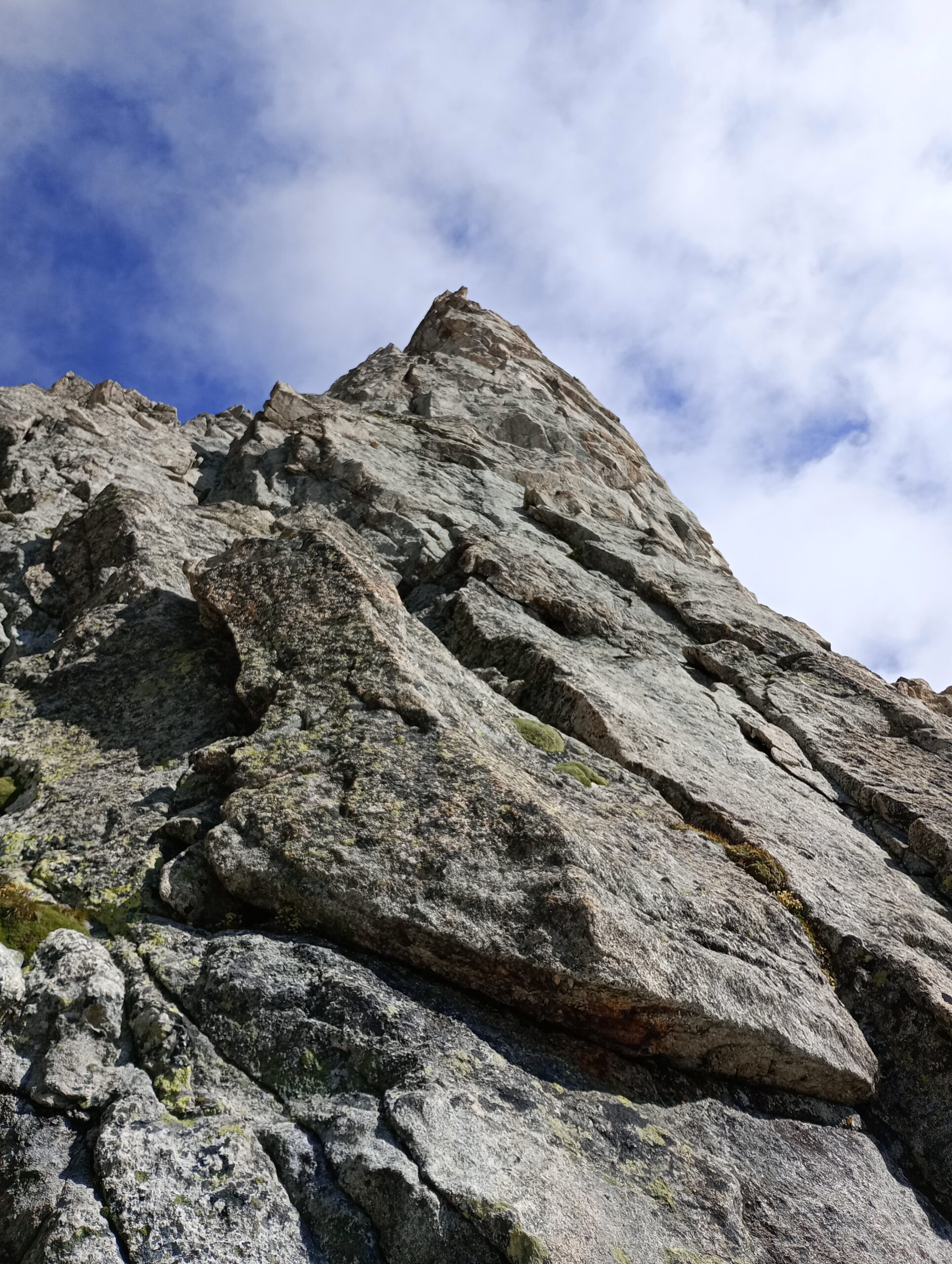 Attaccare la cresta per il suo filo salendo salendolo per 10 m (4°) fino ad una piccola piattaforma a dx, da cui ci si alza direttamente verso un masso appuntito della cresta (4°). Scendere per 1,5 m sul versante W per raggiungere la base di un diedro rosso di 20 m che si sale (4°) fin sotto il tetto che lo chiude.