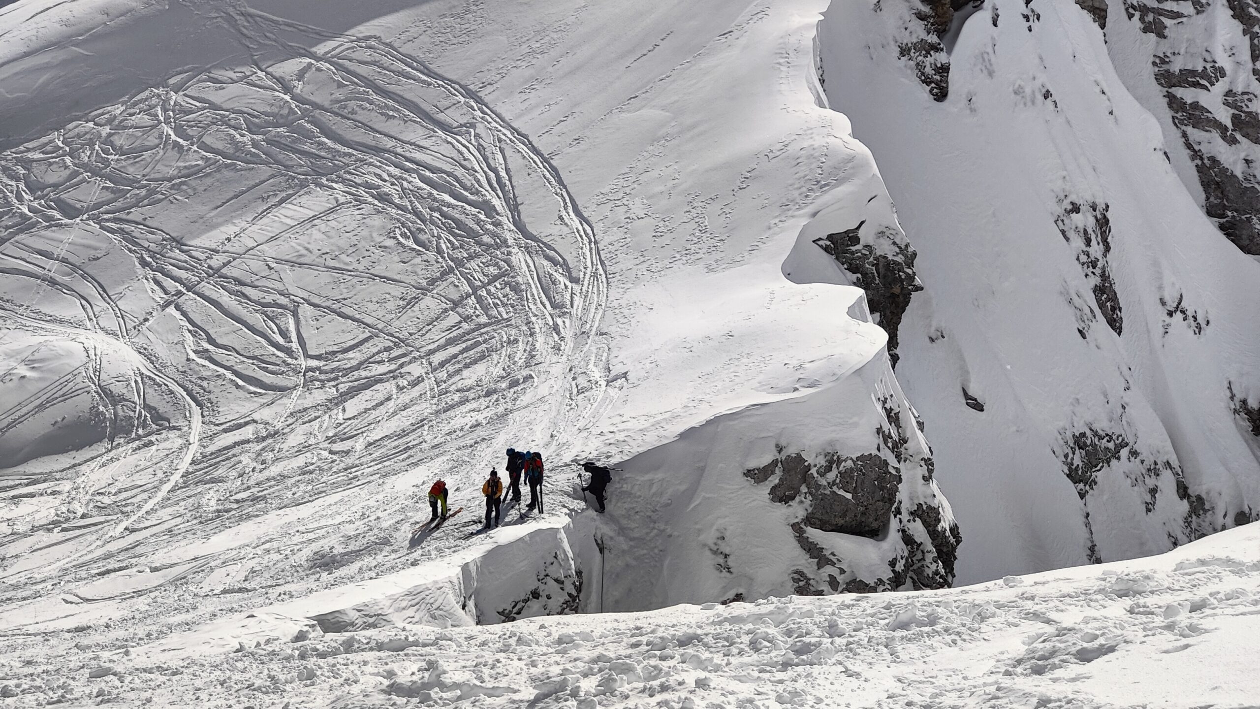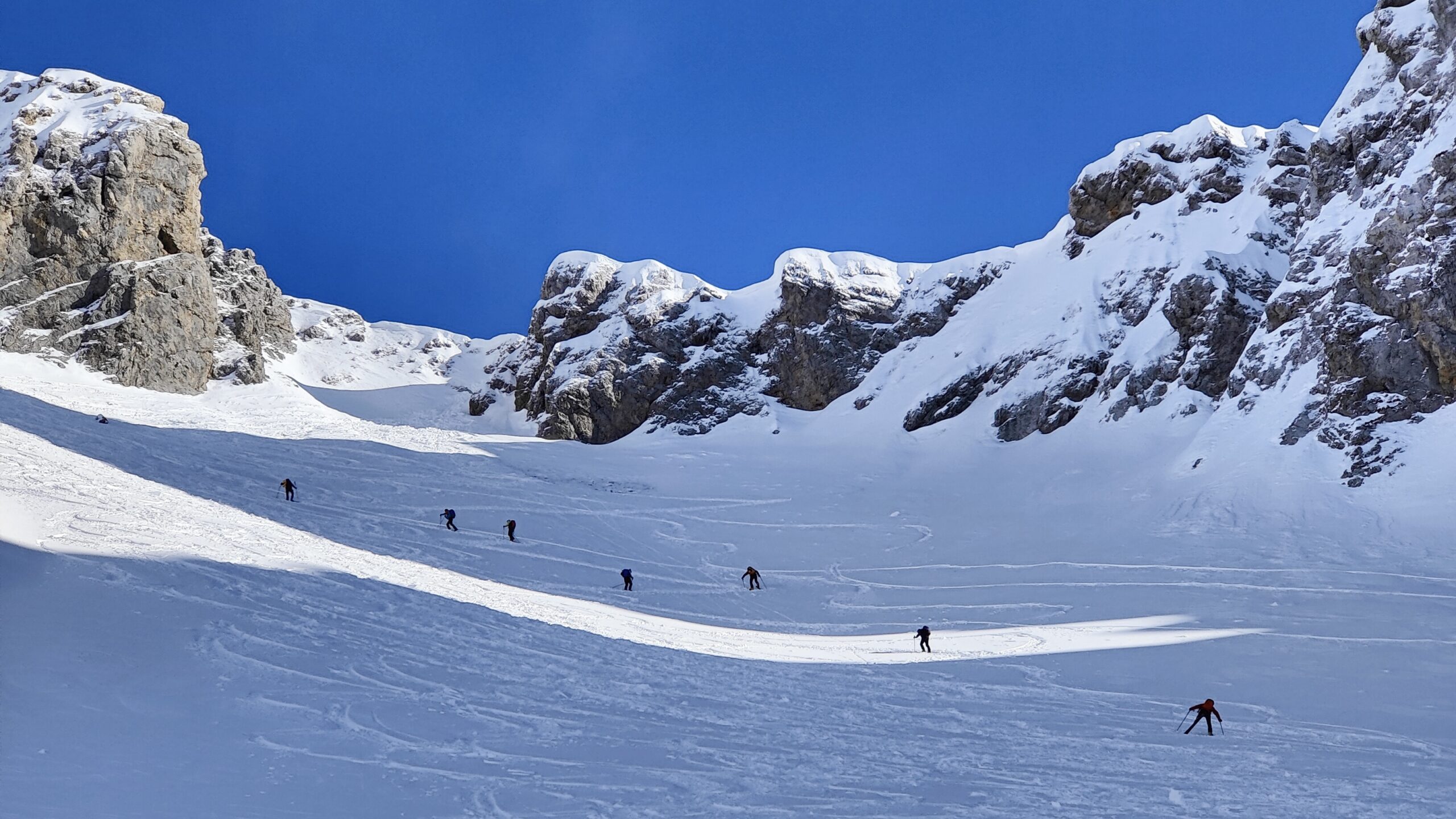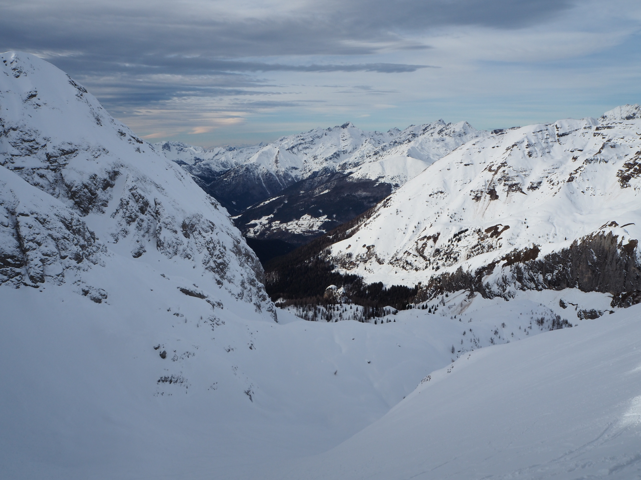 Scendere per qualche metro e compiere un lungo traverso verso sx, arrivando alla conca a q. 1900 m. Si risale ora verso E l’evidente canalone del Pizzo di Petto via via sempre più ripido e si lasciano gli sci nei pressi del colletto (spesso presenta delle grosse cornici o è ghiacciato). Saliti al colletto, in breve si raggiunge verso sinistra la vetta.