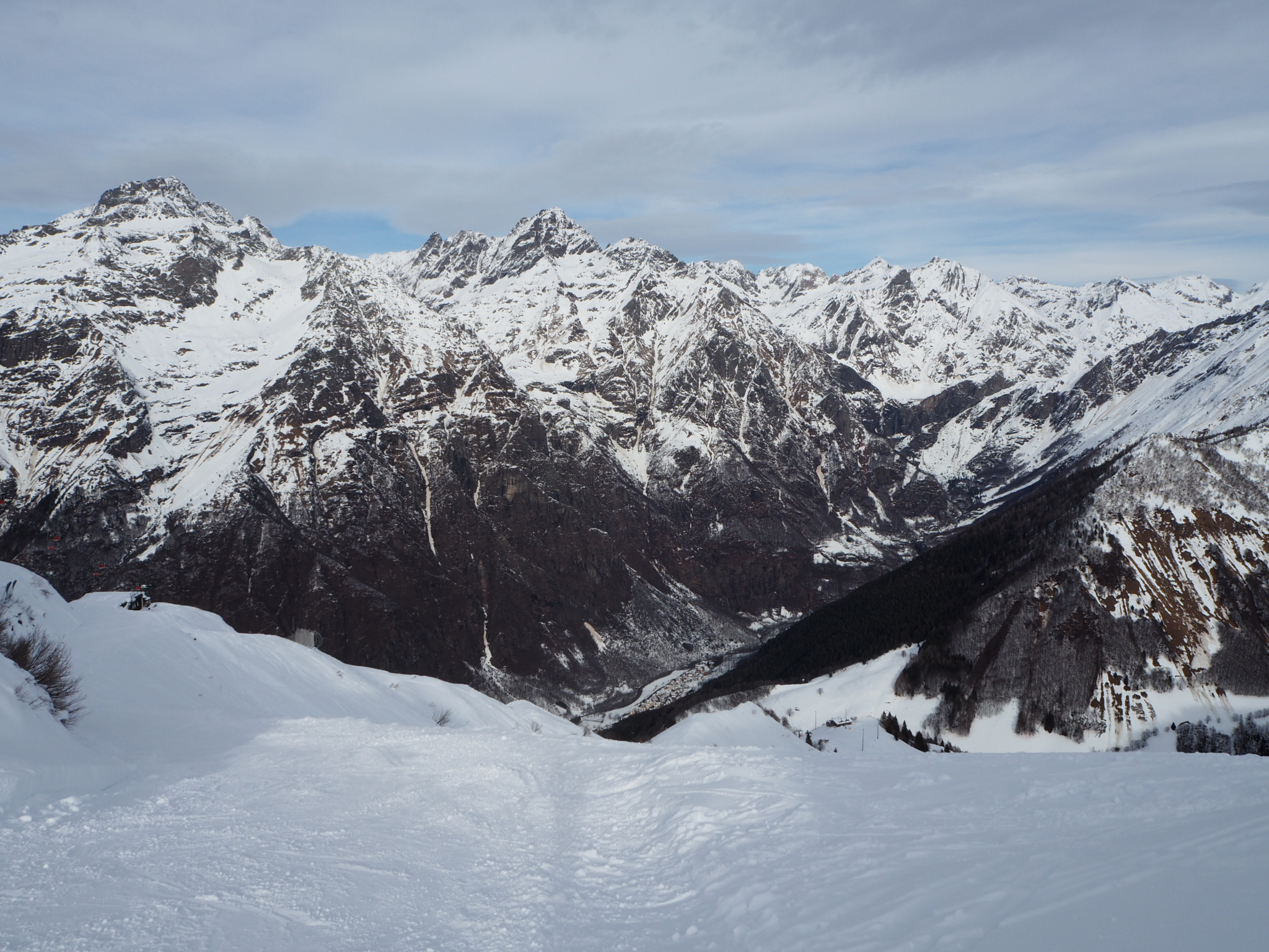 A) salire sullo Sponda Vaga (m. 2070) e poi scendere dalle piste fino a Lizzola;