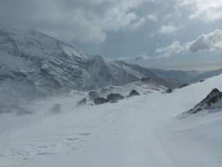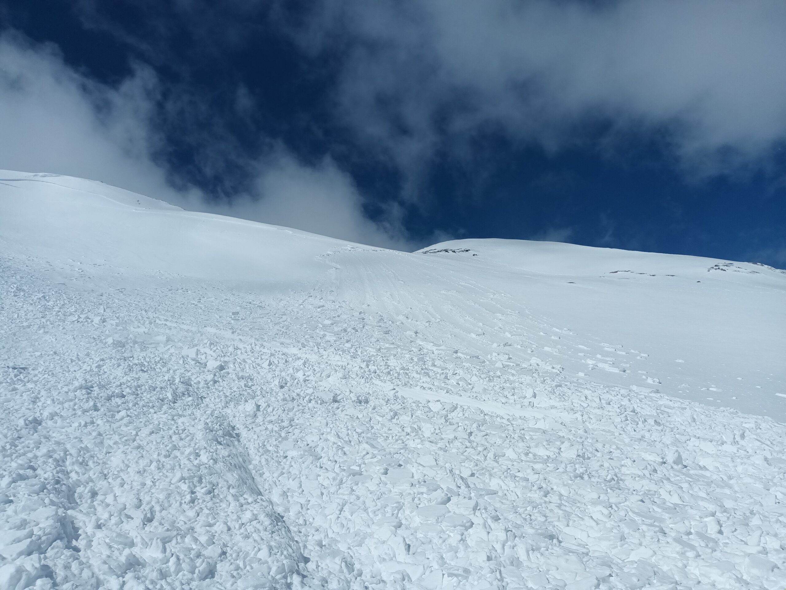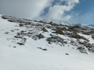 Partiti alle 6.55 da quota 1.770, dove finisce la strada asfaltata. Sci in spalla fino alla croce del soldato. Il canale svalangato che consente di raggiungerla, nel primo mattino era verglassato e potrebbero essere utili i ramponi. Raffiche di vento fortissime hanno condizionato tutta la salita, determinando accumuli non facilmente valutabili anche a causa di una visibilità non ottimale. Alle ore 10,45 circa, giunti a circa 100 metri dalla vetta il ripido pendio sommitale sotto il nostro carico è venuto giù, travolgendoci ma per fortuna senza causare danni fisici. Discesa molto fisica con un solo bastoncino a testa su manto nevoso molto vario ma sempre ben sciabile. Con Luca, compagno anche di questa avventura certamente indimenticabile. Grazie a Franco sceso con noi fino al rifugio Levi Molinari.