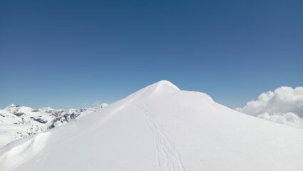 Neve dal pendio sotto la croce del soldato, discreto rigelo in basso, ottimo nel vallone Galambra. Moltissima neve sulla cima, completamente bianca. Discesa iniziata alle 11, splendido firn fino al lago delle Monache, poi un tratto di neve marcia sfondosa, sotto i 2300 neve sempre bagnata ma compatta più sciabile. Molto caldo. Con Marco, Emilio ed Oscar.