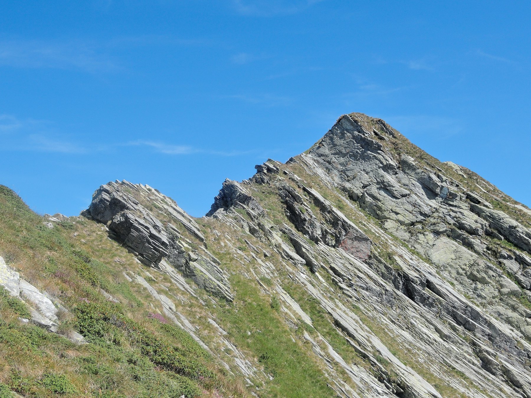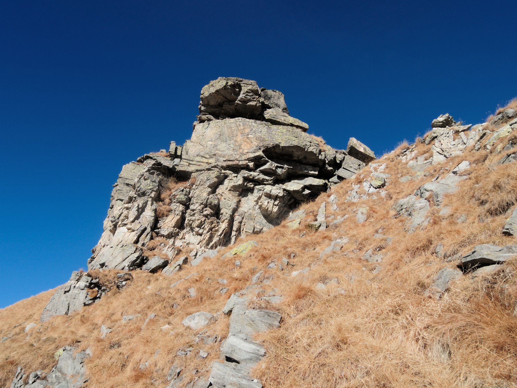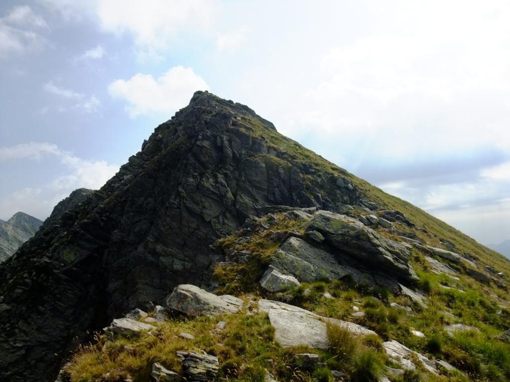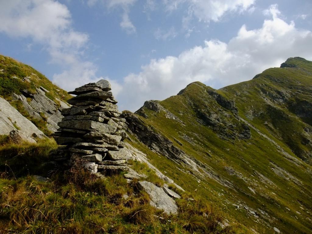 Questo tratto di cresta è totalmente erboso e non presenta difficoltà alcuna. Dopo un grosso ometto di sassi compaiono le prime rocce; la cresta prosegue con una lieve deviazione a destra poi piega decisamente verso Est-Nord-Est in corrispondenza di una prima punta, poco evidente, quotata 2336 m.