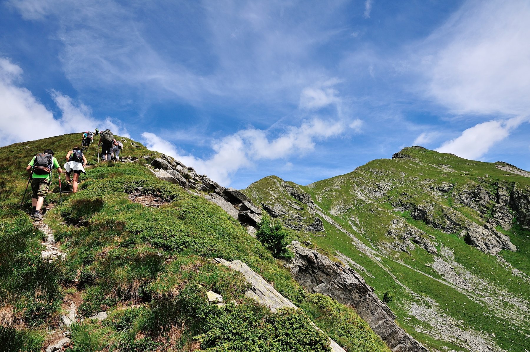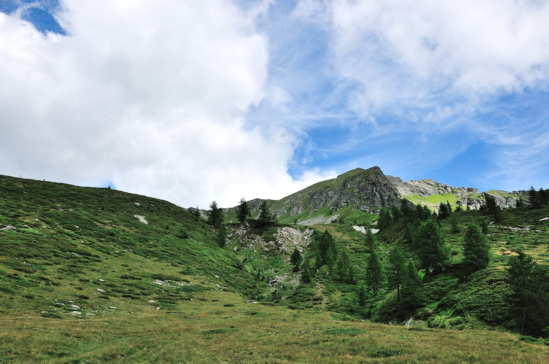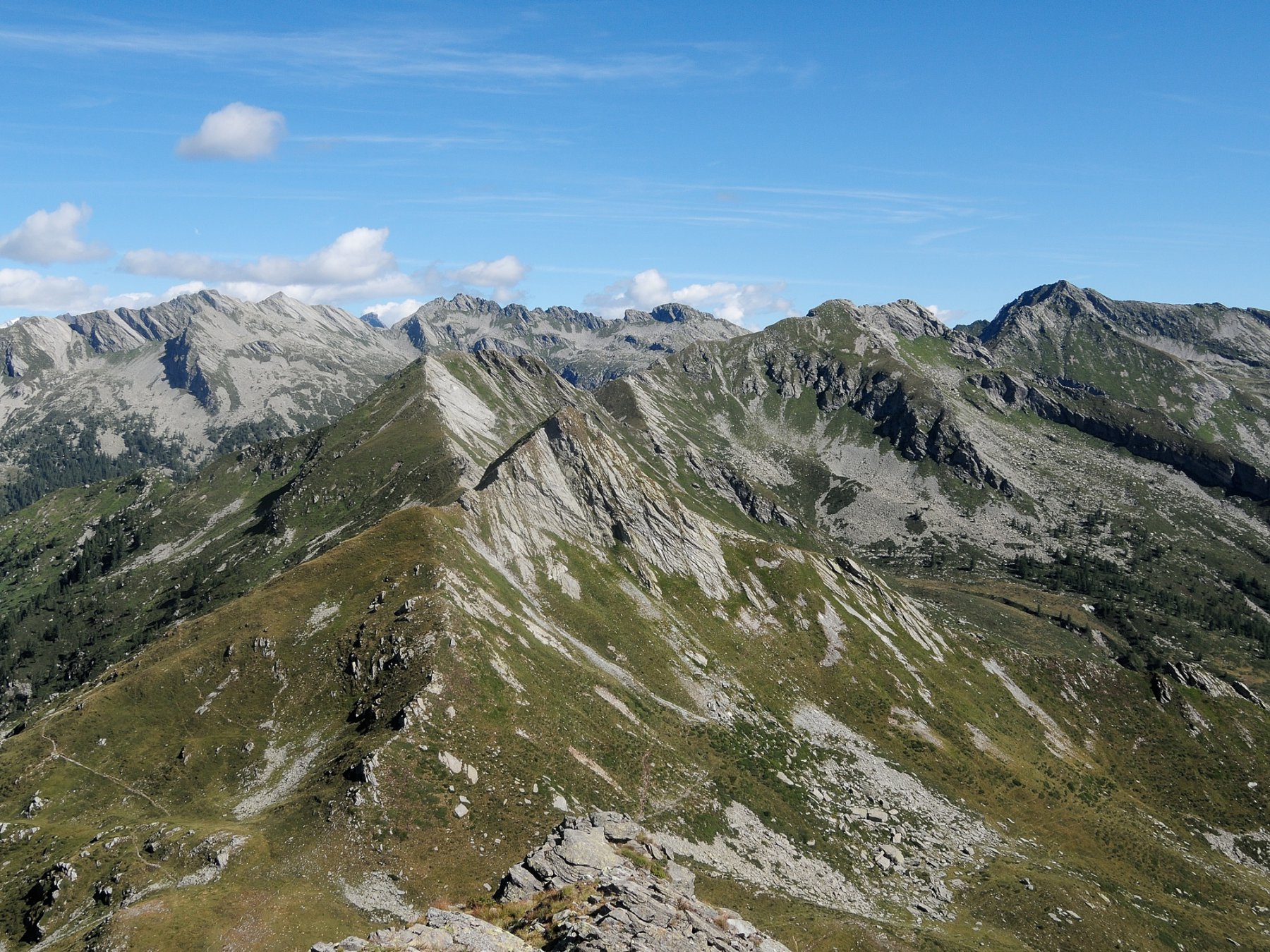 Questo tratto di cresta è totalmente erboso e non presenta difficoltà alcuna. Dopo un grosso ometto di sassi compaiono le prime rocce; la cresta prosegue con una lieve deviazione a destra poi piega decisamente verso Est-Nord-Est in corrispondenza di una prima punta, poco evidente, quotata 2336 m.