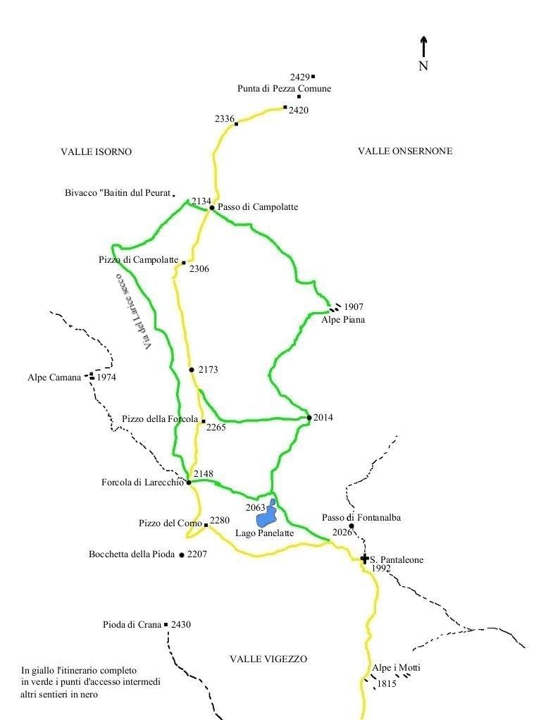 Gli altri punti intermedi, per chi volesse percorrere solo una parte della cresta, sono due: la depressione tra il Pizzo della Forcola e il Pizzo Campolatte, che si raggiunge dal Lago Panelatte prendendo il sentiero a destra subito dopo il lago fino ad una bocchetta quotata 2041 m (si veda la relazione della gita al Pizzo Medaro) per poi salire in cresta verso il Pizzo della Forcola; la cresta presenta tracce di sentiero alternate a punti un po’ scabrosi.