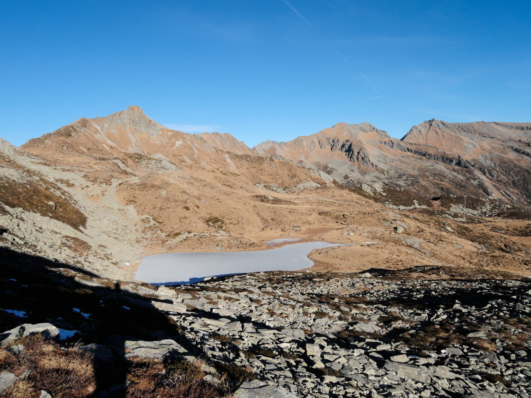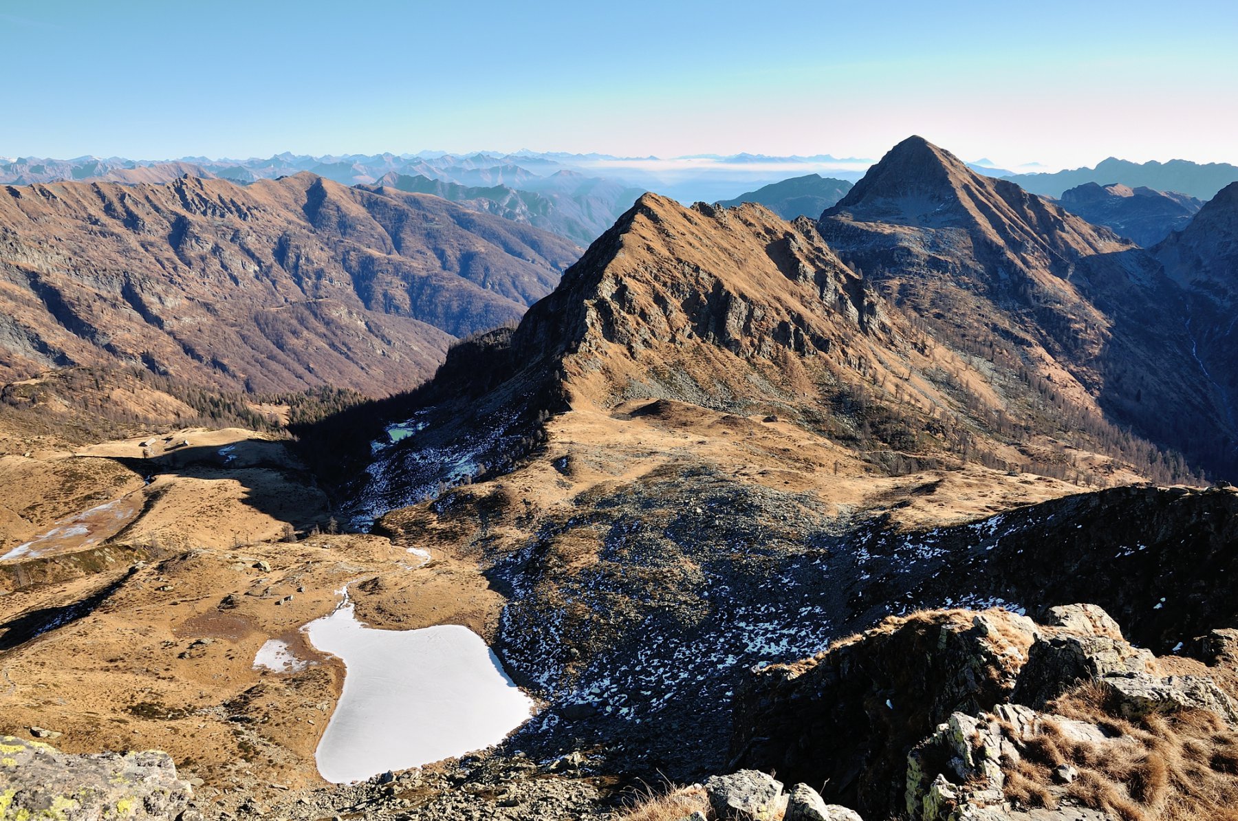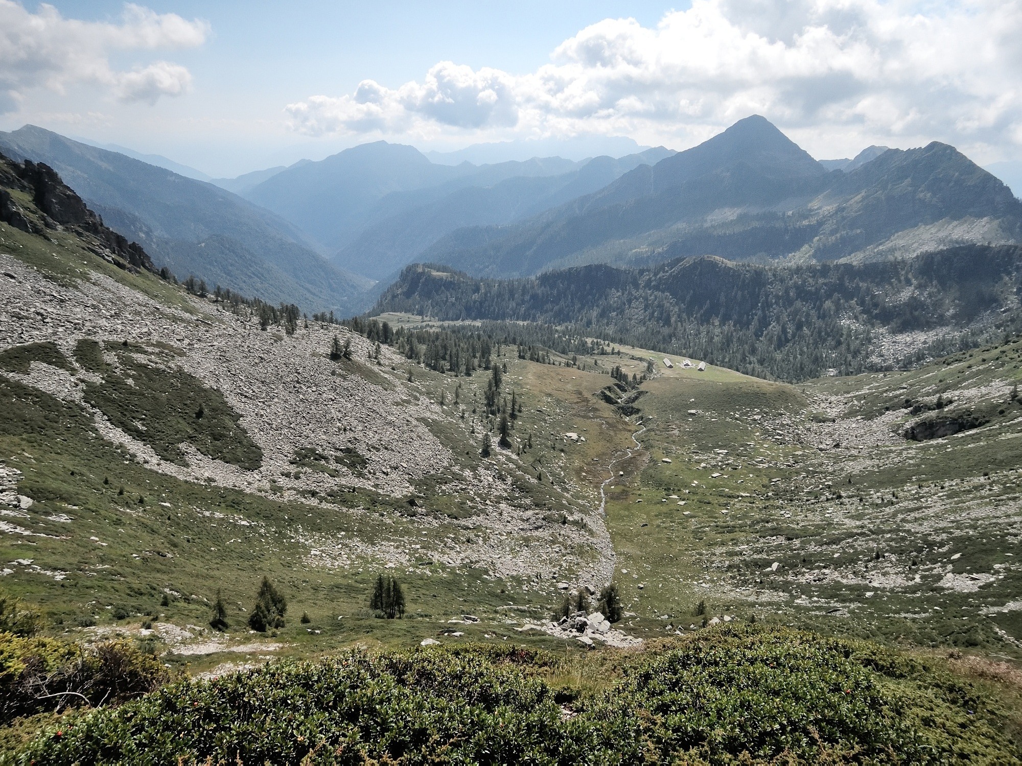 A sinistra del Passo, sul versante di Agrasino, si nota il bivacco “Baitin dul Peurat” del Cai Vigezzo, piccola costruzione sempre aperta che offre un ricovero di fortuna. Raggiunto il Passo di Campolatte (m 2134), si ricomincia a salire sempre in cresta, dapprima in direzione Nord, verso la Pezza Comune.