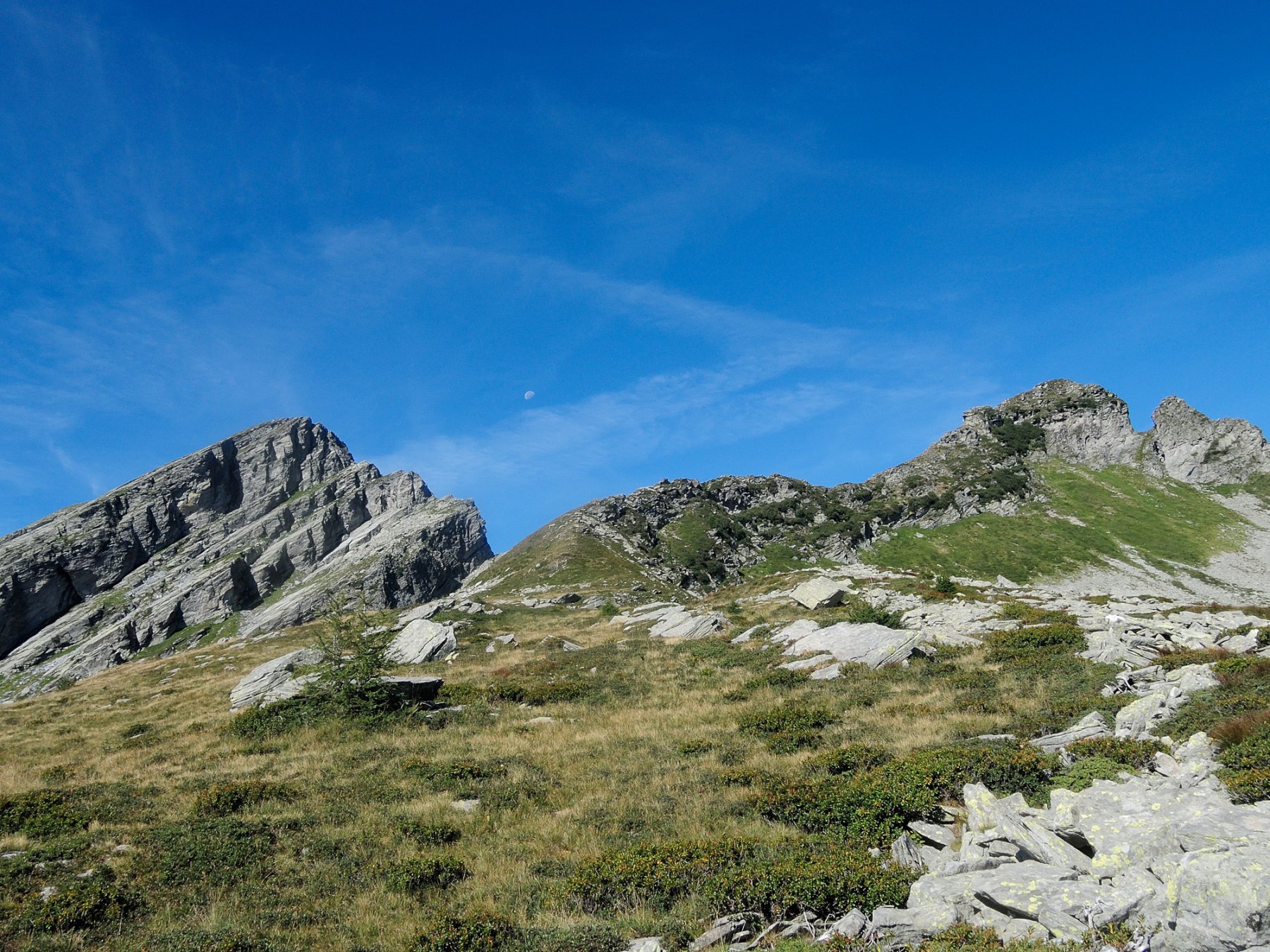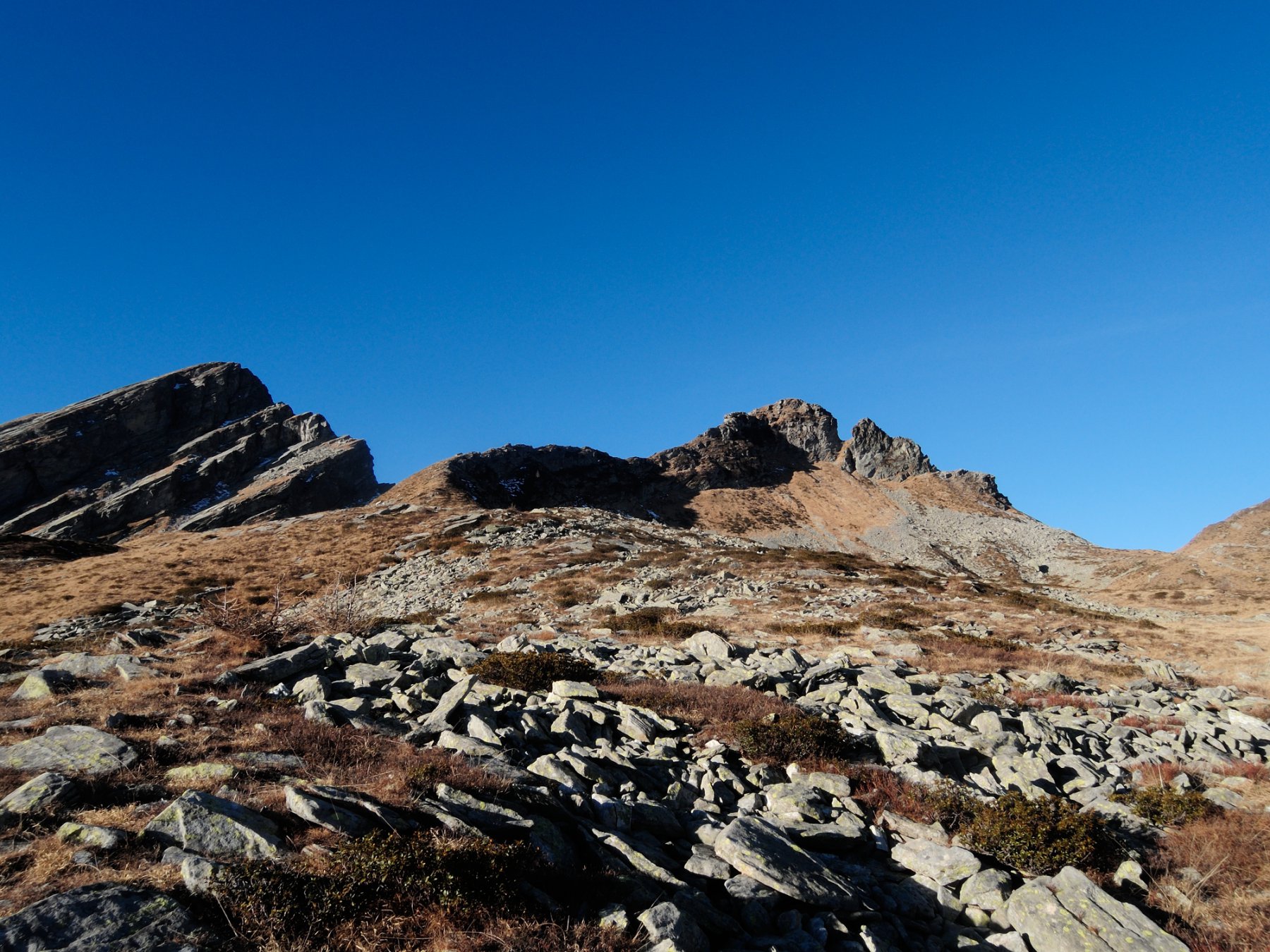 Quasi subito si incontra un passaggio scomodo dove la traccia è ingombrata da una roccia sporgente; si può scegliere di passarci sotto o abbassarsi leggermente sul pendio, molto ripido in questo punto. Si continua a seguire la traccia che passa una ventina di metri sotto la forcella tra le due cime e più avanti si perde nella pietraia che, in discesa, conduce alla Forcola di Larecchio (m 2148).