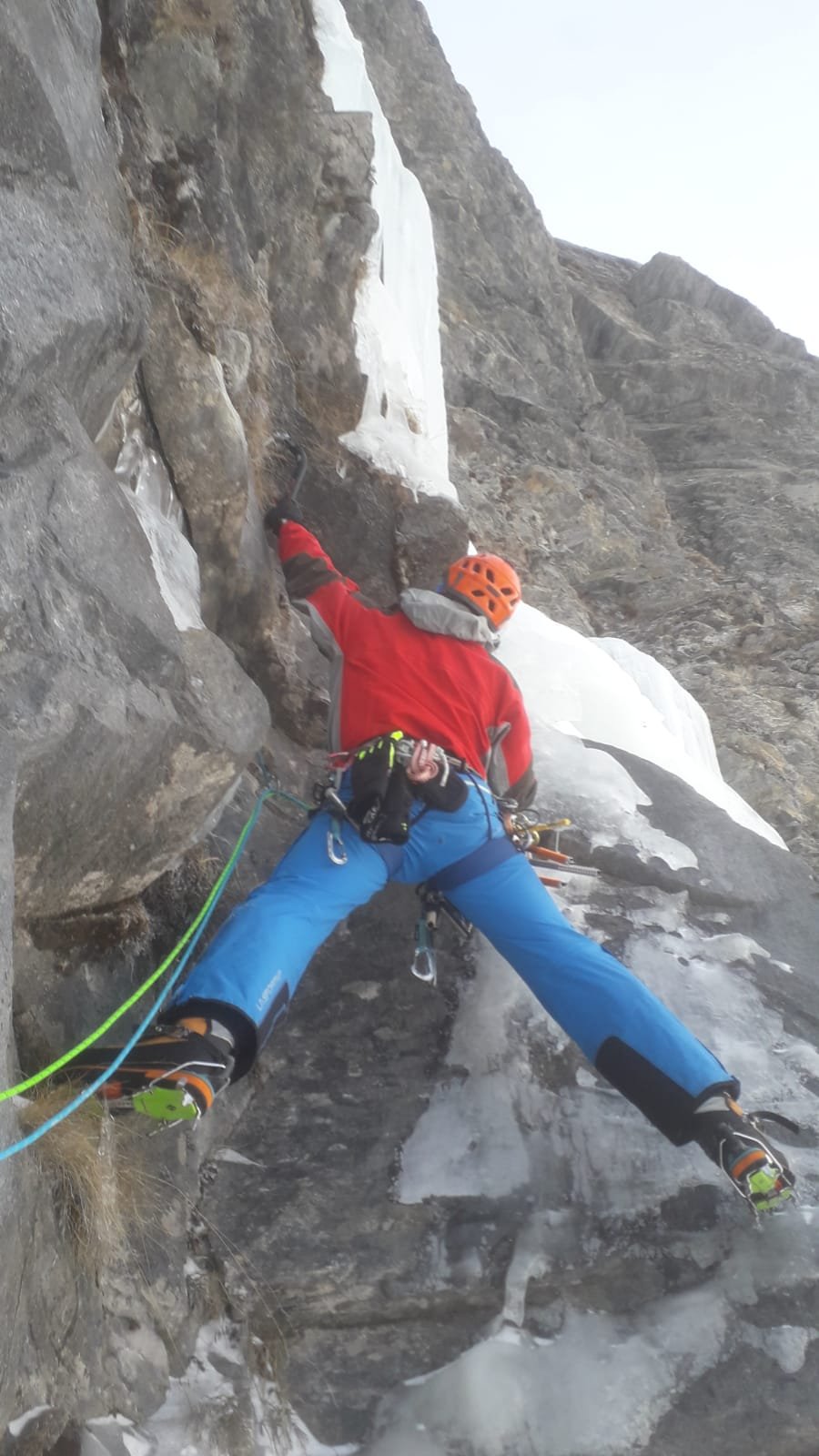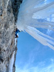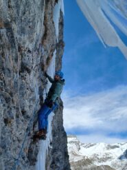 A destra della Naressa, punta dritto alle frange che, tutti gli anni, si formano sulla destra della colonna di ghiaccio. I tratti di dry, soprattutto quello del secondo tiro, richiedono continuità e buona tecnica, mentre come sempre le uscite su ghiaccio sono sempre un po’ psicologiche…