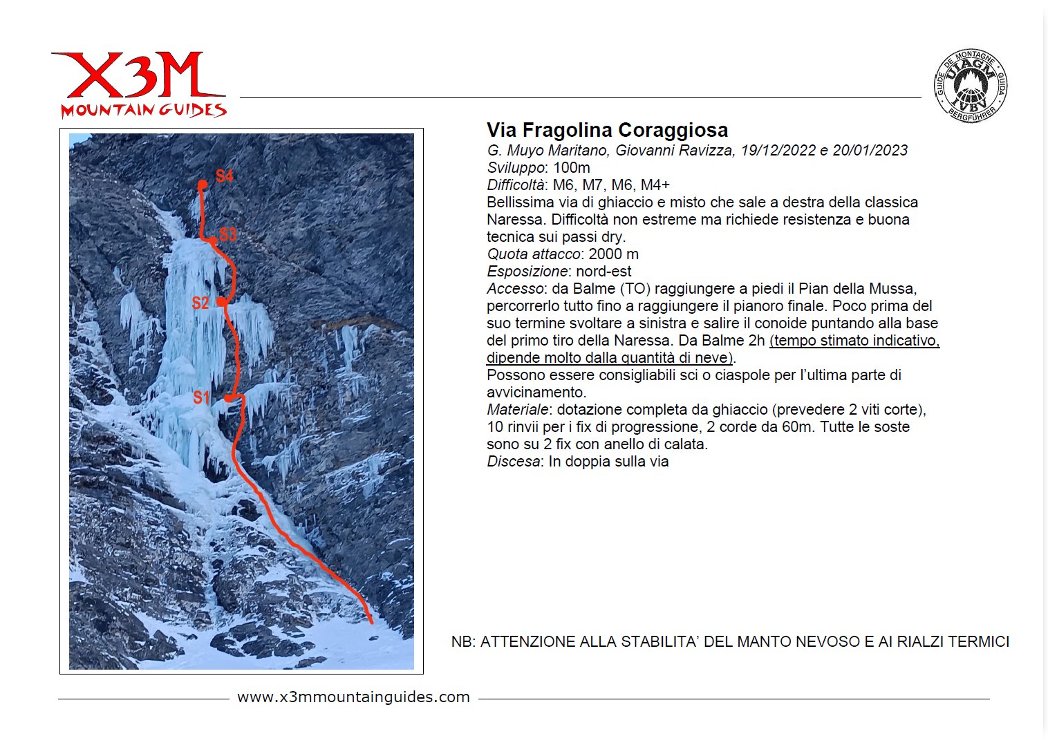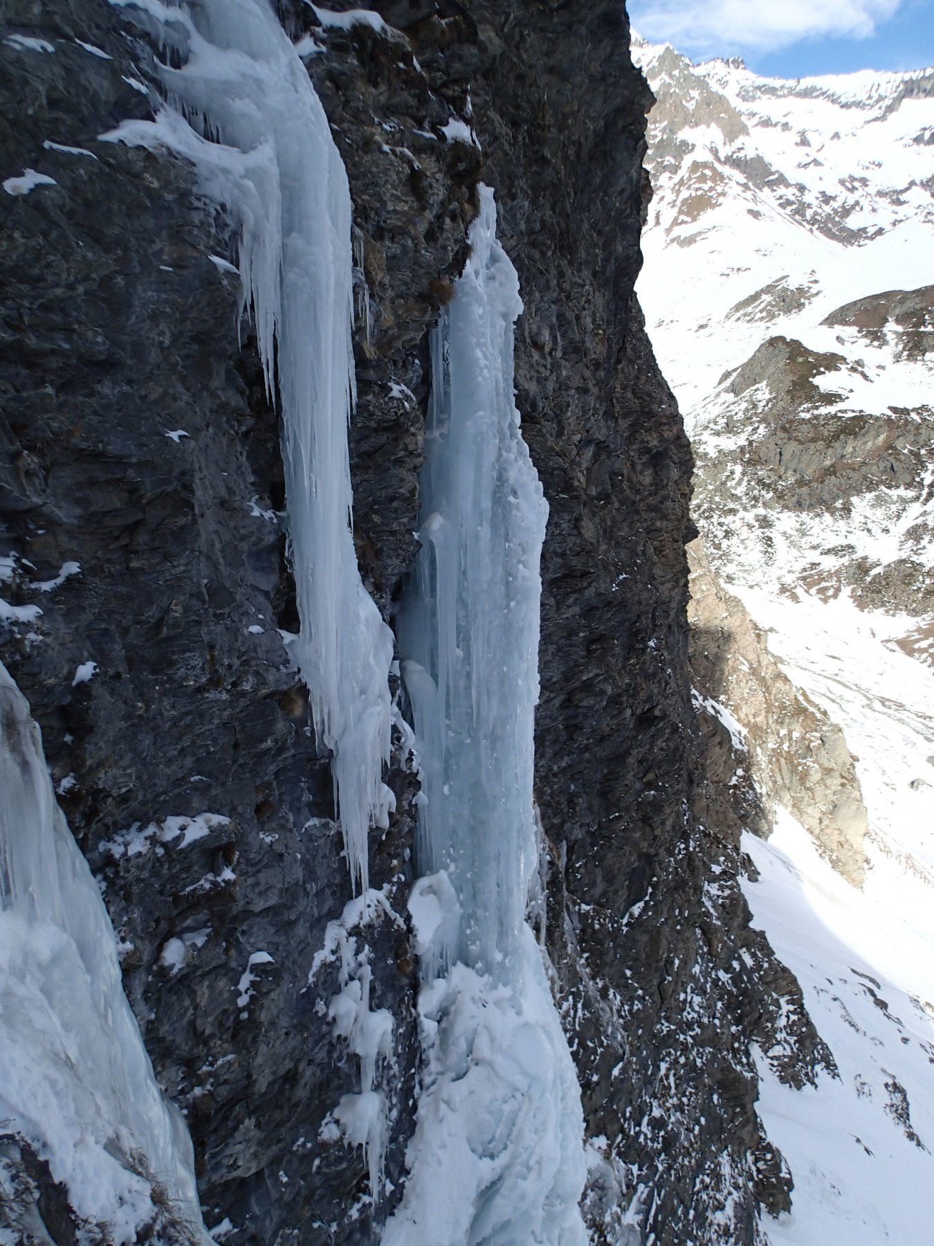 Bellissima via di ghiaccio e misto che sale a destra della classica Naressa. Difficoltà non estreme ma richiede resistenza e buona tecnica sui passi dry. Chiodatura ottima ma non ascellare. Materiale: 10 rinvii, viti varie (prevedere corte), 2 corde da 60m.