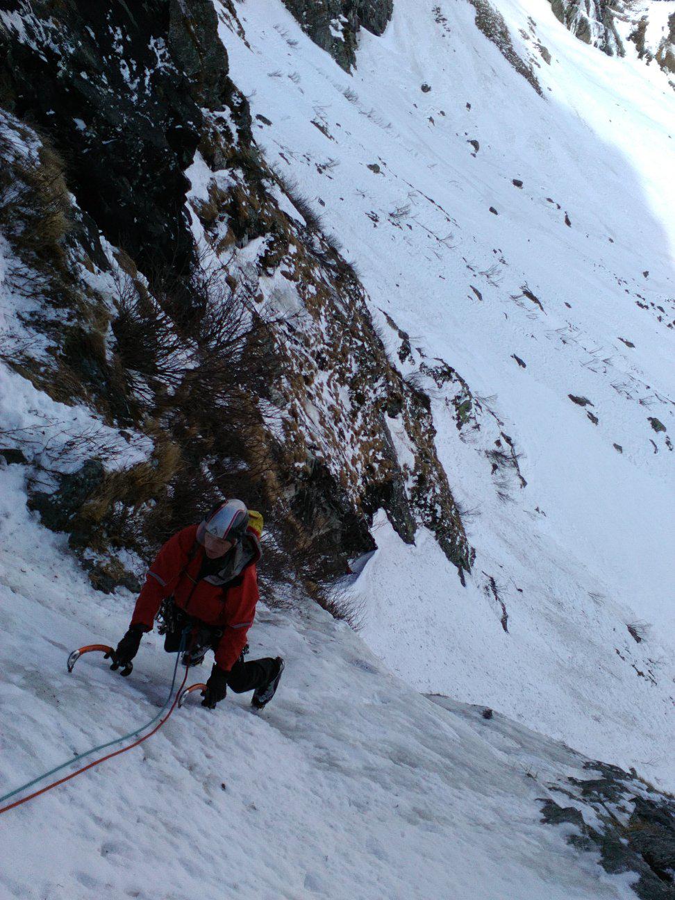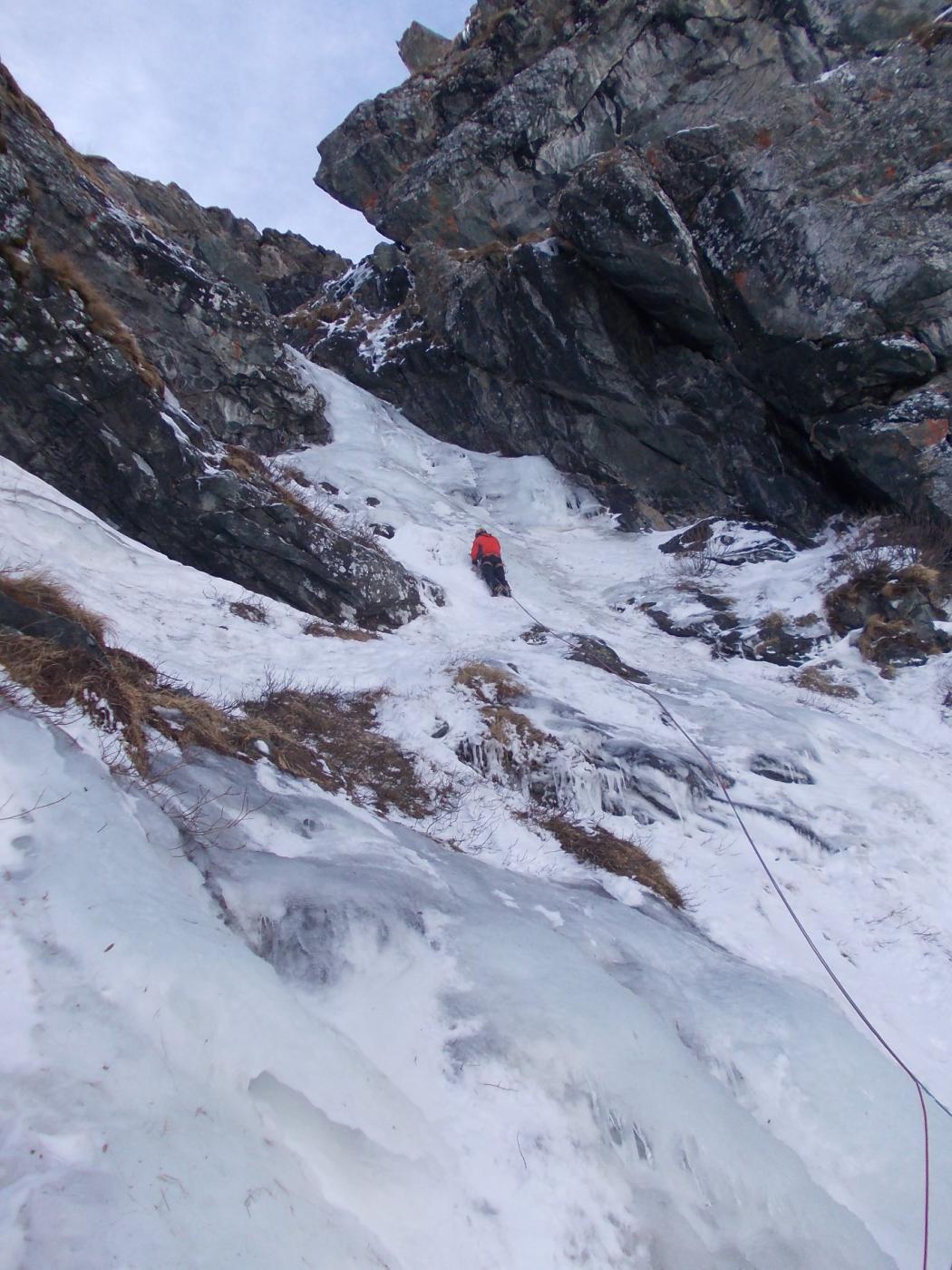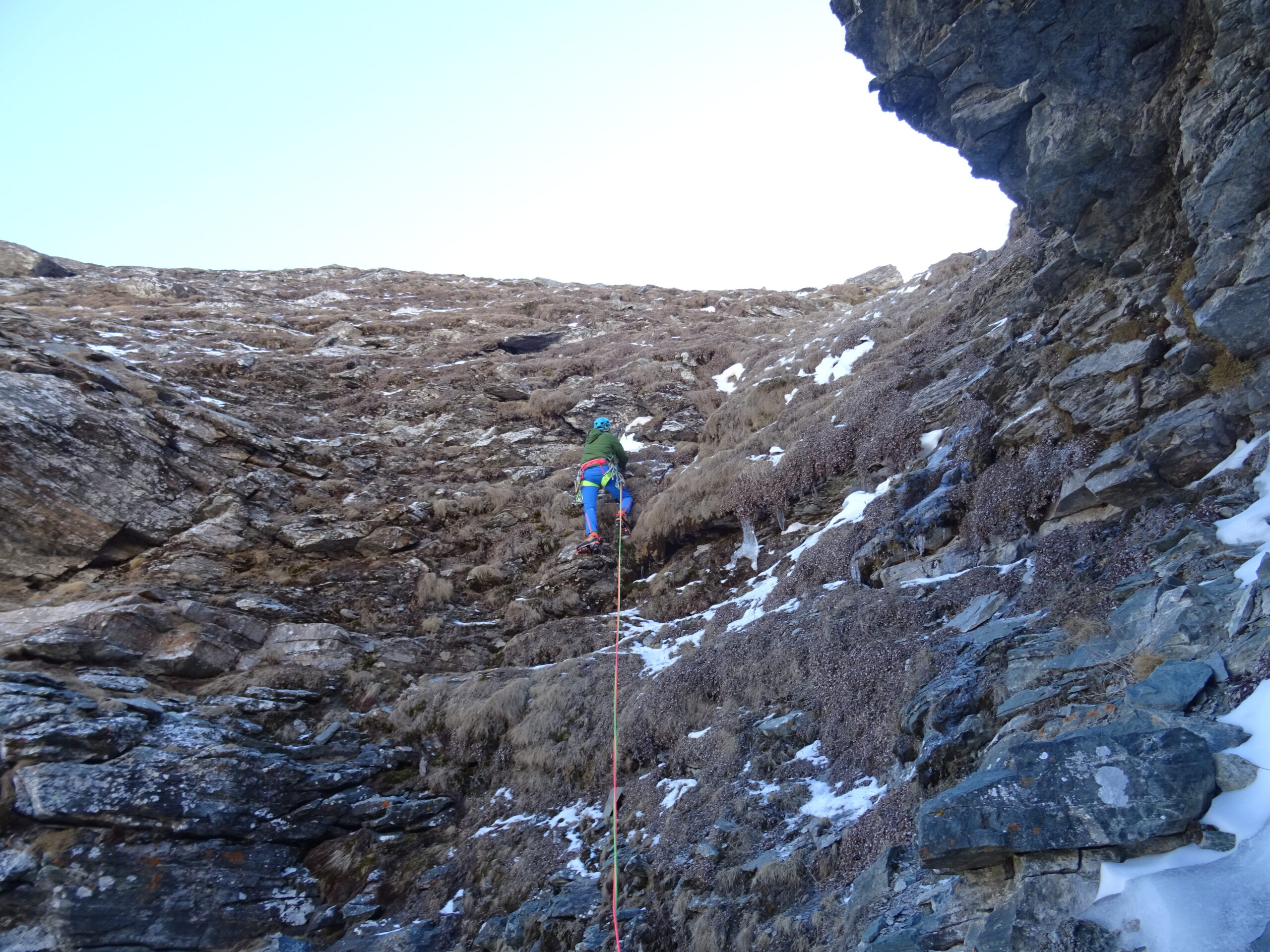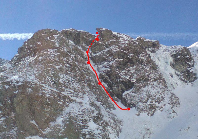 Primi tre tiri da 50m circa a risalti molto omogenei completamente su ghiaccio. La linea si sposta poi a destra sul fondo del diedrone finale (raggiungibile a seconda delle condizioni con un traverso o più in alto con un diagonale), che si segue fino all’uscita, misto neve, ghiaccio, teppa e roccette (un tiro da 50 e uno da 25). Soste attrezzate (S1, S2, S3 sulla sx, S4 a dx), ma misto finale da proteggere. Se si esce sul plateau sommitale a dx c’è un fix con moschettone.