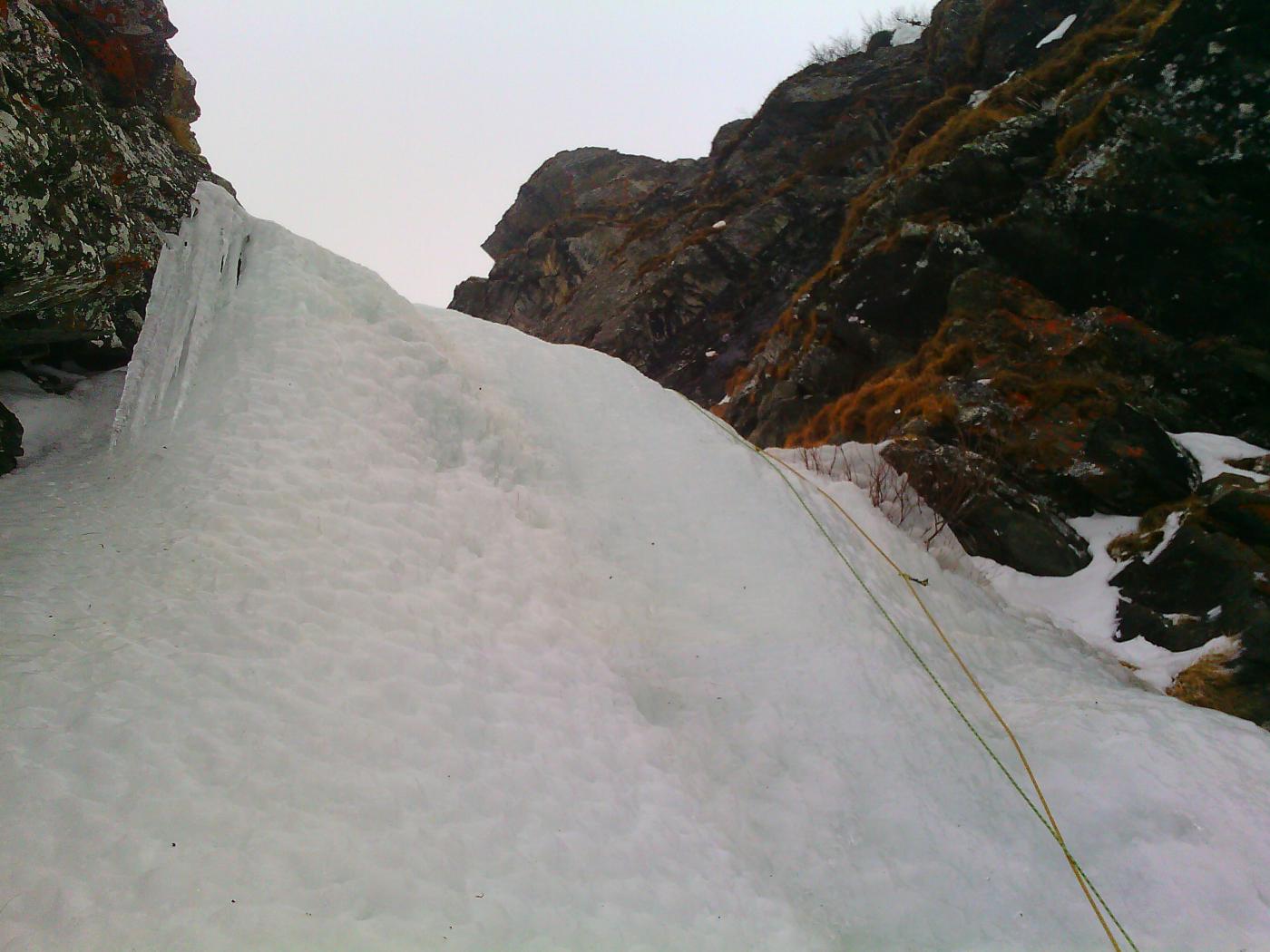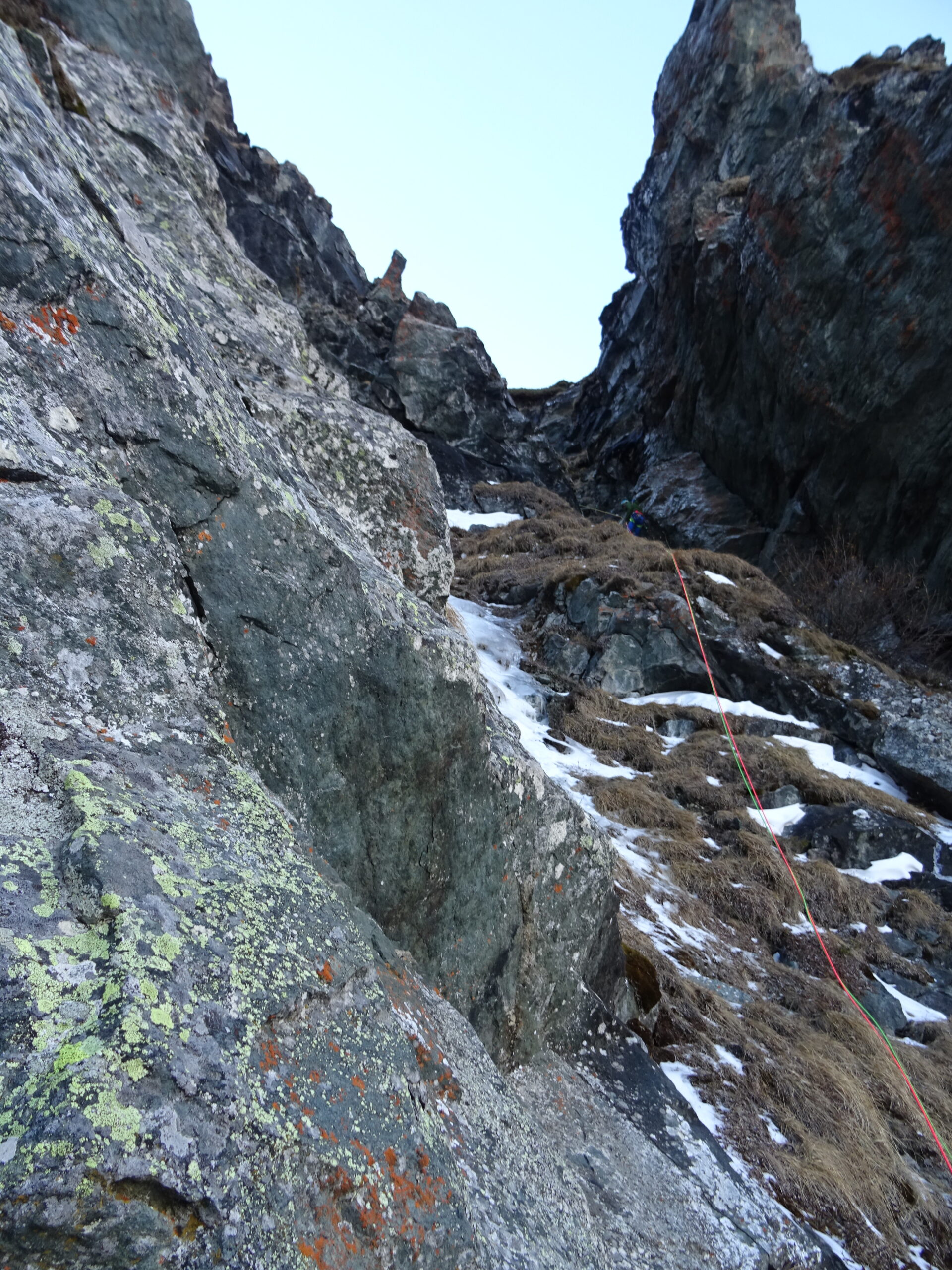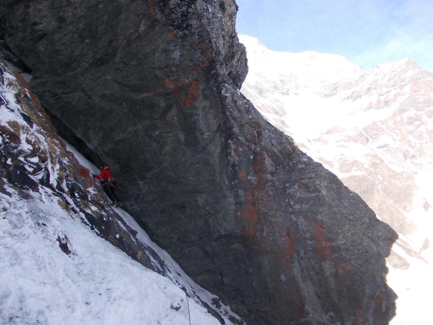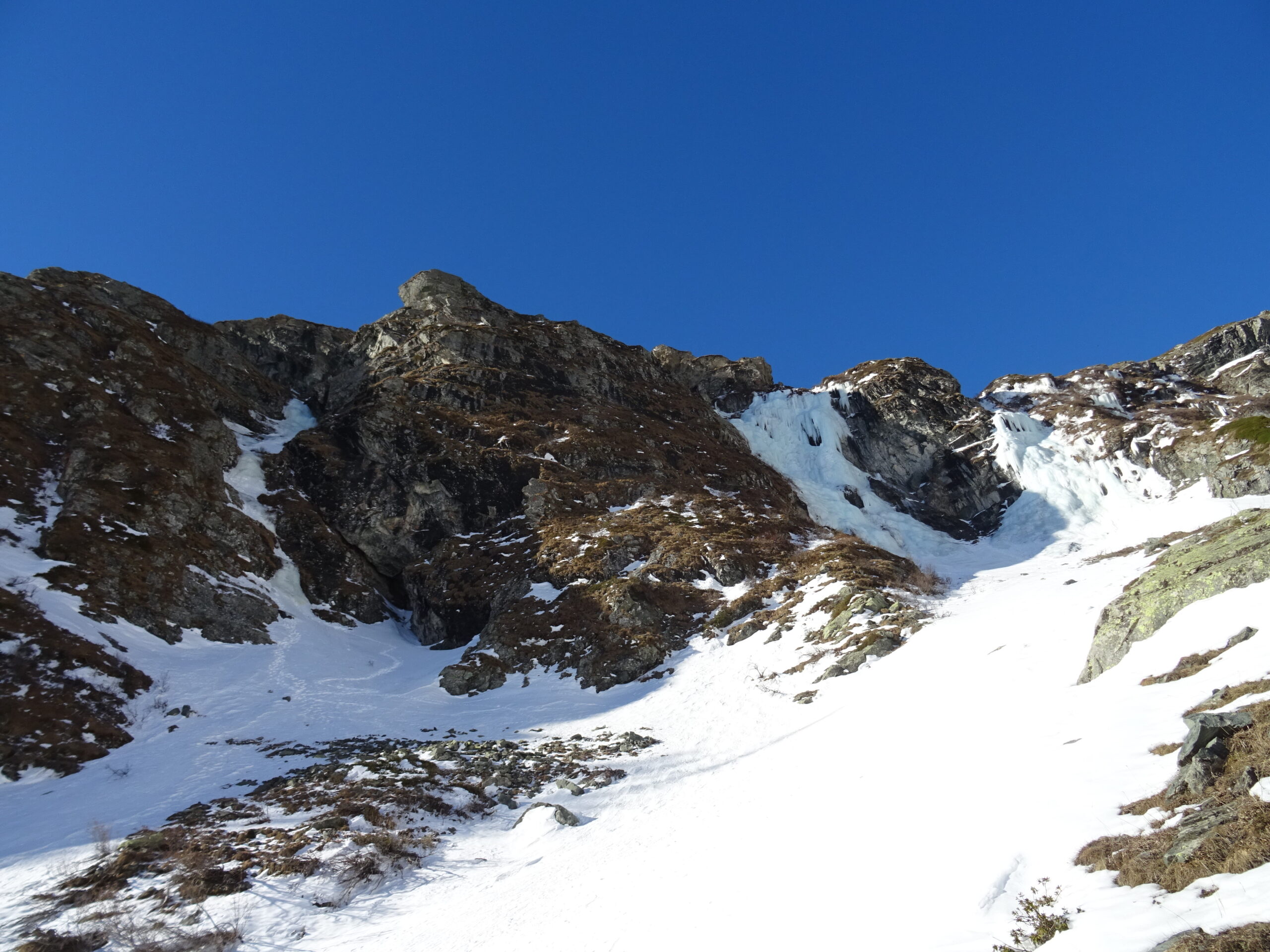 Primi tre tiri da 50m circa a risalti molto omogenei completamente su ghiaccio. La linea si sposta poi a destra sul fondo del diedrone finale (raggiungibile a seconda delle condizioni con un traverso o più in alto con un diagonale), che si segue fino all’uscita, misto neve, ghiaccio, teppa e roccette (un tiro da 50 e uno da 25). Soste attrezzate (S1, S2, S3 sulla sx, S4 a dx), ma misto finale da proteggere. Se si esce sul plateau sommitale a dx c’è un fix con moschettone.
