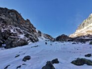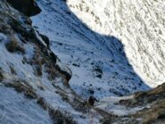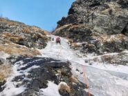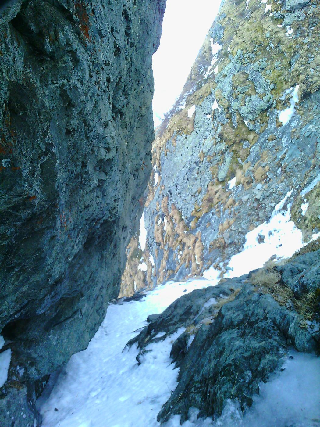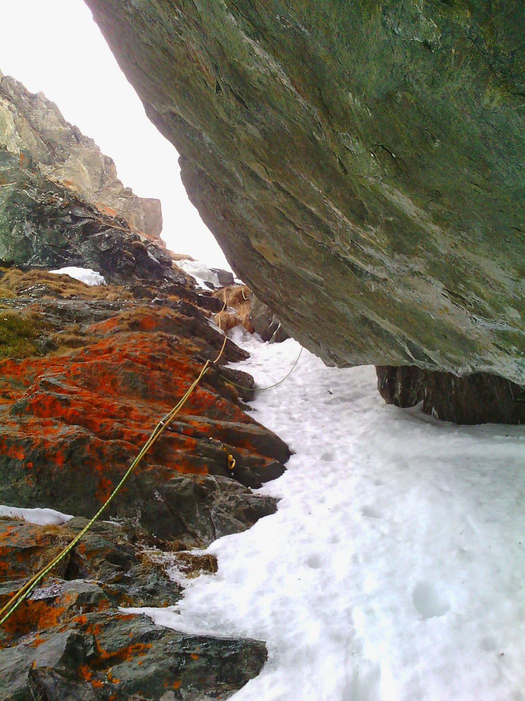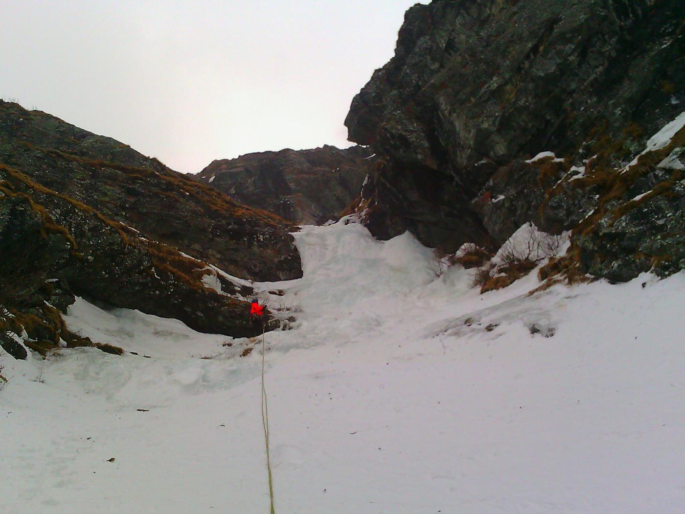 Primi tre tiri da 50m circa a risalti molto omogenei completamente su ghiaccio. La linea si sposta poi a destra sul fondo del diedrone finale (raggiungibile a seconda delle condizioni con un traverso o più in alto con un diagonale), che si segue fino all’uscita, misto neve, ghiaccio, teppa e roccette (un tiro da 50 e uno da 25). Soste attrezzate (S1, S2, S3 sulla sx, S4 a dx), ma misto finale da proteggere. Se si esce sul plateau sommitale a dx c’è un fix con moschettone.