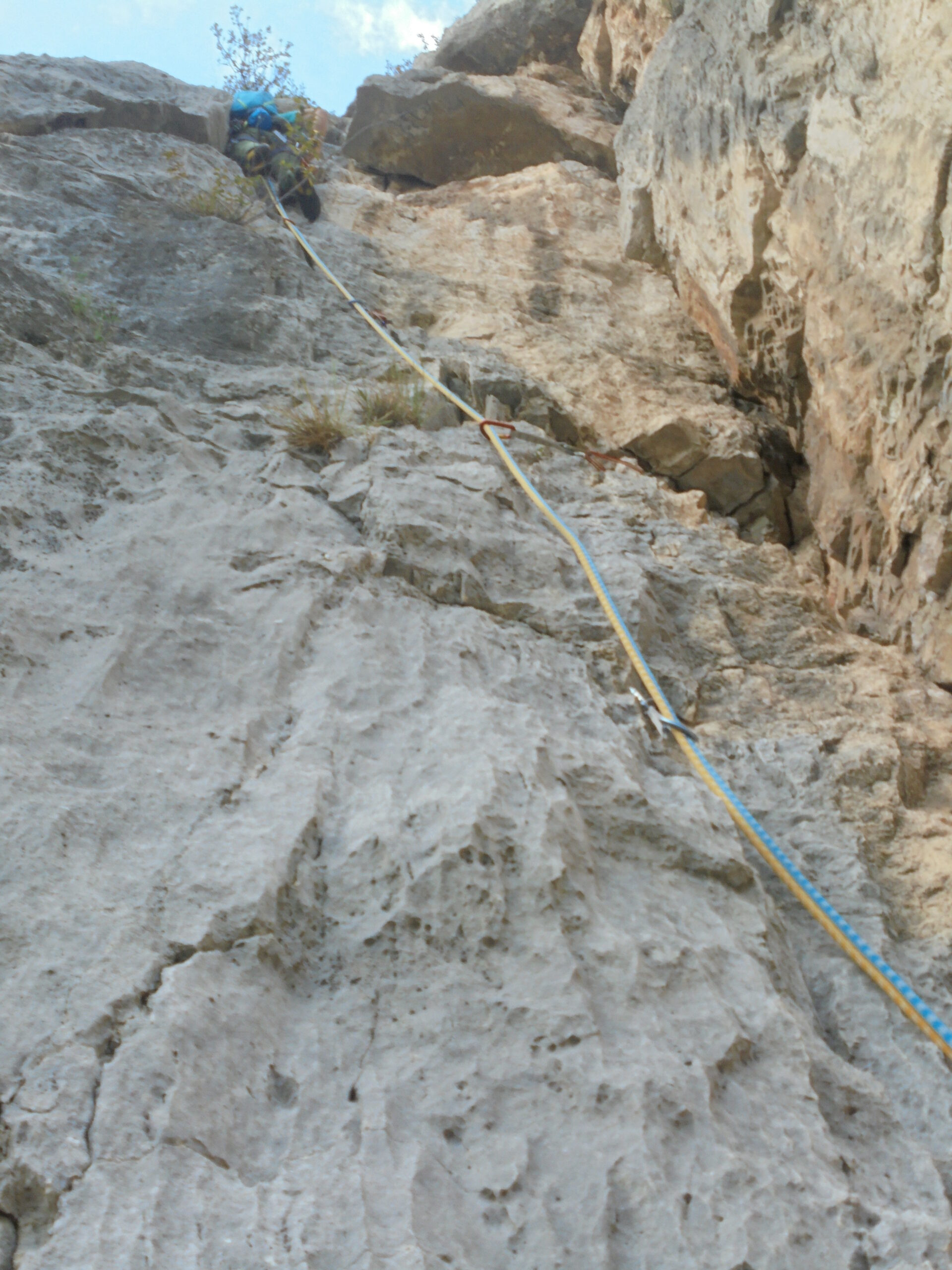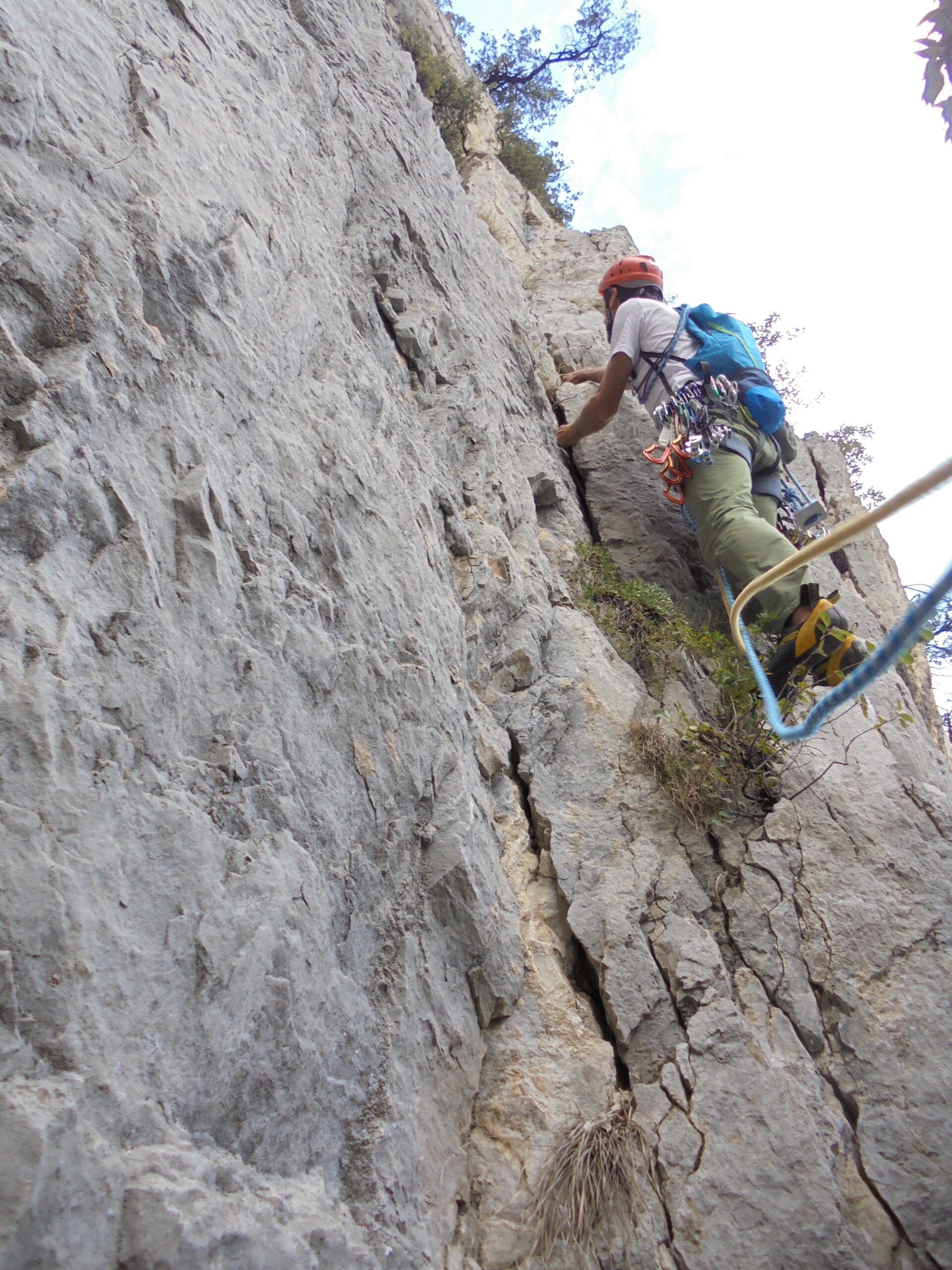 - L2: ignorare la traccia verso destra. Traversare invece a sinistra e salire le facili rocce sino a raggiungere la sommità di un piccolo pulpito dove si sosta (da attrezzare su pianta). 25 Mt., II, III.