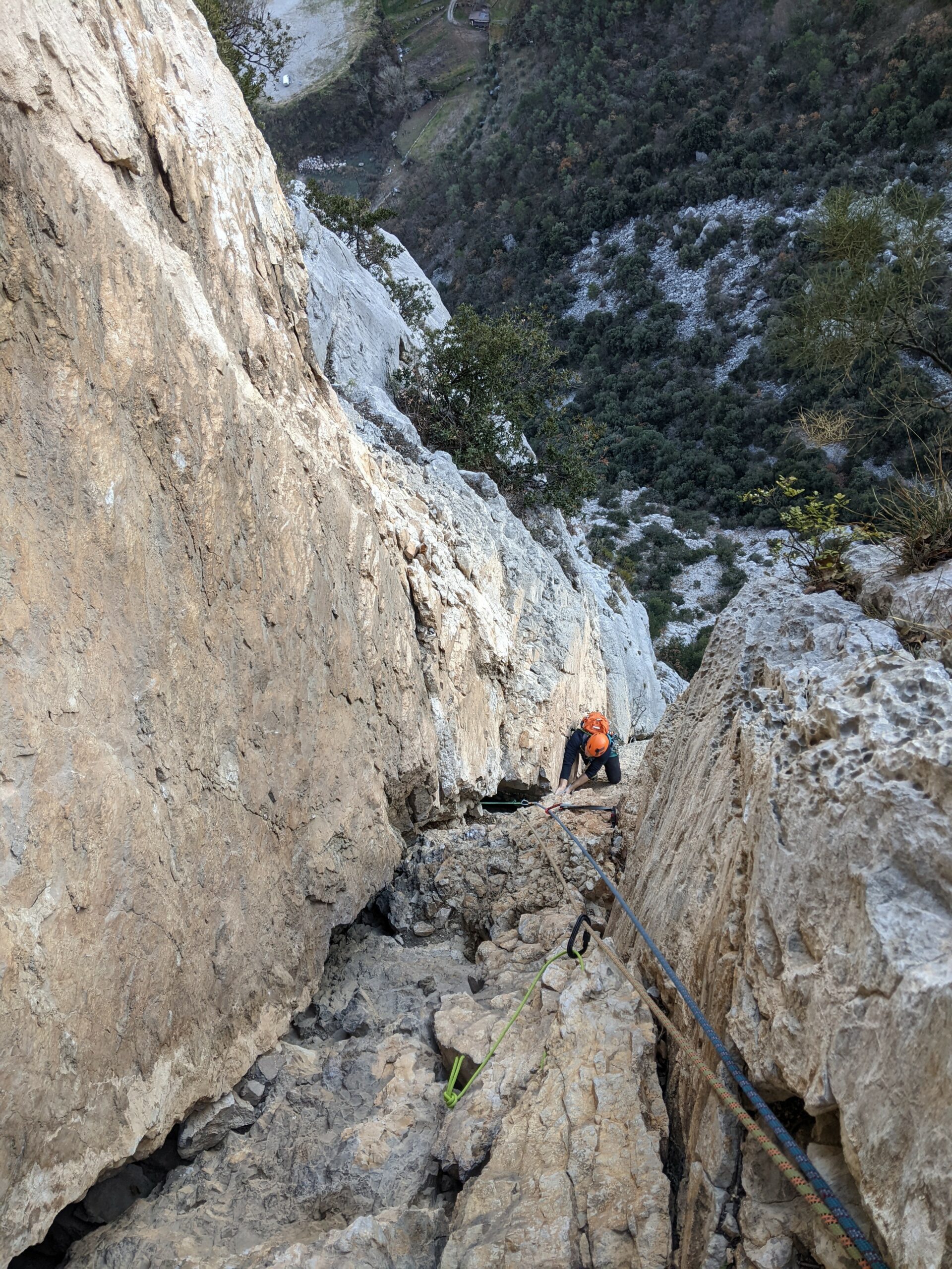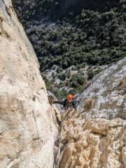 - L3: a destra della sosta per facili rocce entrando nell’evidente diedro-canale. Superare un grosso albero e continuare lungo il diedro sino a raggiungere la sosta (3 chiodi+spuntone+cordone+anello calata) situata su di un piccolo terrazzino a destra. 40 Mt., IV, V, 1 friend incastrato, 1 cordone, 3 chiodi.