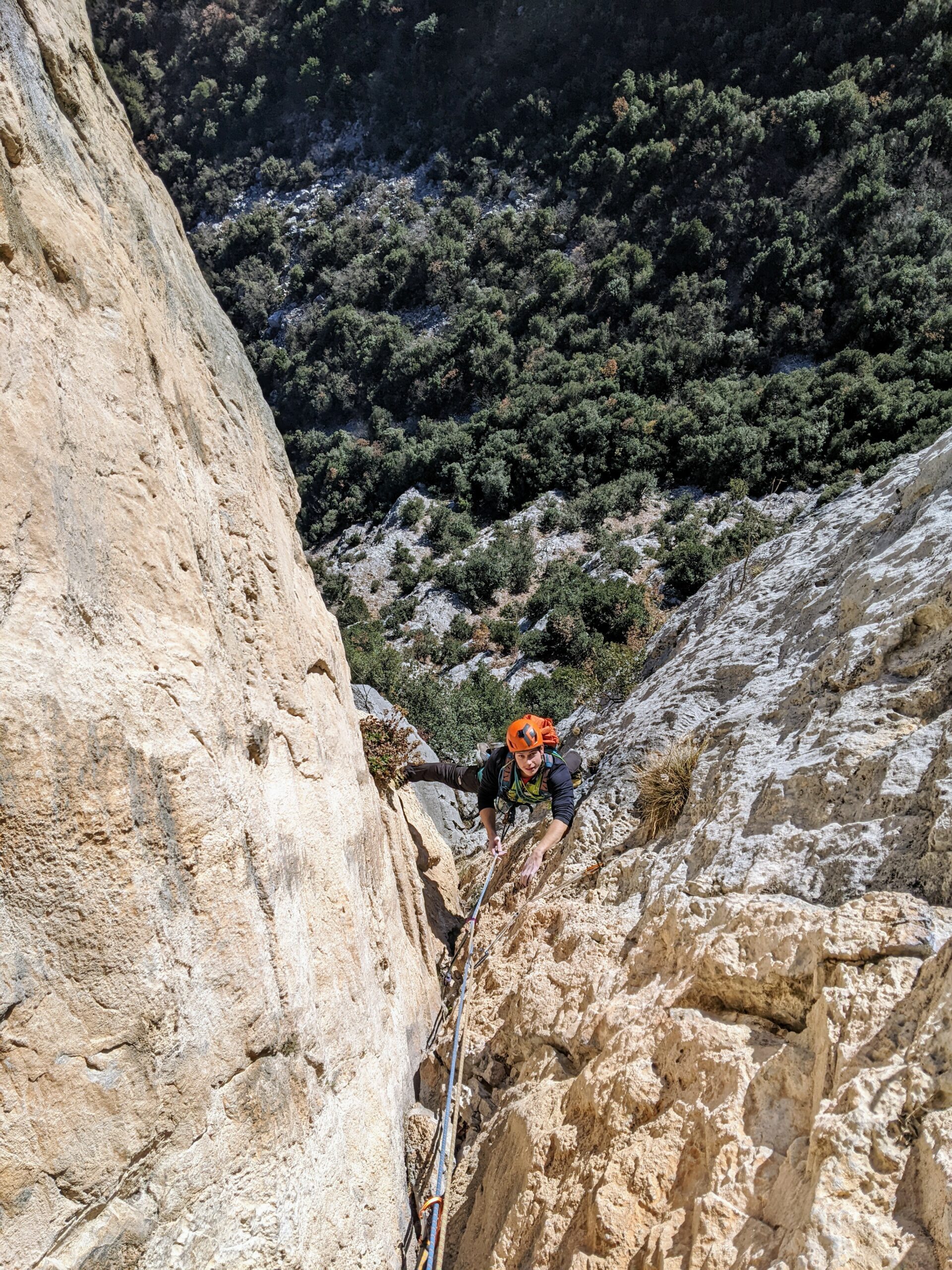- L5: seguire ancora il diedro, uscire a destra in placca per qualche metro (sosta intermedia), poi rientrare a sinistra nel diedro che si segue sino alla sosta (2 chiodi) situata in corrispondenza di una nicchia. 35 Mt., V+, 3 chiodi, 1 dado incastrato, 1 sosta intermedia (3 chiodi).