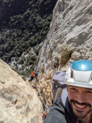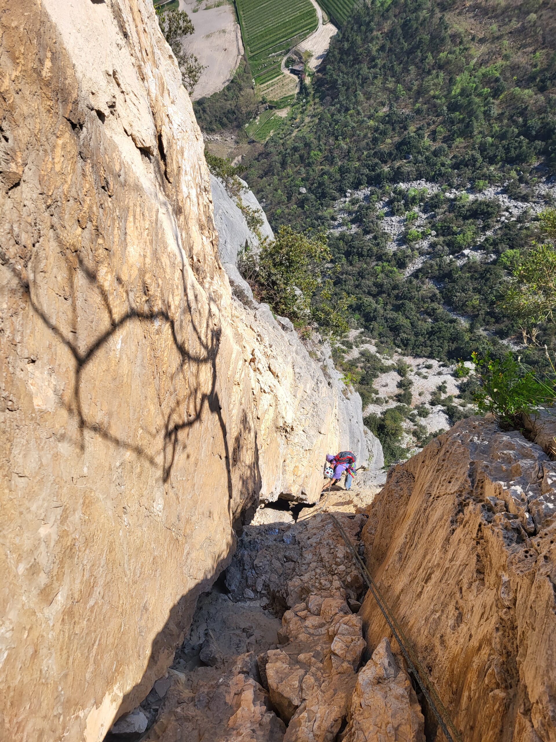 - L8: a sinistra della sosta per spigolino e successivamente placca. Traversare brevemente a destra imboccando il diedrino al termine del quale si obliqua a sinistra sino al boschetto sommitale dove si attrezza l’ultima sosta. 55 Mt., V+, IV, 3 chiodi, 2 radici con cordone.