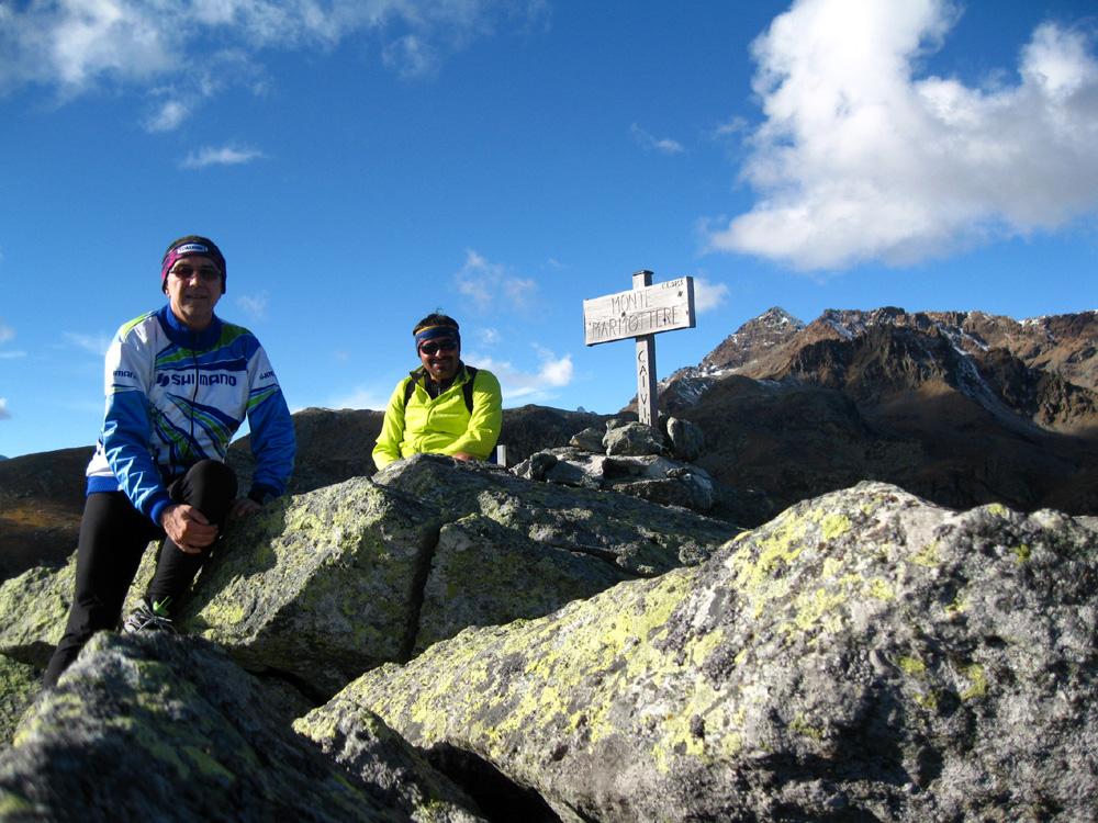Partiti dall’Alpe Bianca. Giornata stupenda con temperatura ottimale. Condizioni fisiche non tanto; salito pedalando e camminando. Dal colle raggiunto il Monte Marmottere. A poche centinaia di metri dalla fine caduta… ginocchia ammaccati. La mtb farà per me?????????? Discesa lungo la sterrata. Con Maurizio in ottima forma.