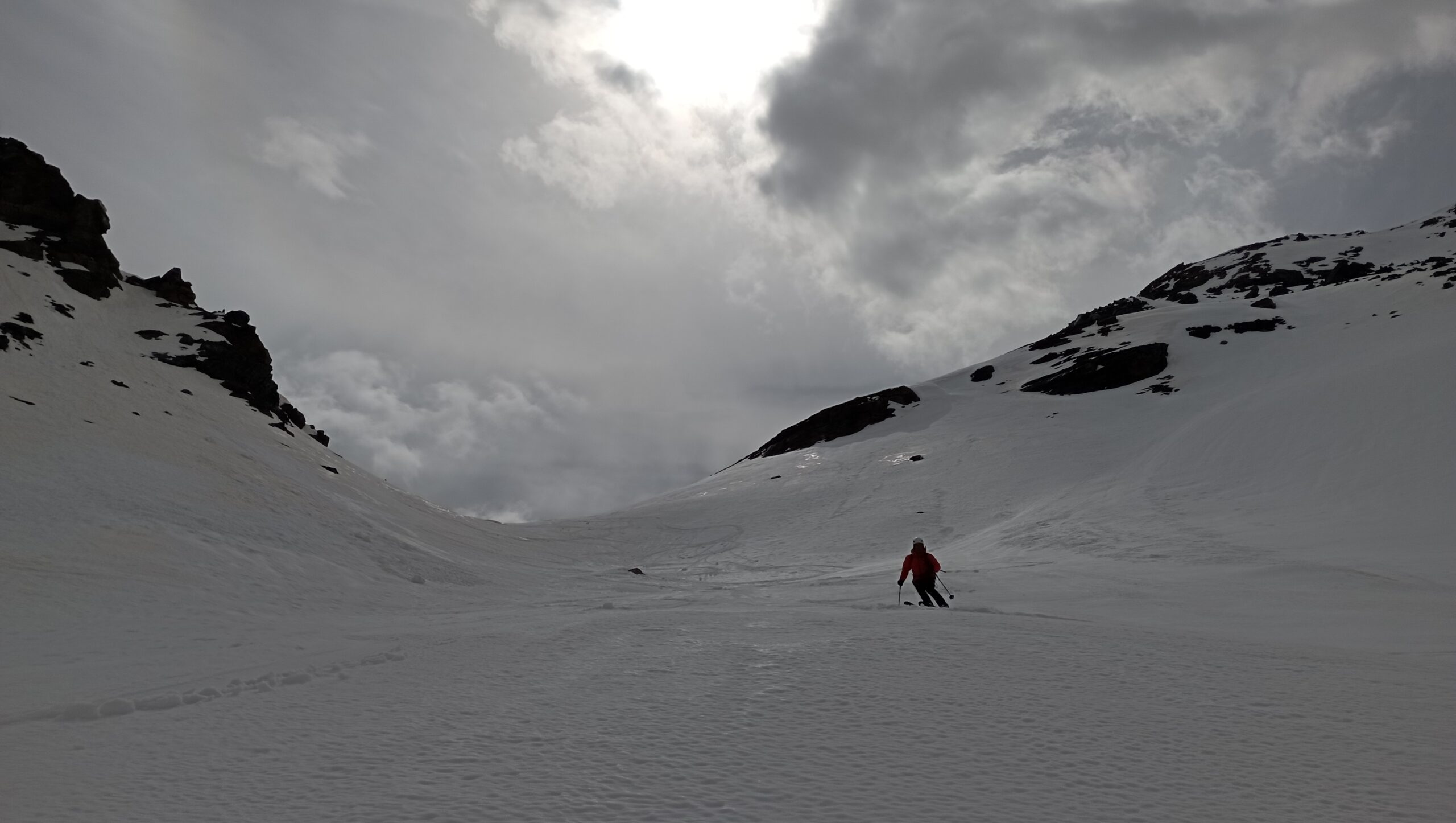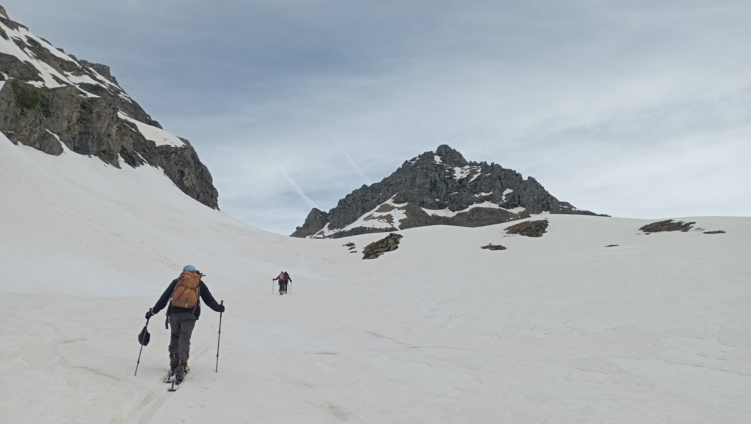 Dal pianoro di queste bergerie i pendii cominciano nuovamente ad impennarsi e si punta verso il colle del Sabbione (2560 m). Dal colle ci si dirige verso sinistra per raggiungere Punta Pian Paris (2738 m), si può tenere in gran parte la dorsale in condizioni ottimali o meglio il pendio, perdendo magari anche un po’ di dislivello se la neve è troppo dura.