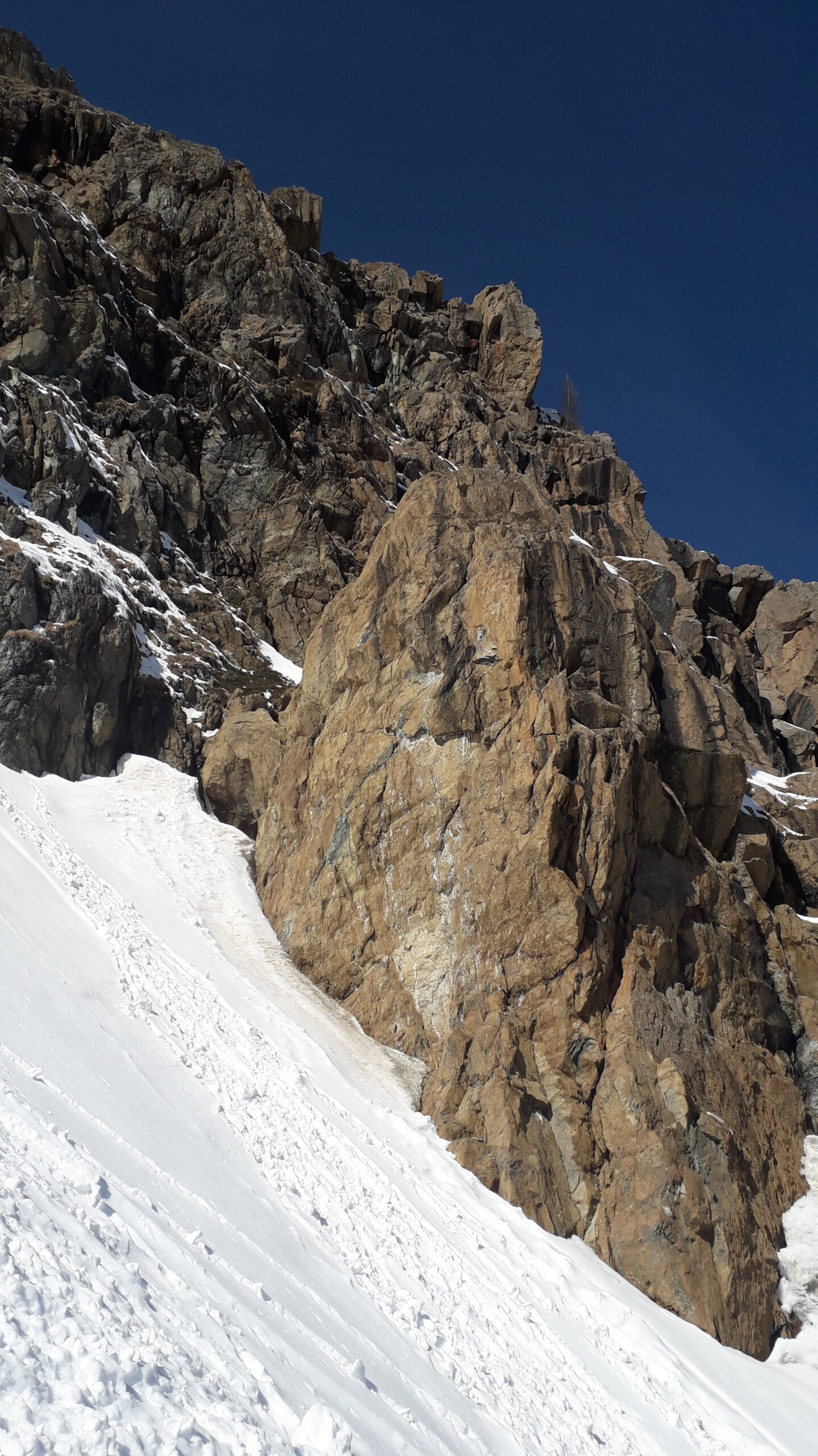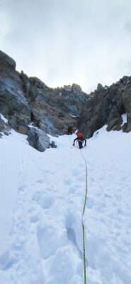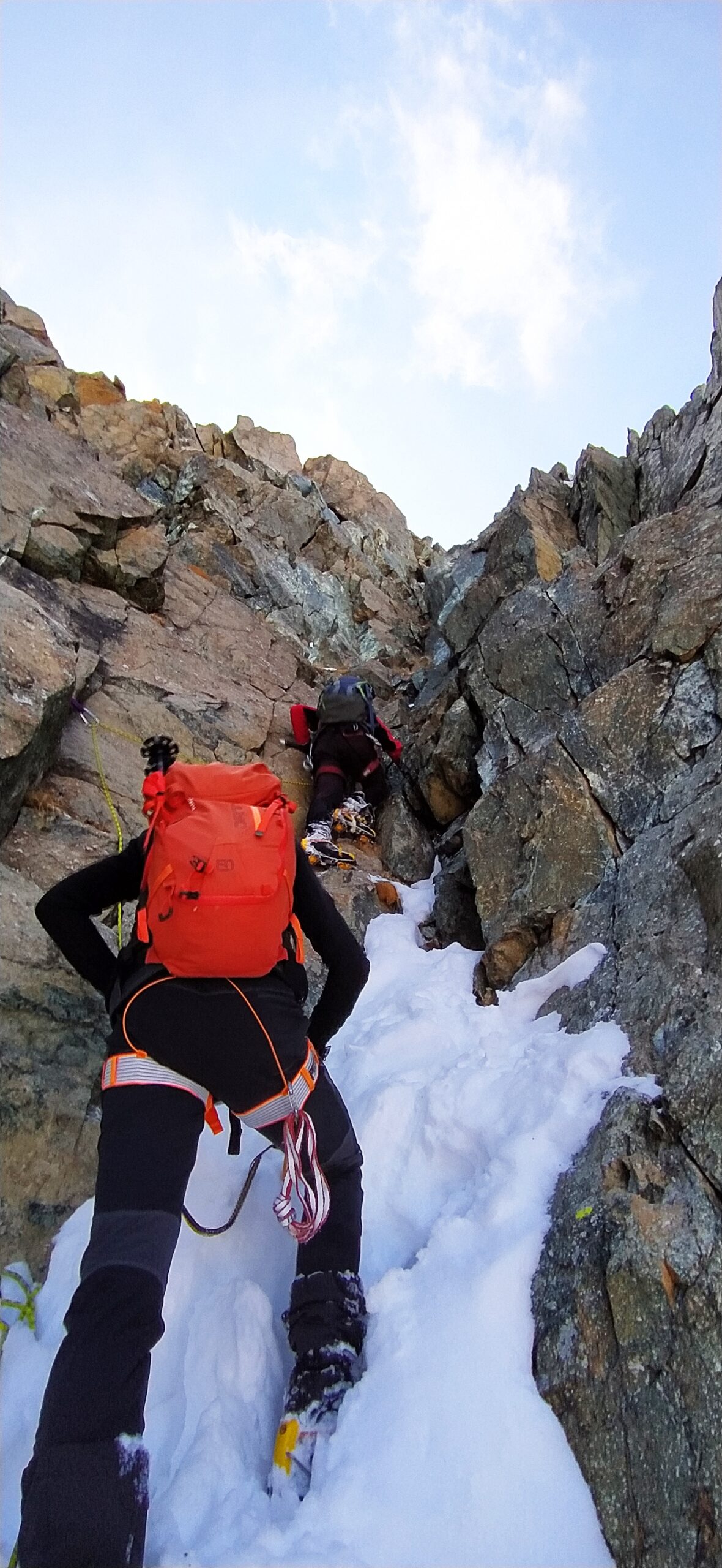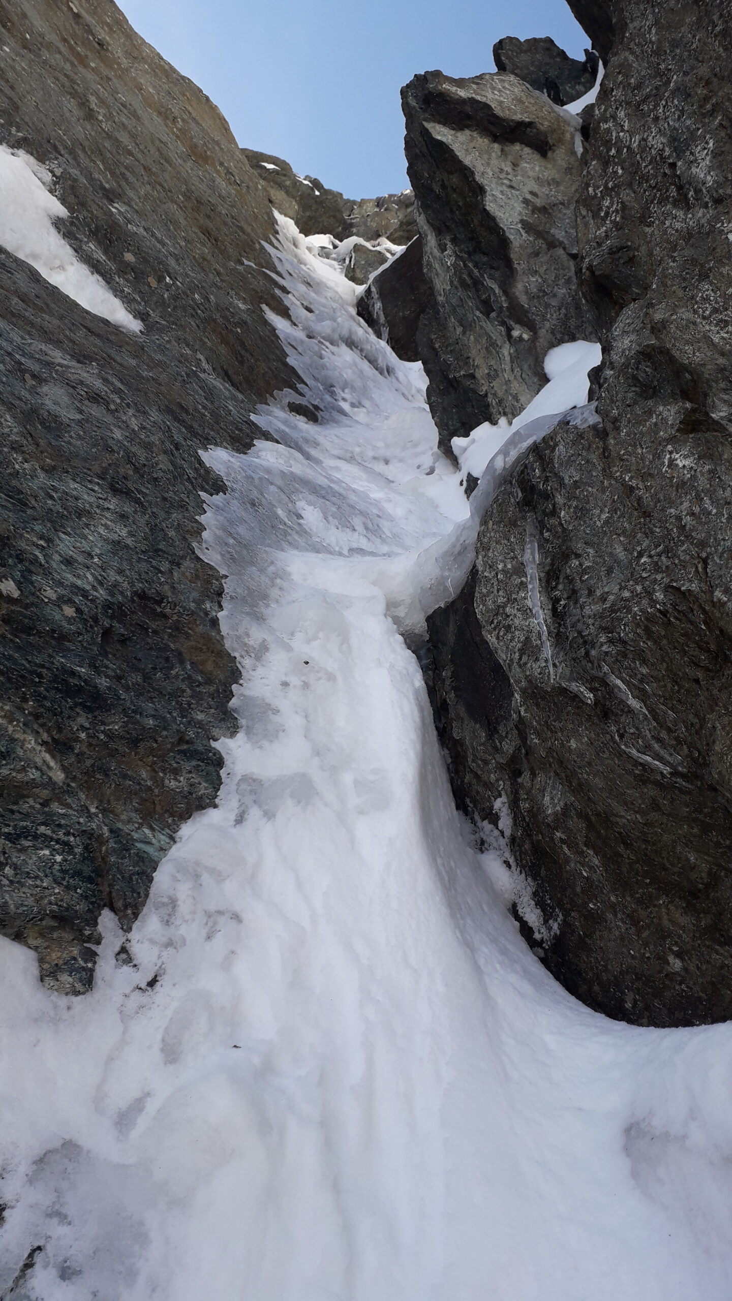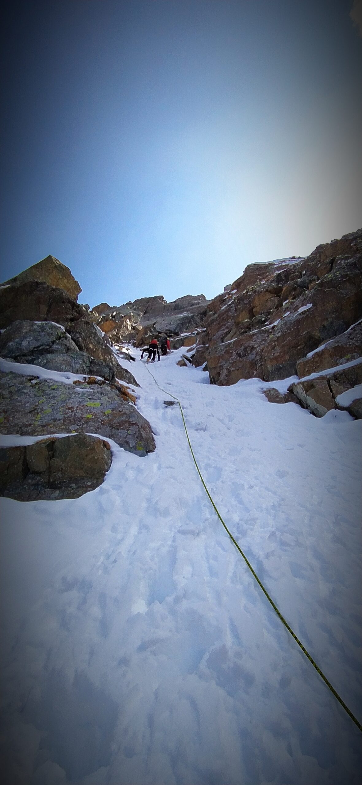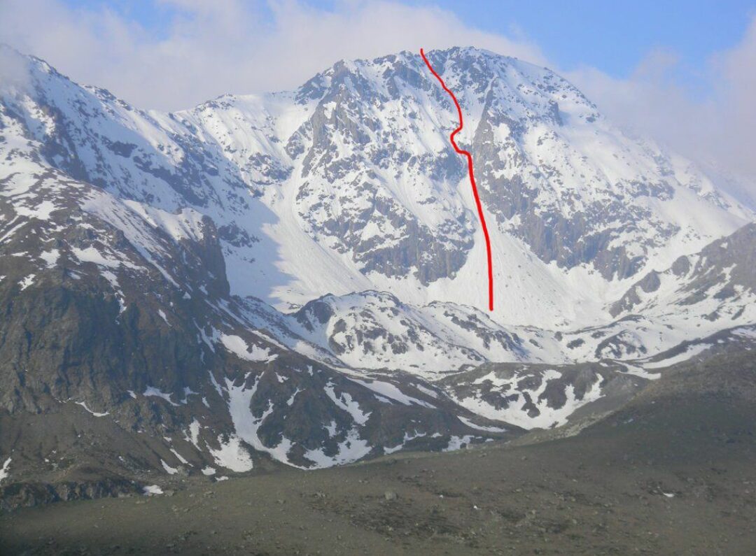 Risalito il conoide a quota 2200 si trova la prima difficoltà. Un salto di roccia che si passa con un tiro di corda da 20 metri. Protezioni buone. Poi si prosegue sul pendio fino ad una zona di rocce scure che si evitano con traverso a sx . Dopo su percorso più lineare si sale fino all’ultimo salto roccioso facile di 15 metri circa. Giunti alla cresta finale si arriva in vetta.