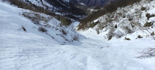 Saluti dalla “diretta” approfittando del canalone basso già ben pieno di neve (e di precedenti scariche) la parte bassa è comunque già abbastanza rovinata dall’acqua del torrente e costringe ad un paio di deviazioni.