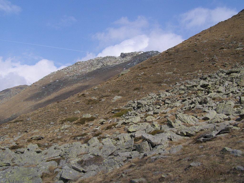 Si sale lungo ripidi pendii erbosi intervallati da pietraie instabili, e solo in prossimità del passo si rintraccia il sentiero vero e proprio con anche qualche tacca di vernice. Dal colle 2330 m. si continua a sinistra, o per cresta (tratti rocciosi con divertente arrampicata) oppure con meno difficoltà qualche metro sotto, tra massi accatastati e labili tracce di sentiero che attraversano ripidi prati, in ogni caso si deve puntare a raggiungere un grosso ometto ben visibile anche da lontano. Raggiuntolo appare finalmente la cima, e senza percorso obbligato la si raggiunge, aggirandosi tra rocce instabili e grossi massi accatastati. In vetta alcuni ometti e un triangolo del cai di Rivarolo.