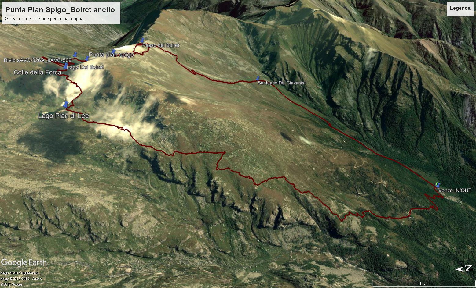 Proseguire sul sentiero AVC 326A dietro al santuario fino a raggiungere dei muretti di pietre dove si individuerà la traccia evidente che conduce, superando nella parte finale una pietraia “ricondizionata” a sentiero, fino al passo del Boiret. Da qui svoltare a sinistra in direzione ovest e risalire in lunga linea obliqua districandosi al meglio tra massi scomposti e deboli tracce fino ad una gobba con 4 evidenti lose verticali. Da qui proseguire sempre con attenzione e al meglio su percorso accidentato tra lastroni e massi evitando sempre di salire in cresta per non finire sul salto di roccia di 20 mt; da qui raggiungere un evidente “bun om” grosso ometto e svoltando in salita traguardare la vetta contraddistinta da una anticima e con facile raggiro raggiungere le roccette per la vetta con bastone di segnalazione. Per il ritorno al passo è possibile individuare dopo il “bun om” una traccia che al meglio tra pietraie riconduce al passo del Boiret. Scendere ora l’evidente traccia dopo il passo del Boiret e seguirla superando l’omonimo lago fino al cartello in lamiera che indica il sentiero AVC 509 per il passo della Forca. Raggiungere e scendere oltre il passo ammirando ora il sottostante lago pian di Lee che si raggiunge in breve sul sentiero AVC 325. Scendere da qui per l’alpe di Pian di Lee sull’evidente sentiero 325 (segnavia bianco-rossi di nuova pittura) senza mai abbandonare la traccia fino alla gobba della croce di Chialamberto e poi giù fino alla bella borgata di Chiappili. Superata quest’ultima raggiungere Vonzo sulla strada agro-pastorale o in alternativa “tagliare” per il sentiero 325 che prosegue in bel bosco di faggi fino al punto di partenza.