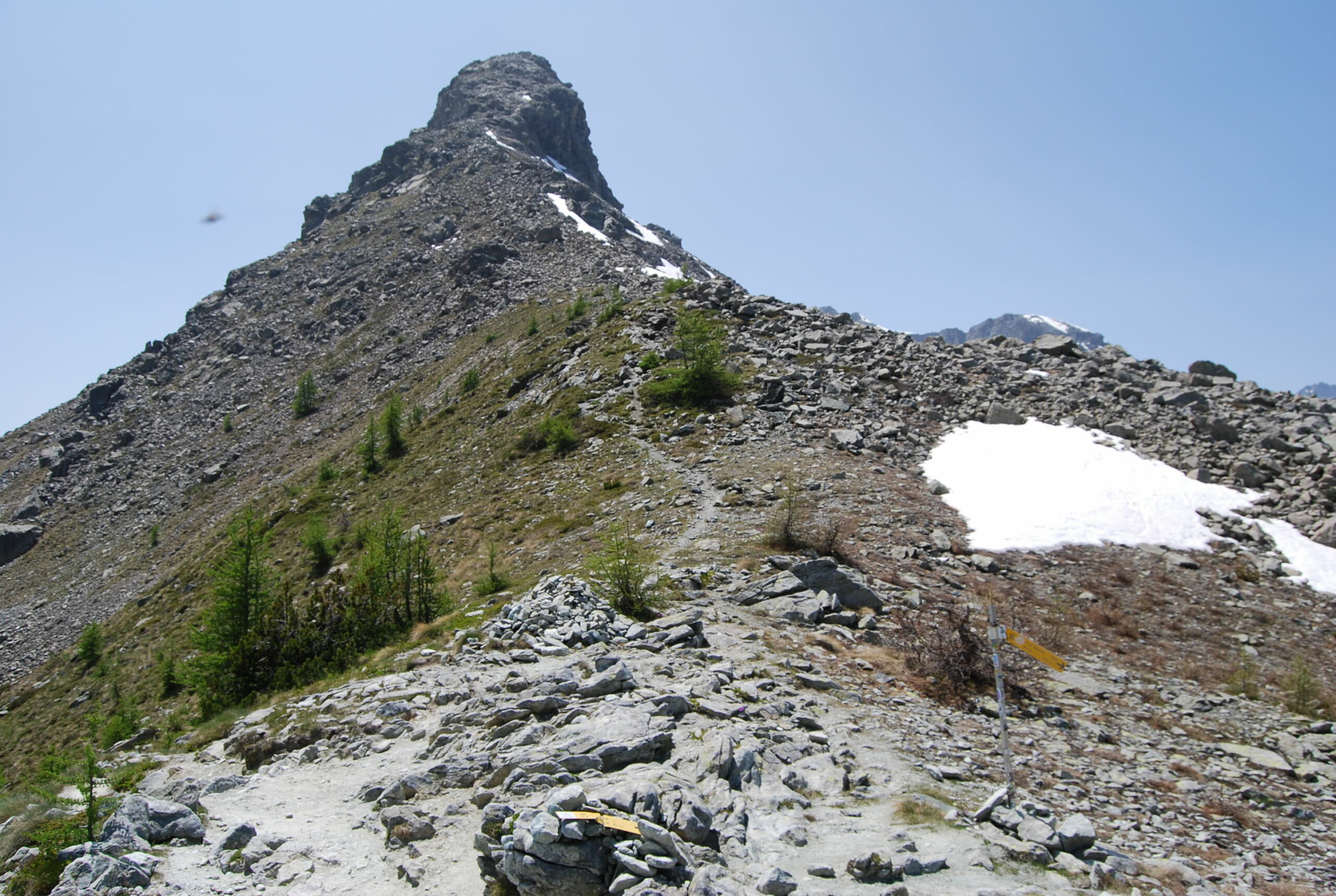 In discesa seguire la marcata traccia che riporta sul 102 e continuare a raggiungere il Col de la Croix (2286 m) dove si hanno due possibilità: