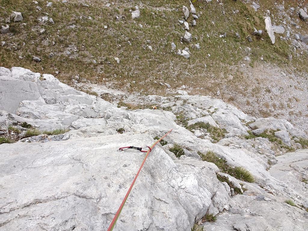 Arrivati alla sopra le rocce i segni spariscono e si deve andare un pò a intuito verso l'alto tra canale pietroso e bosco con foglie scivolose fino a un certo punto ritrovare i segni sulla spalla che è in linea con le rocce sotto da dove sian partiti.