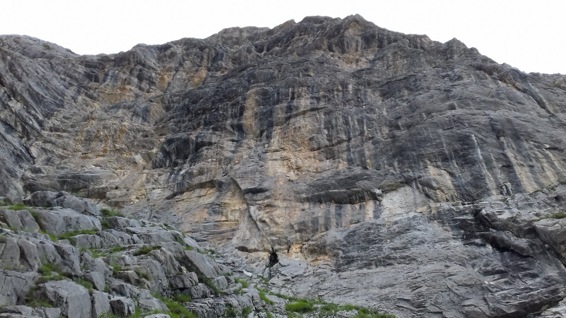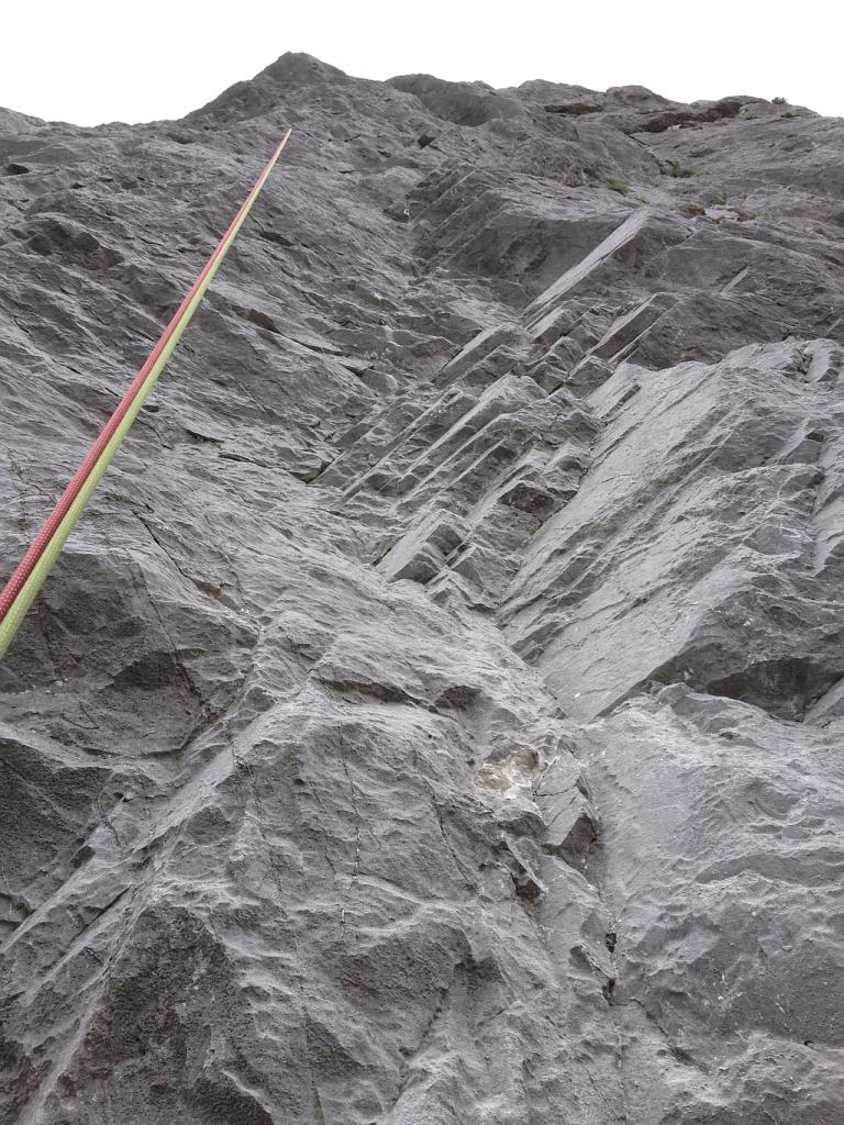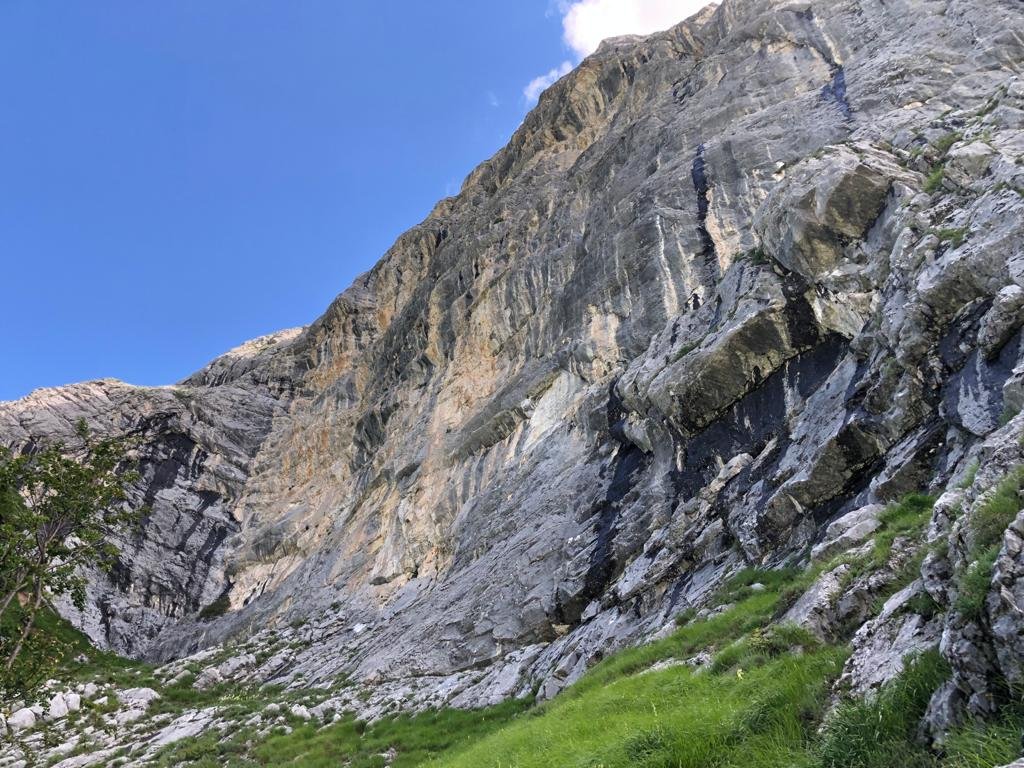 Seguendo il sentiero segnato con ometti proseguire a destra e superare il rio che viene dal famoso intaglio eneorme di rocce da cui è scesa una valanga che ha divelto evidenti gli alberi sull'altra parte di tale rio (asciutto). Il sentiero segue la parete pre aggirarla prima sale poi scende e poi risale per finalemnte arrivare alle pareti!