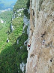 Fatta la prima parte di “Menti perdute”, al 3° tiro, prima della sosta all’erosione, ho attraversato decisamente a sinistra raggiungendo la 3° sosta di “Catarifrangente”, 70m (ultimi metri in conserva). Da lì si parte per la via… Questa è risultata un’ottima soluzione che mantiene freschi per i tiri impegnativi della via. Ricordarsi che il traverso sopra l’erosione è quello più basso! Penso che questa sia senza dubbio la più bella via che abbia fatto al paretone…