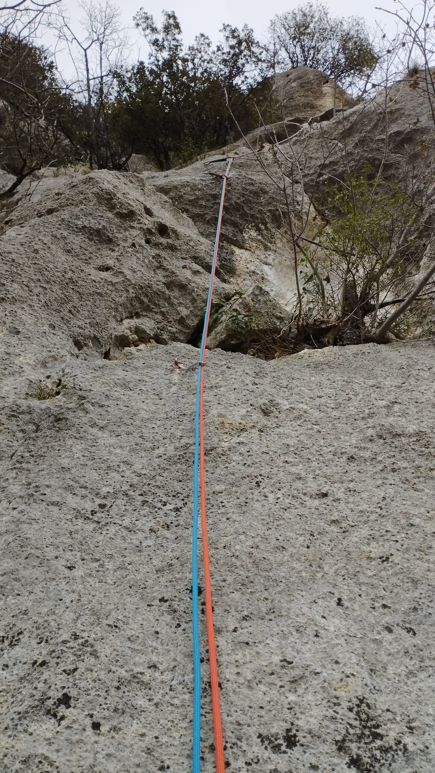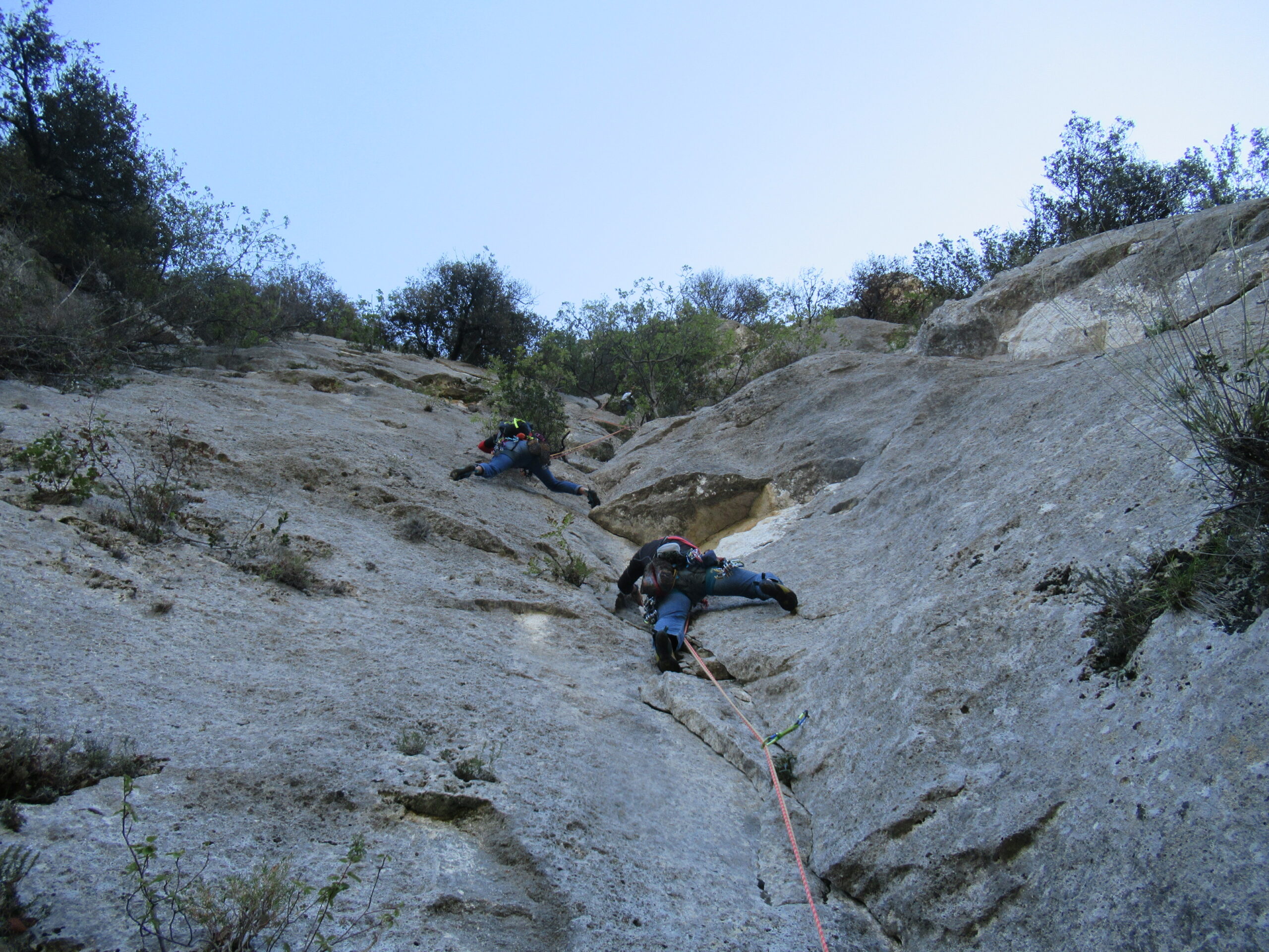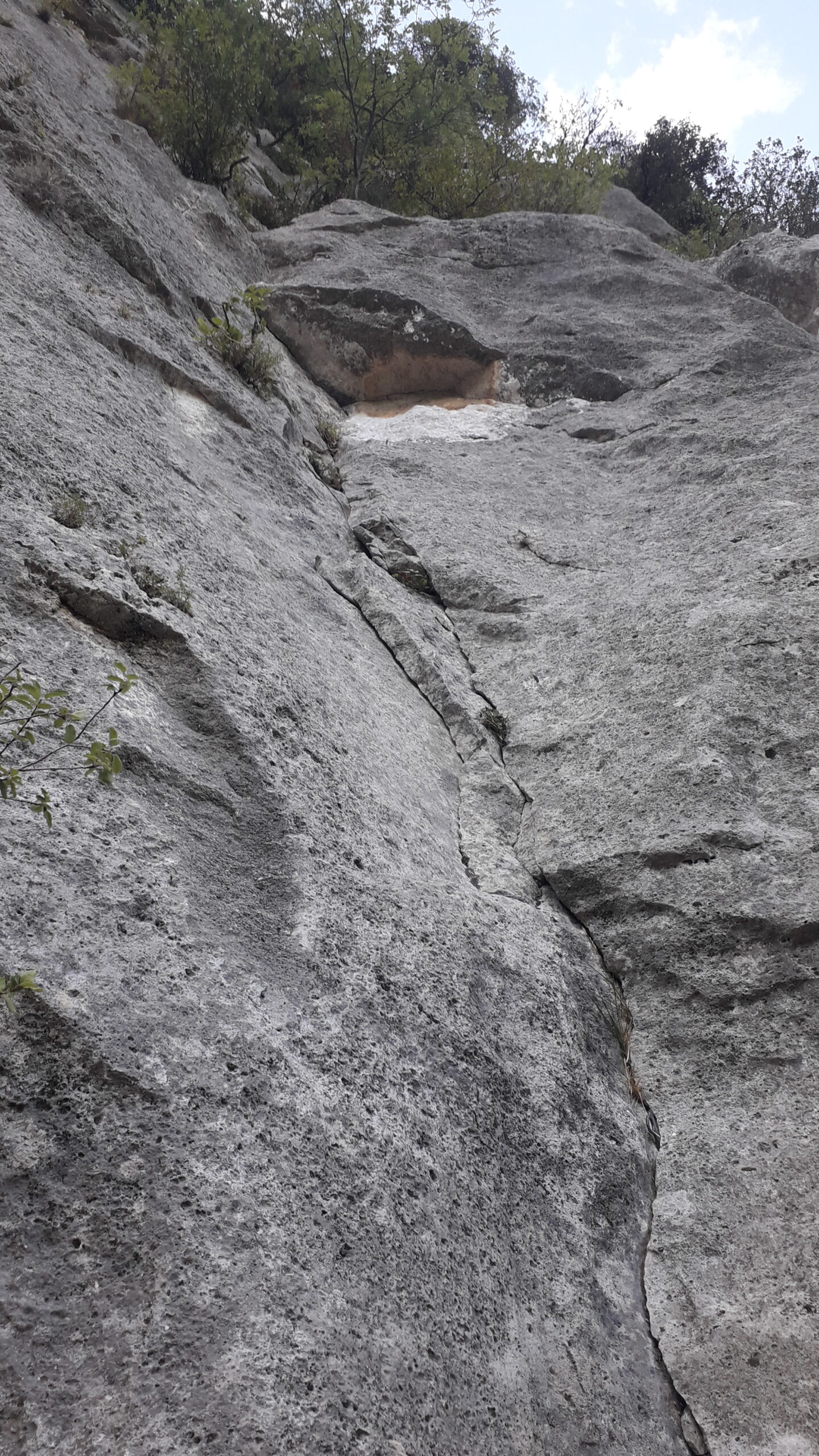 - L2: 6a+ seguire il diedro tecnico immediatamente a destra della sosta poi rocce articolate 30m (resinati + cordoni), sosta posta sulla destra di una piccola grotta, catena in una clessidra