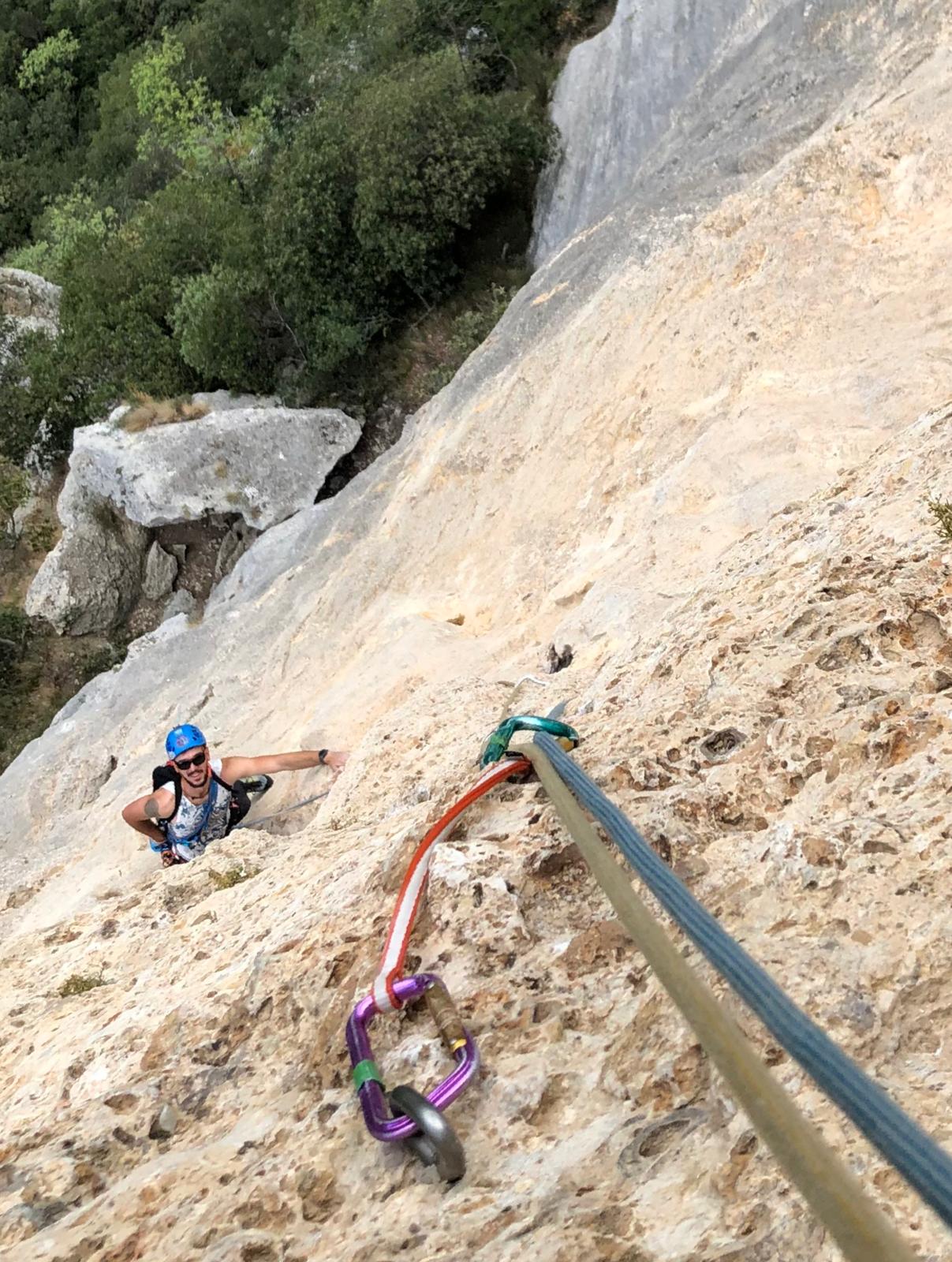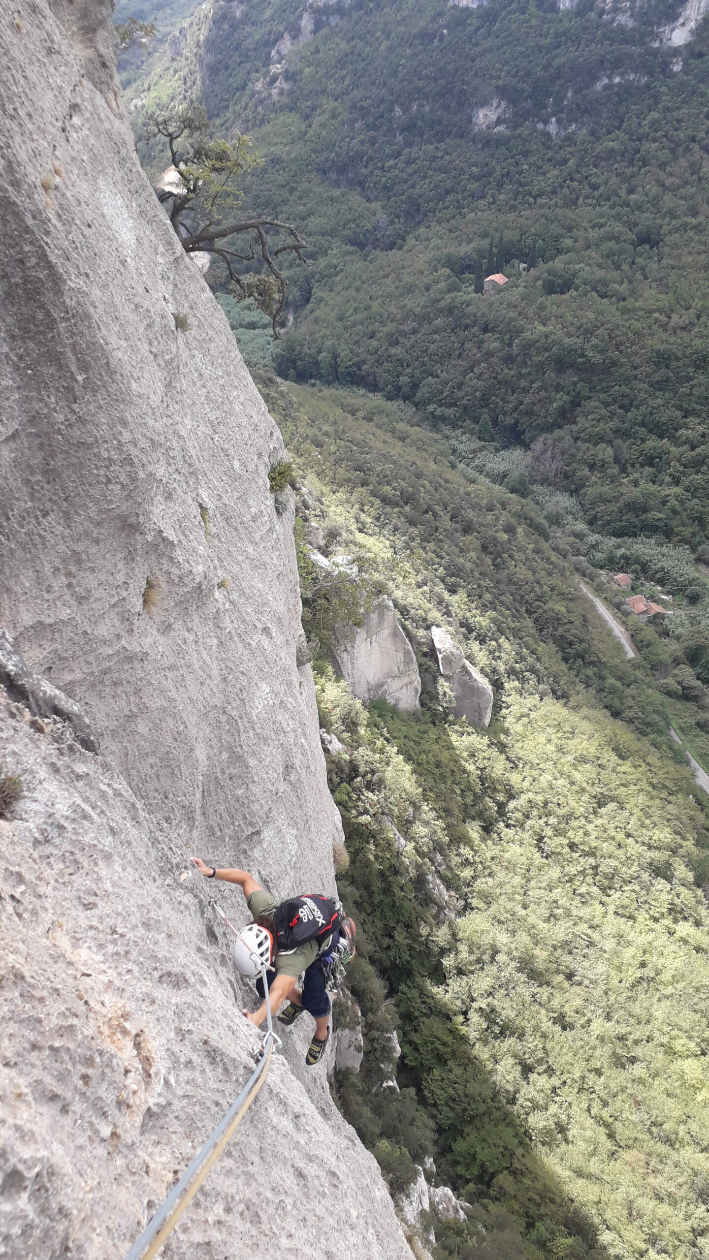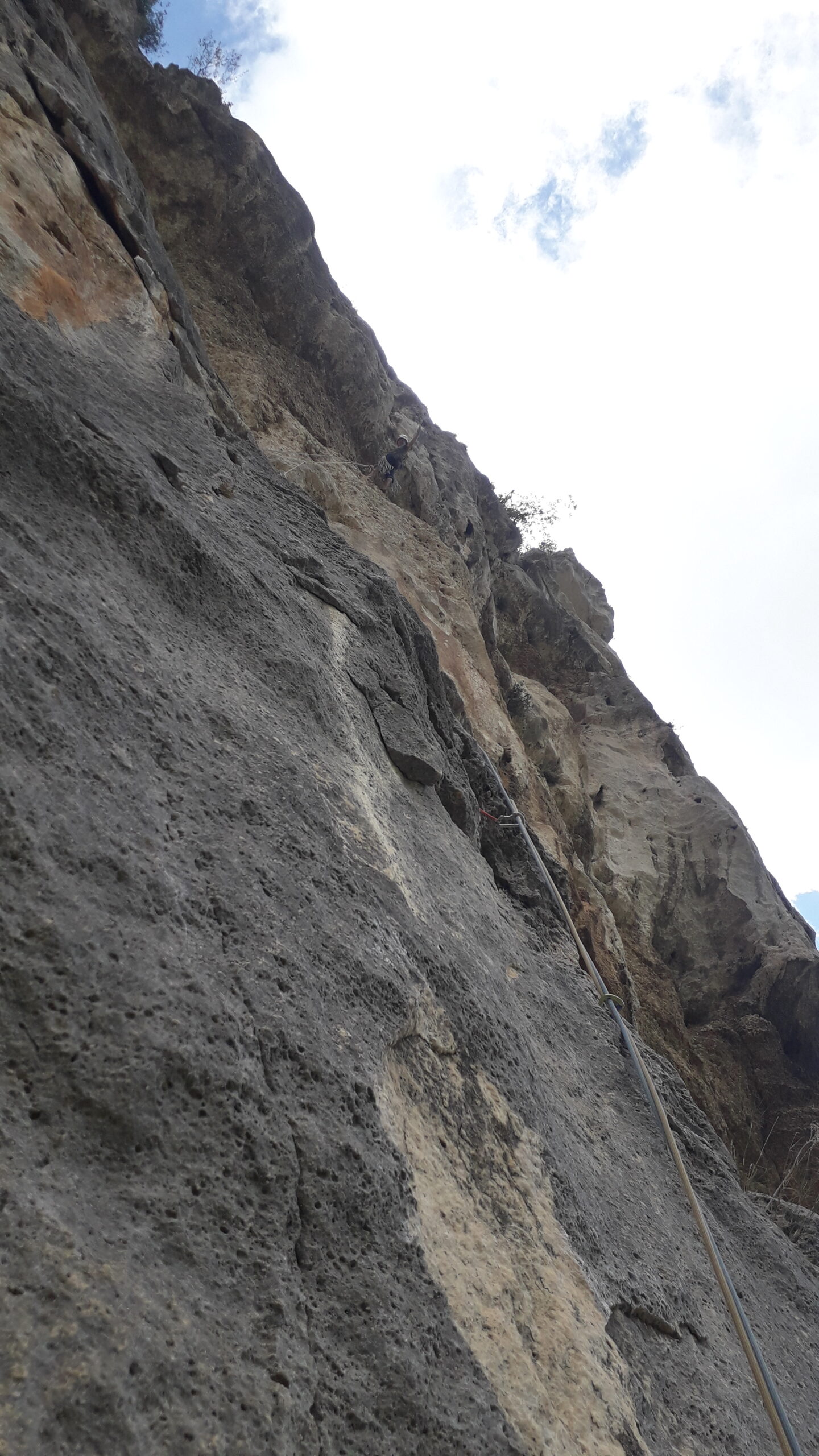 - L5 6b superare il tetto e continuare su muri grigi con arrampicata di continuità. 30 m (Tiro bellissimo e fisico) sosta spostata leggermente a sinistra rispetto alla linea di salita sotto un lettino, resinati da collegare.