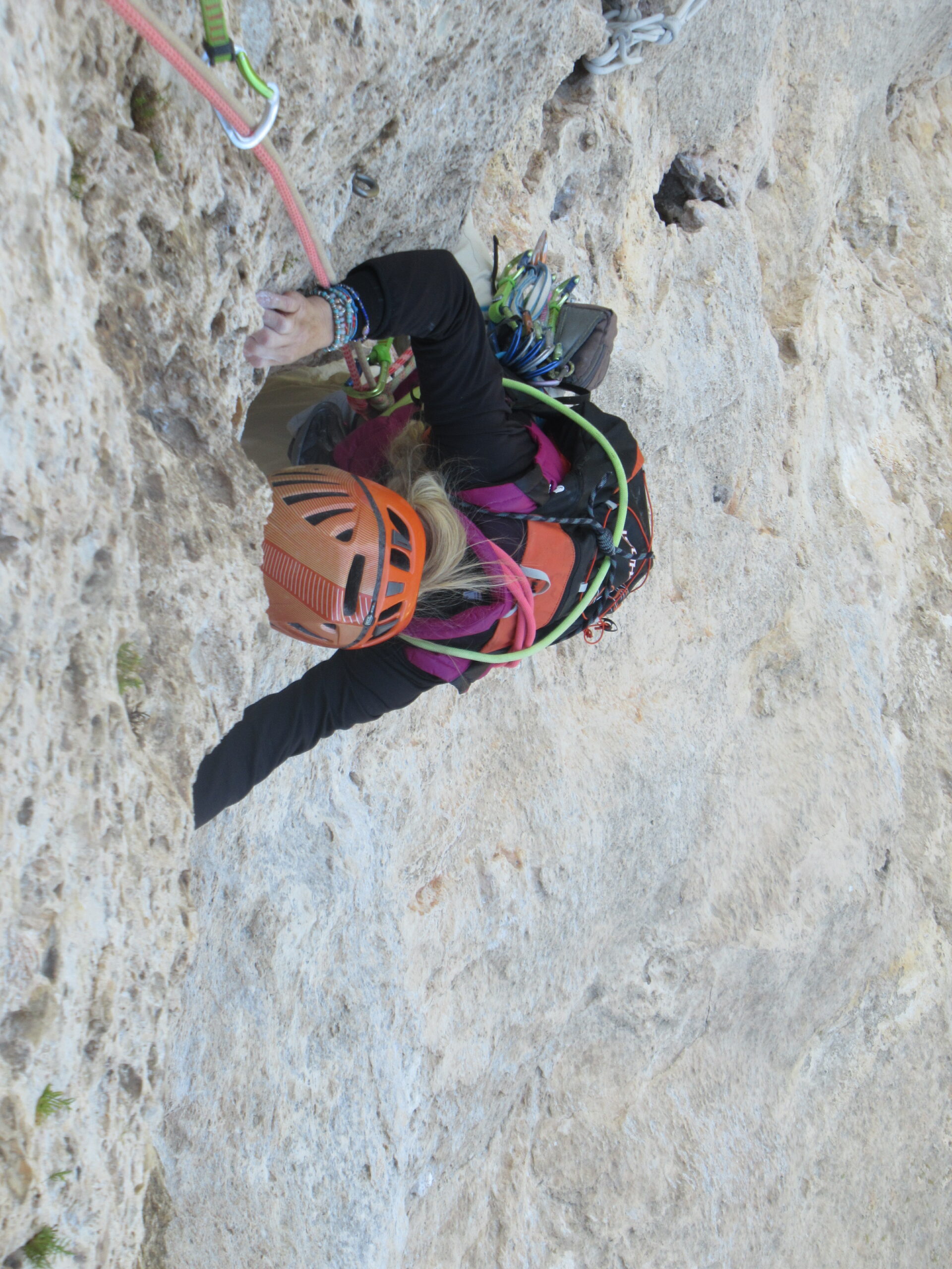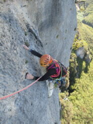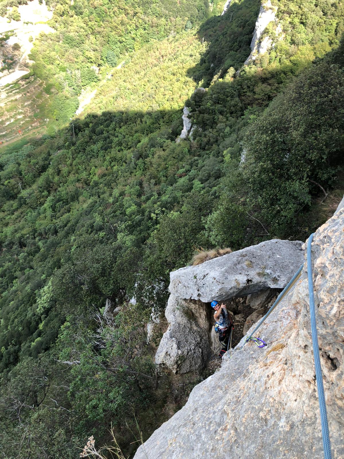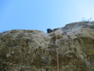 - L3 5b alzarsi a destra della grotta e proseguire nel diedro, proseguire fino alla cengia dove si trovano due piedini, salire quello di destra fino ad arrivare ad un grosso masso staccato passarci in mezzo 35m, sosta con catena su comodo terrazzo.