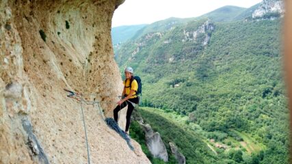 4 tiro passo chiave su tacchette dopo 5 metri,in libera sul 6a obbligato e poi cavalcata epica su spettacolare muro eroso e ben ammanigliato, con traverso finale