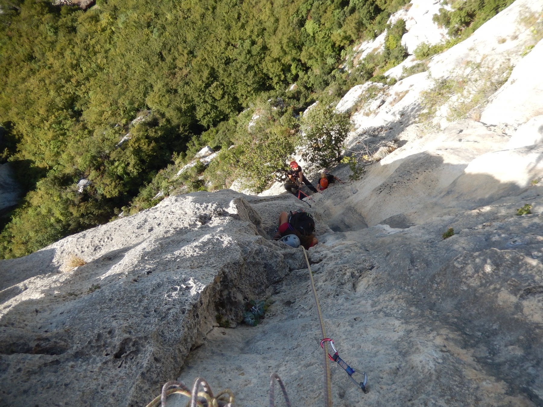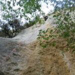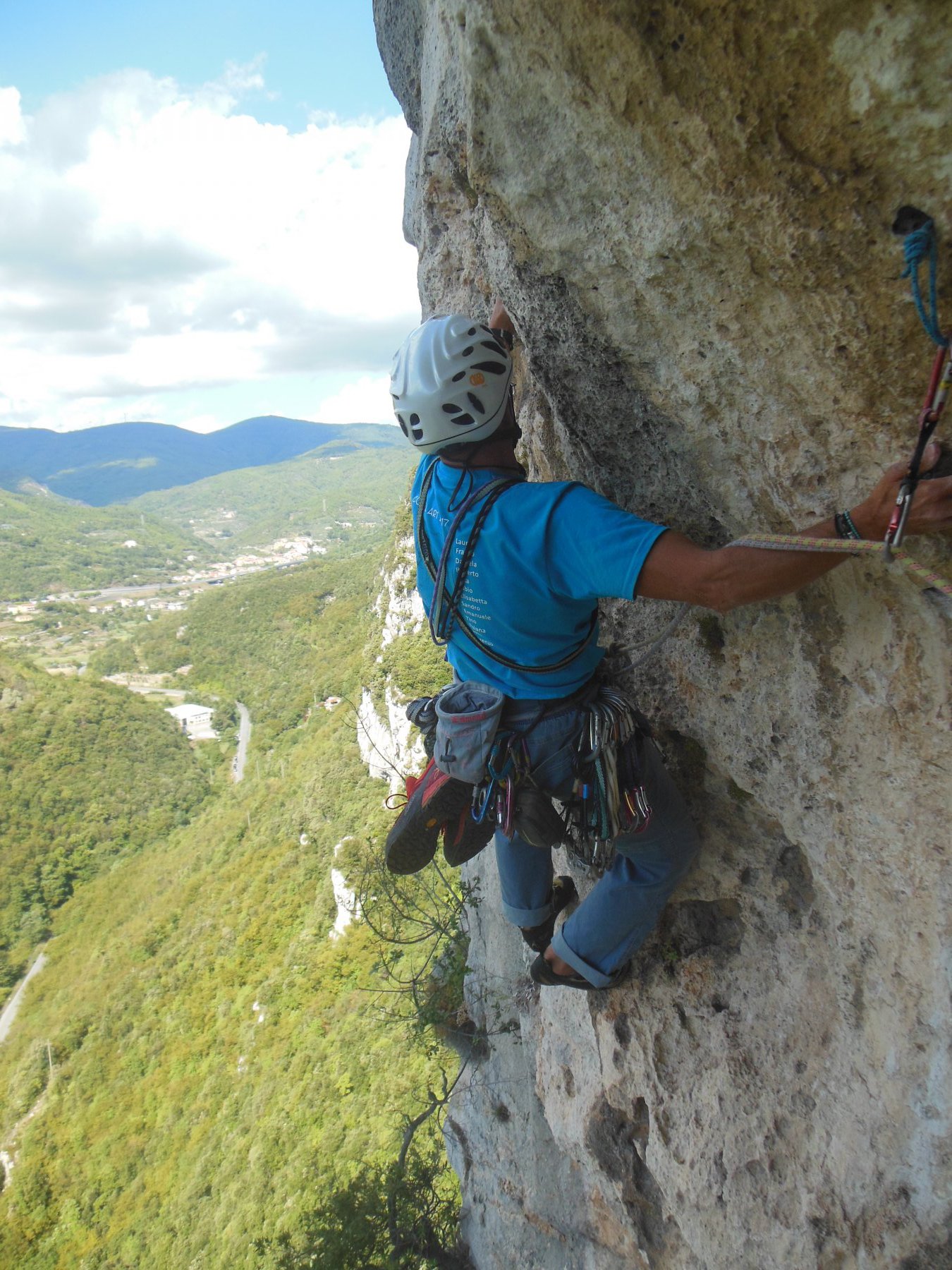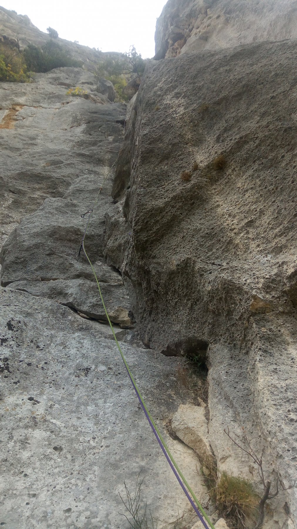 L5: continuare lungo il diedro a sinistra della sosta fino a raggiungere una grotticella (4b/c all’inizio poi 3c/4a) dove si sosta. 15 m S5 su tre anelli resinati