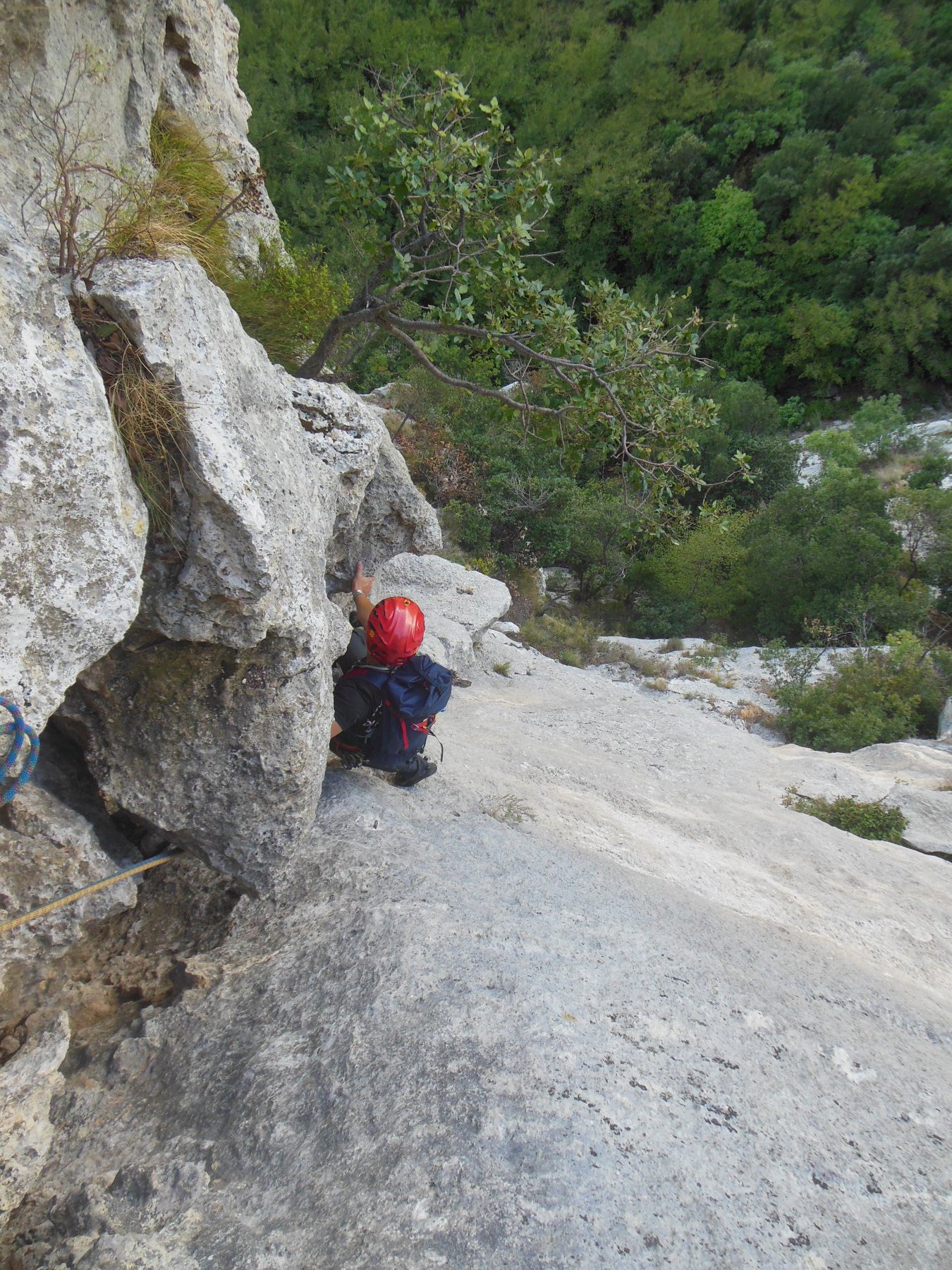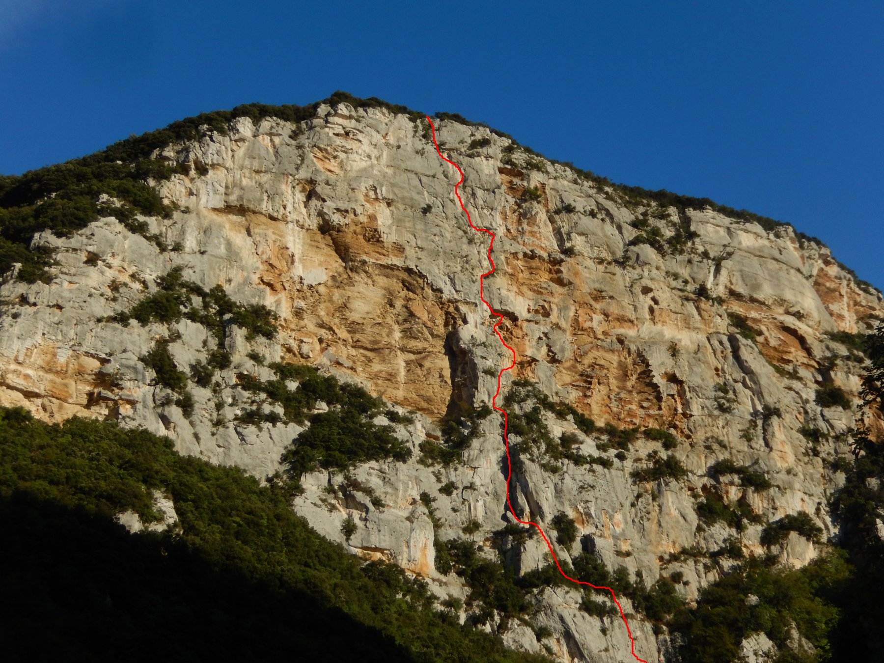 L11: da qui due possibilità: o proseguire dalla sosta verticalmente lungo delle lame disturbate da qualche alberello (3a) arrivando così alla fine della via (20 m.S11), oppure, sempre dalla sosta, poggiare subito verso destra e salire in placca verso un vecchio chiodo (4c), salire diritti lasciando un alberello a sinistra, e, superato un ultimo muretto verticale (4b, clessidre), giungere sul pianoro sommitale. 20 m. S11 sosta su alberi.