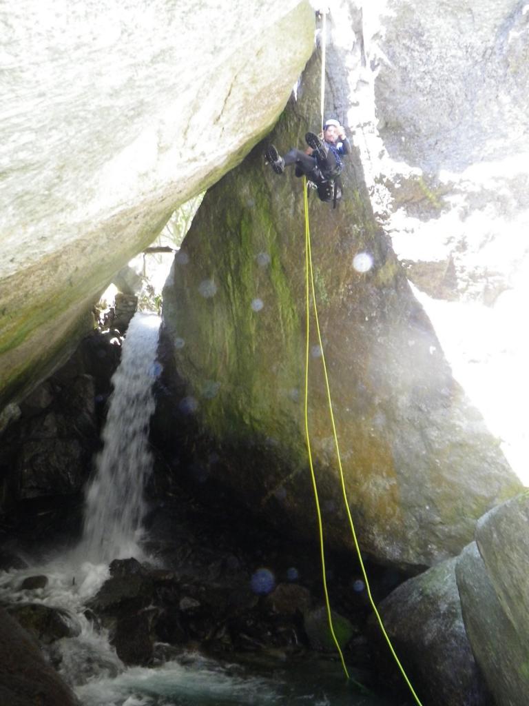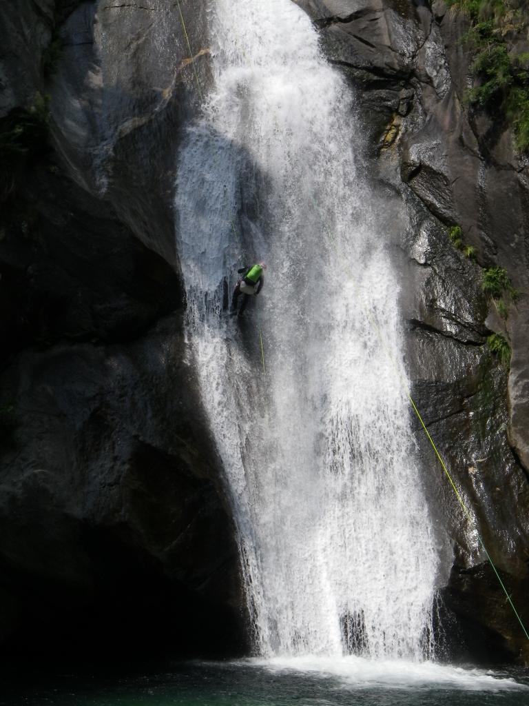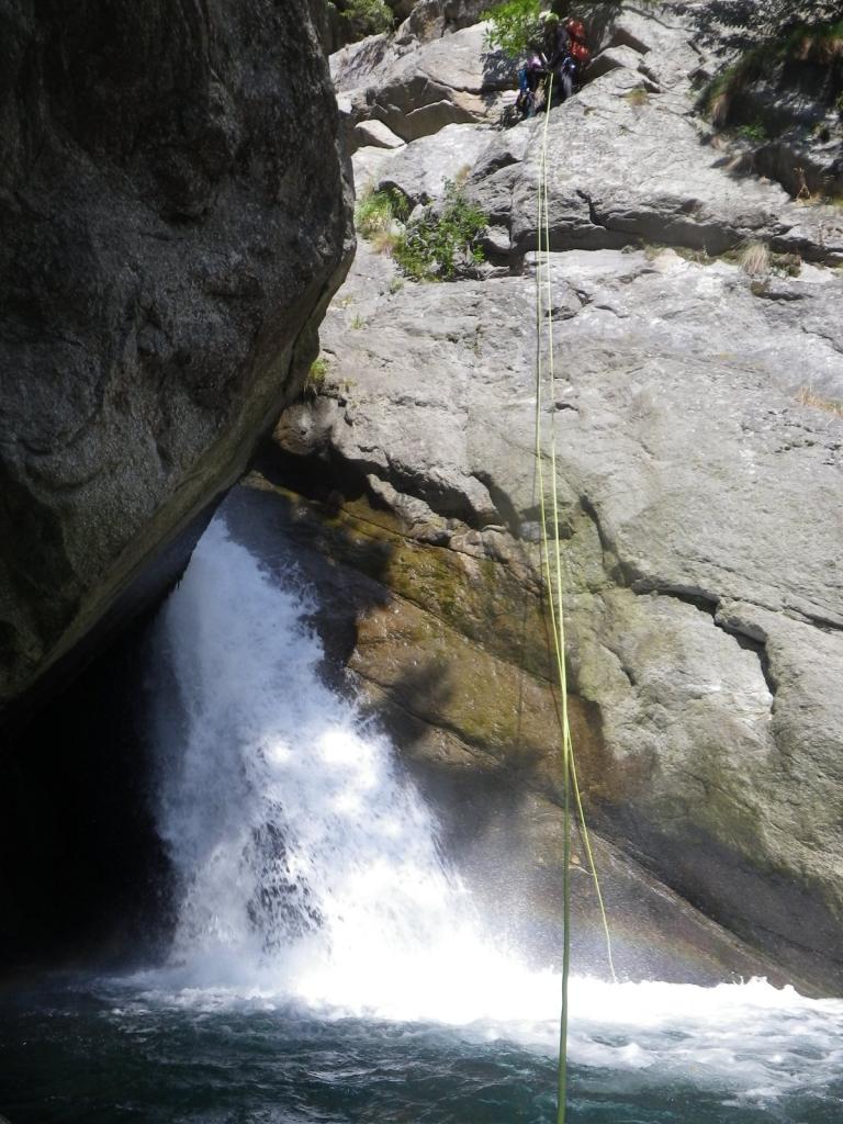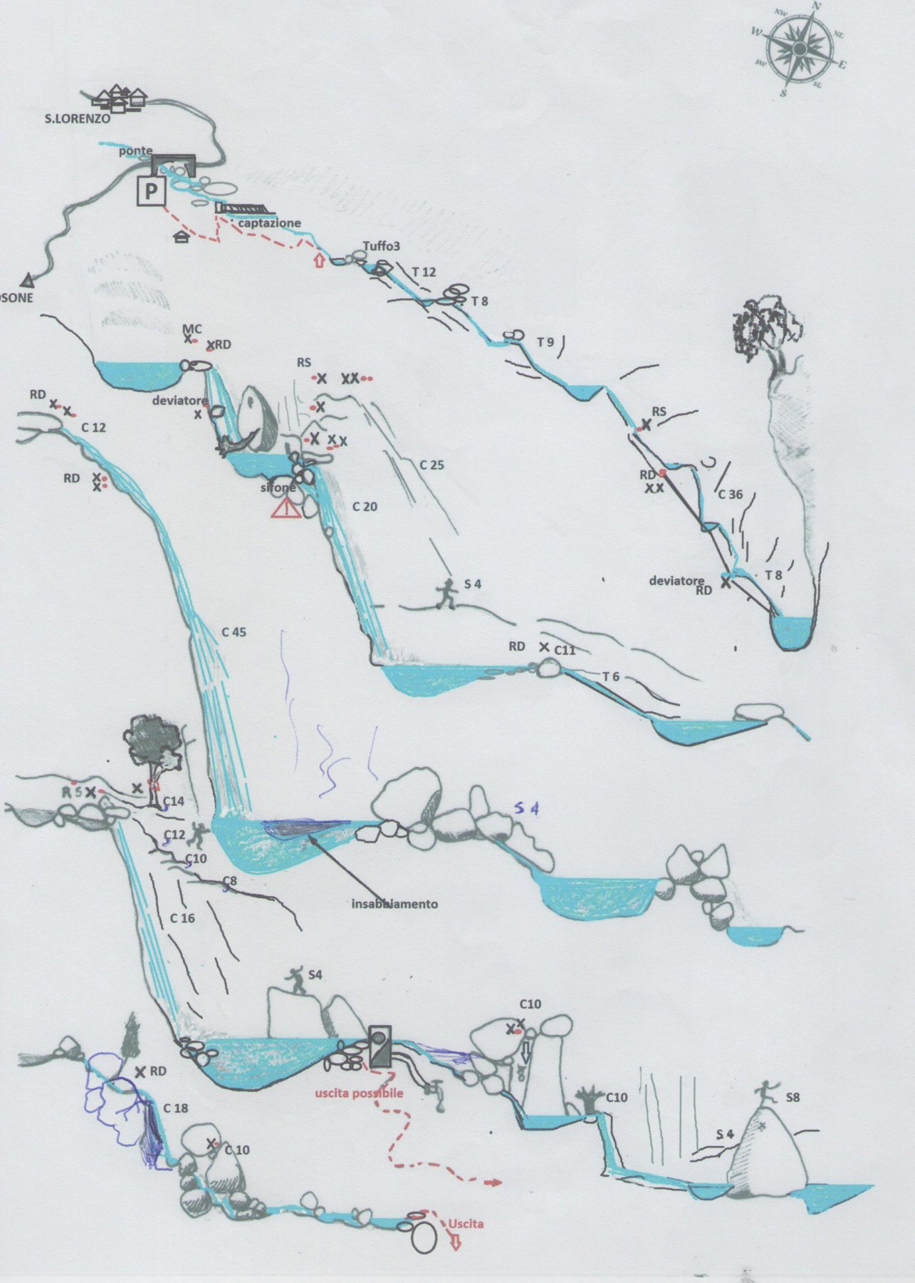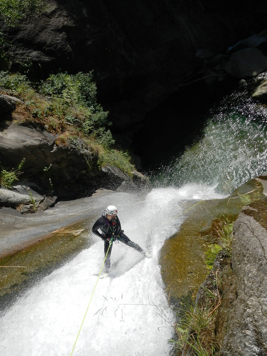 Si entra nella parte ben inforrata con calate che aumentano di verticalita’ scendendo, alternate da bei laghetti pensili. si arriva ad una stupenda C 45 preceduta da un mancorrente di 10m. molto aperta che origina un vascone enorme, ancora una bella vasca con calata da albero (C1), tuffo possibile da varie altezze 14-10-7 possibile uscita lato dx orografico in corrispondenza di una presa d’acqua.