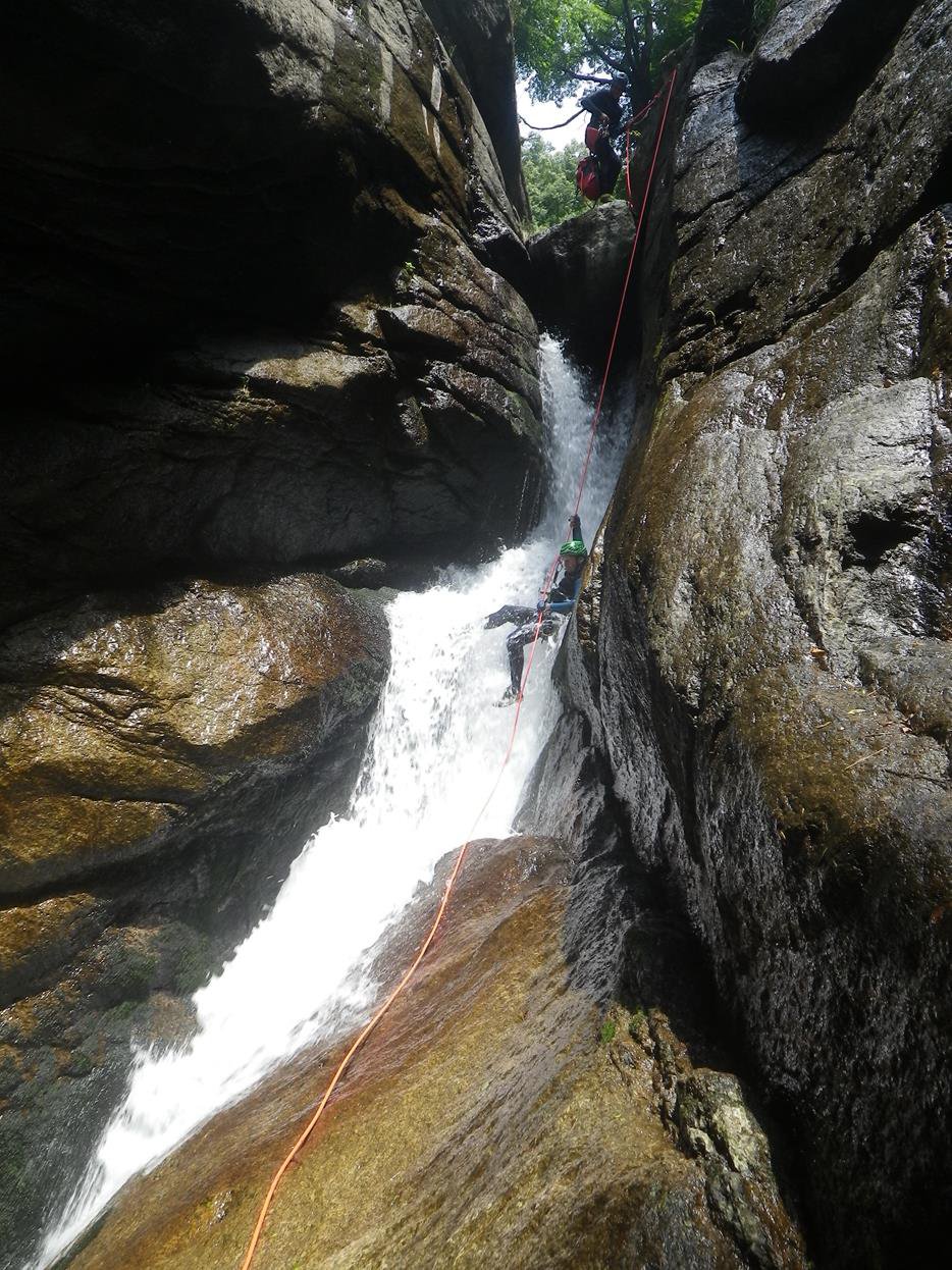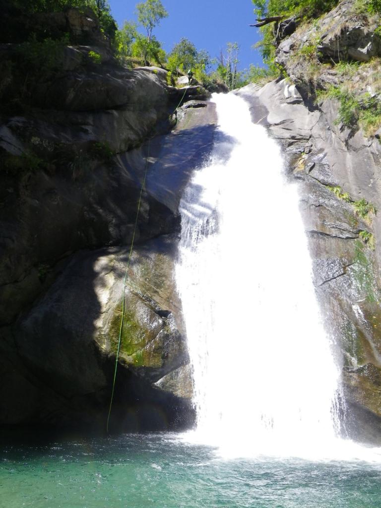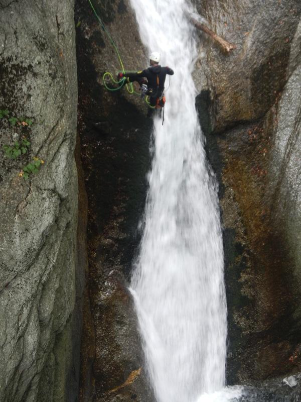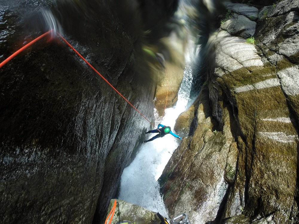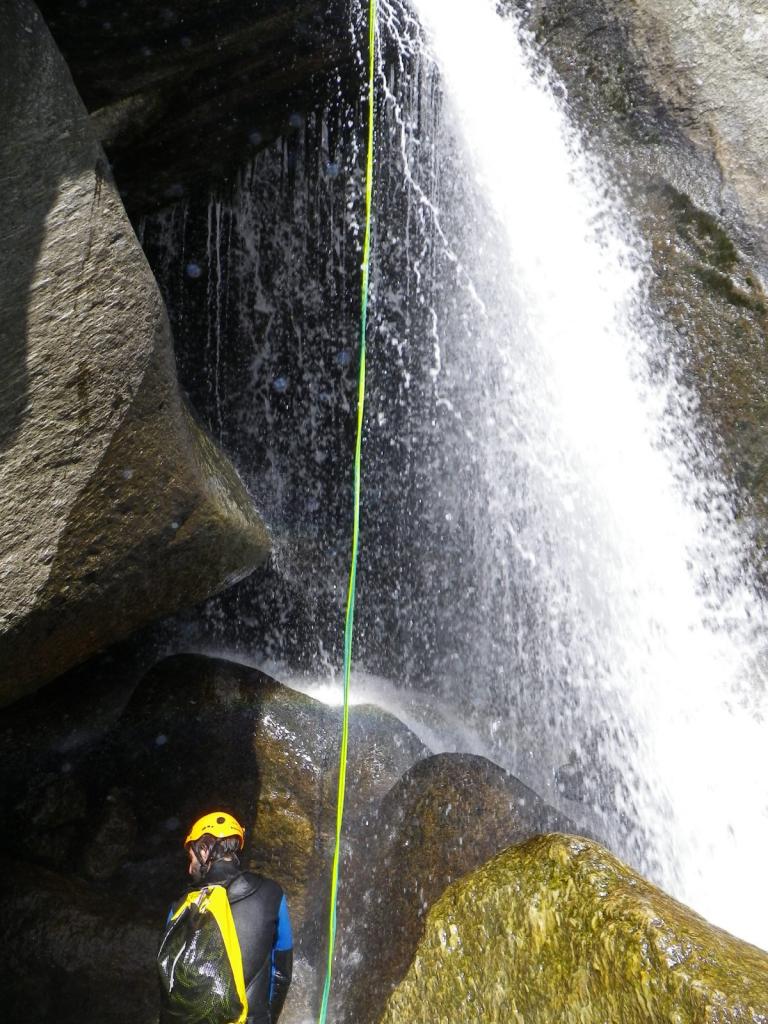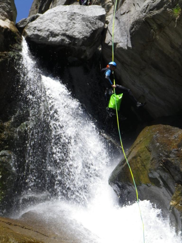 Si entra nella parte ben inforrata con calate che aumentano di verticalita’ scendendo, alternate da bei laghetti pensili. si arriva ad una stupenda C 45 preceduta da un mancorrente di 10m. molto aperta che origina un vascone enorme, ancora una bella vasca con calata da albero (C1), tuffo possibile da varie altezze 14-10-7 possibile uscita lato dx orografico in corrispondenza di una presa d’acqua.