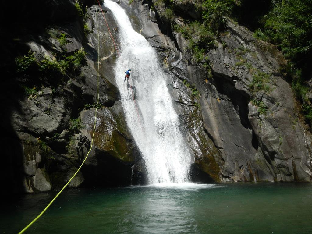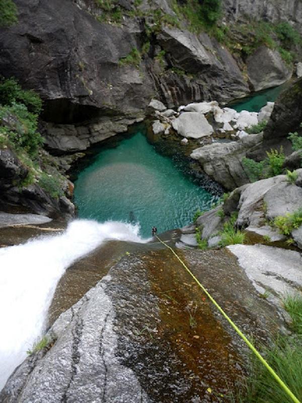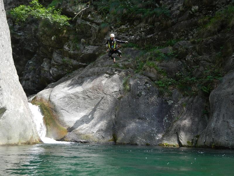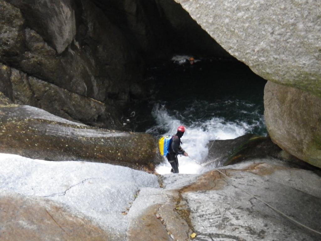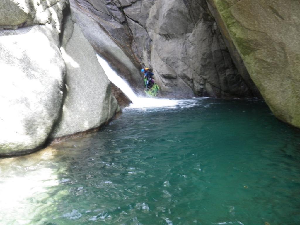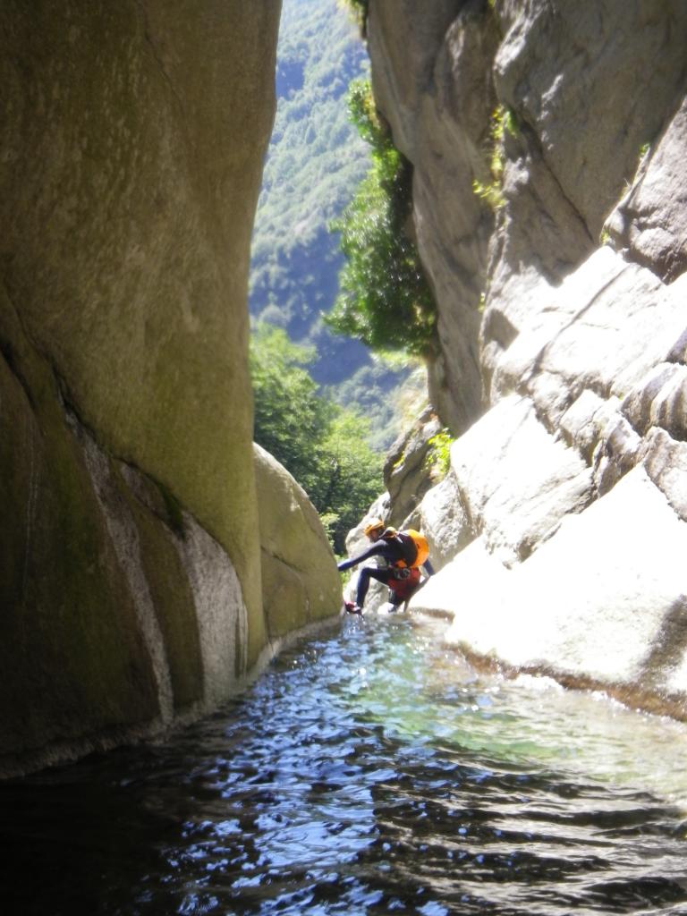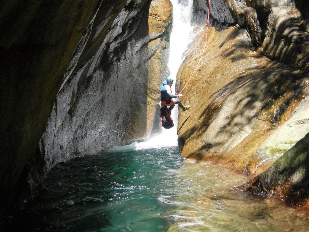 Si entra nella parte ben inforrata con calate che aumentano di verticalita’ scendendo, alternate da bei laghetti pensili. si arriva ad una stupenda C 45 preceduta da un mancorrente di 10m. molto aperta che origina un vascone enorme, ancora una bella vasca con calata da albero (C1), tuffo possibile da varie altezze 14-10-7 possibile uscita lato dx orografico in corrispondenza di una presa d’acqua.