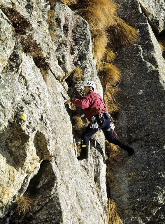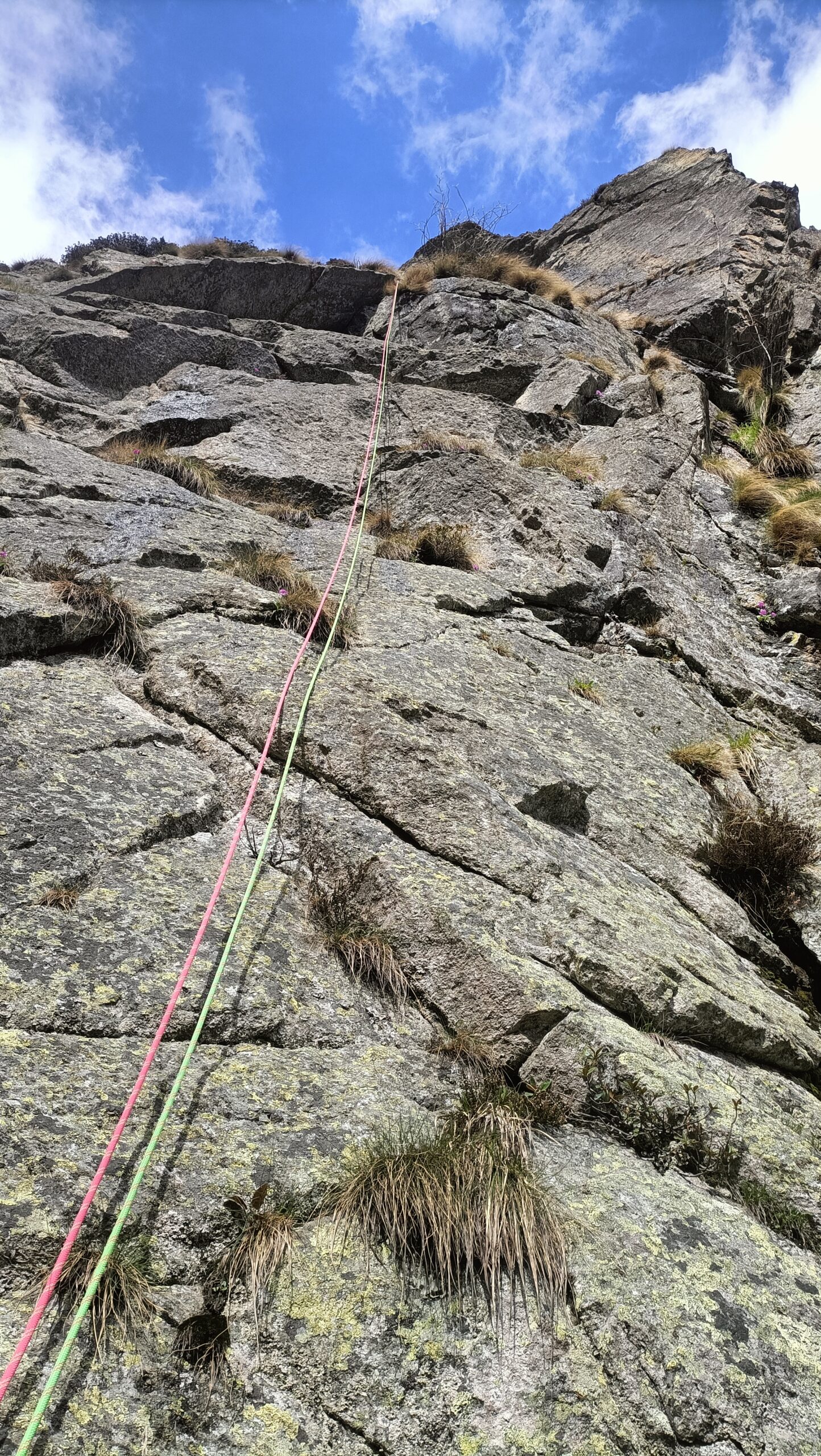 L5: spit assenti nel finale, difficile individuare la direzione. Continuare a salire rimontando poi lo spigolo, la sosta è appena sopra un terrazzino arbustoso