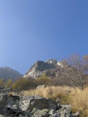 Una volta arrivati ai ruderi addossati alla parete, proseguire verso sx, salendo ancora per un po’. Si vedono due linee di spit, la via originale sale a sx. La traccia gpx presente nelle relazioni precedenti porta esattamente alla base.