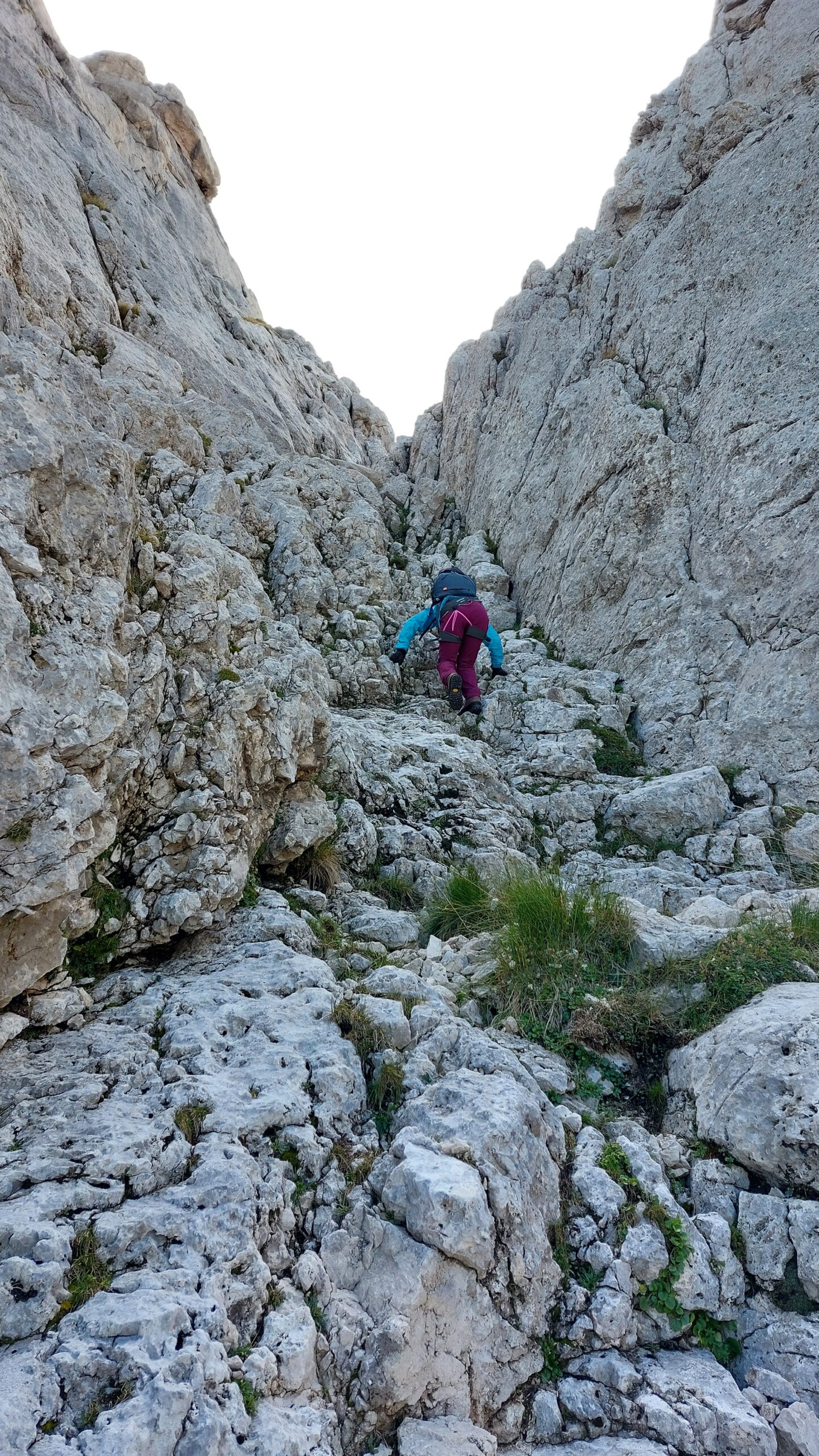 Seguendo il pendio (faticoso e ghiaioso) si incontrano prima i segni della via Normale da Sud al Corno Piccolo e poi quelli della ferrata Danesi.
