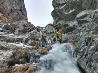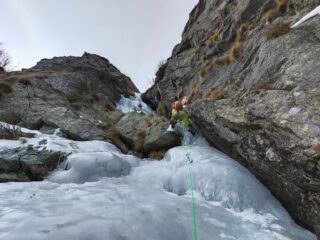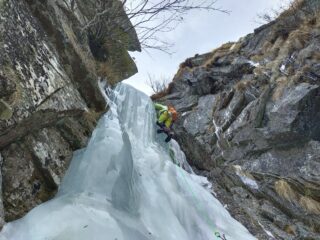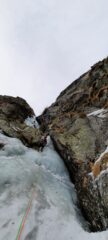 Da S2 c’è la possibilità di salire tutto a sx e portarsi alla base della evidente colata alta circa 35 m. e ad occhio grado 3 per uscire poi per il canale a sx.