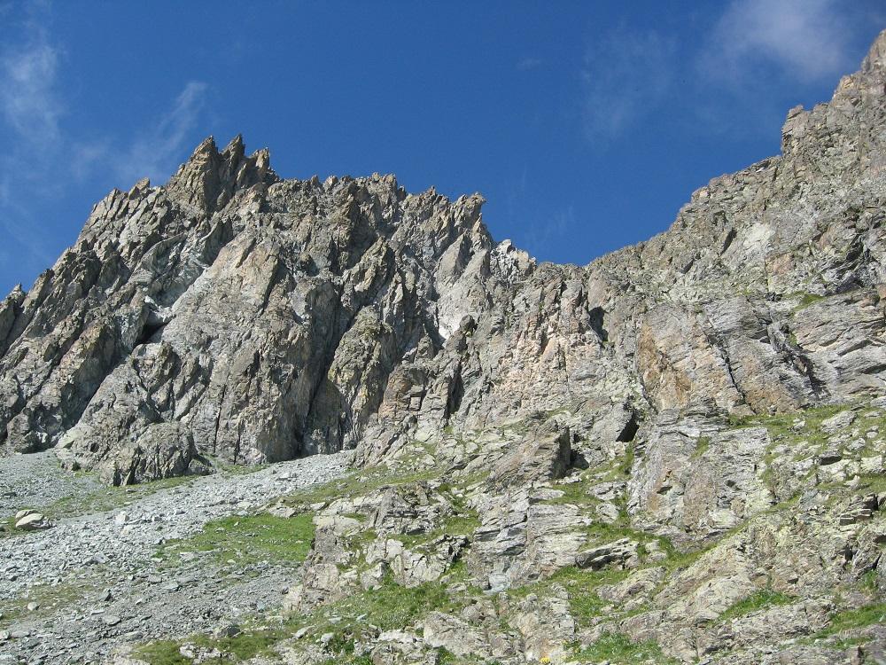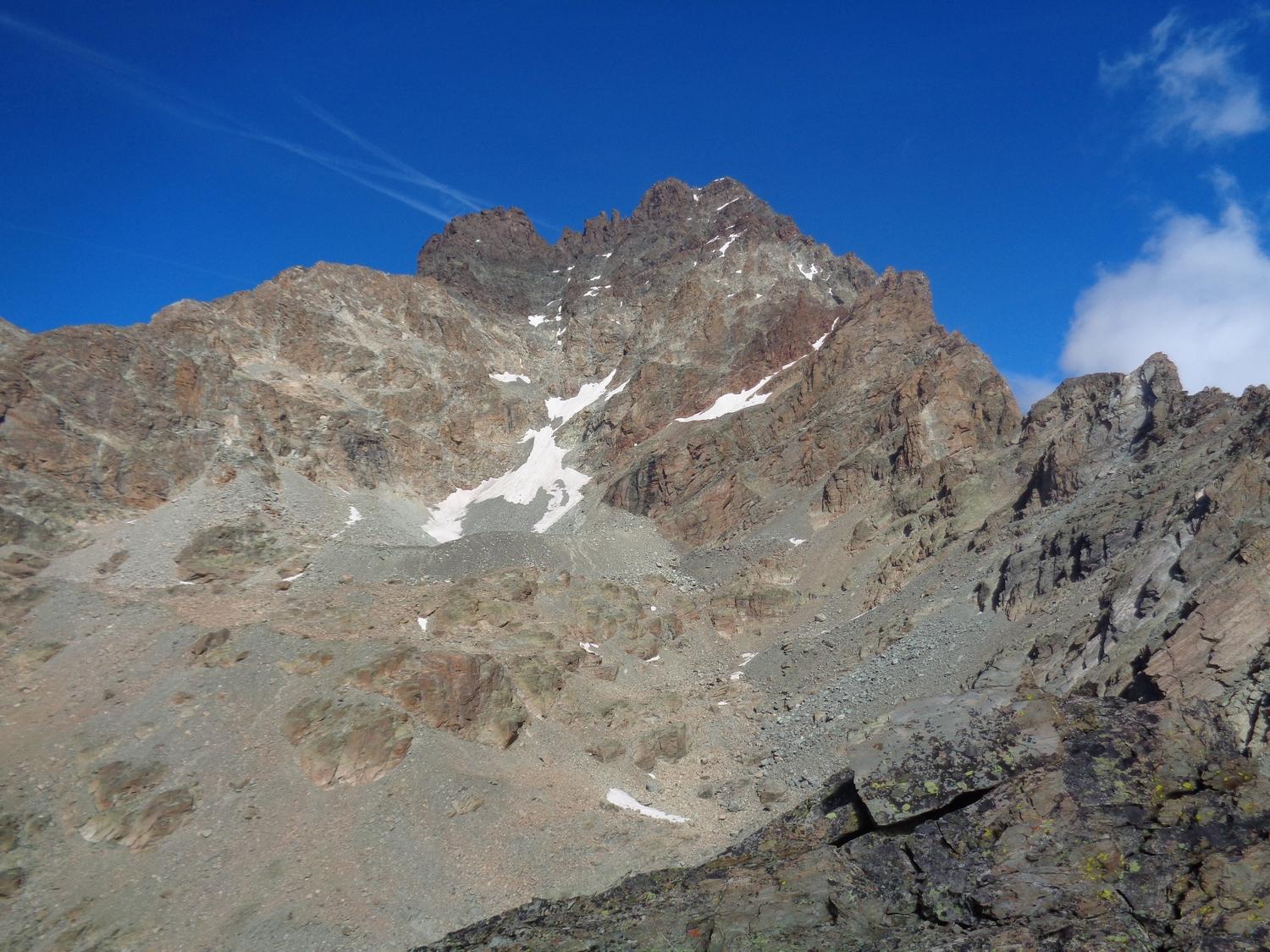 Sul passo si inizia la salita seguendo sulla sx prima una labile traccia che presto scompare e tenendosi sul lato Varaita si attraversano ripidi canali detritici e salti rocciosi fino sulla cima.