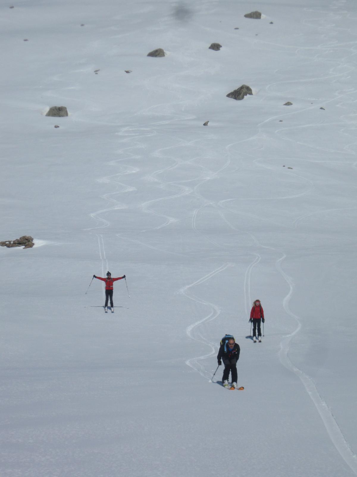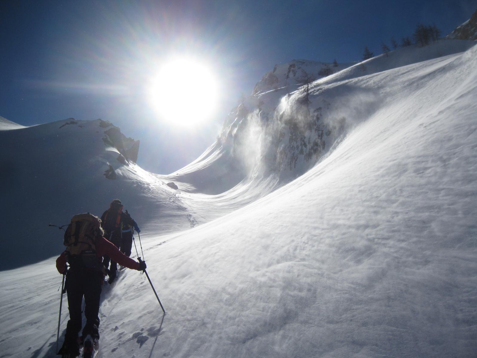 Bella polvere nella parte alta (nord)e trasformata nella parte iniziale,bollente sud, vento forte dai 2400 in su, si spinge non poco nella parte mediana Dell’ itinerario. Pendii sommitali sostenuti ma neve comunque sicura, accumuli evitabili!