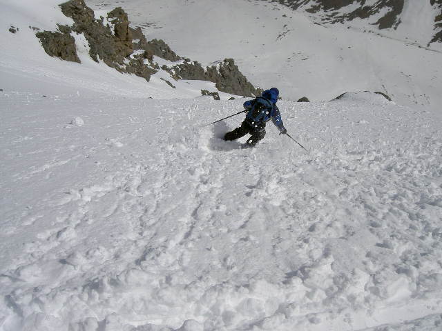 Da qui parte la discesa, dapprima un canale appena accennato (45°, poi 45°-50°, poi nuovamente 45°). Ad una strozzatura il pendio si fa più ripido (50°) fino ad un traverso a sn. in un canale parallelo (45°) che si segue fino a quando questo si ricongiunge col canalino principale, interrotto da alcuni salti. Gli ultimi 200 m. sono a 40°-45°, poi 40°, lineari fino alla conoide.